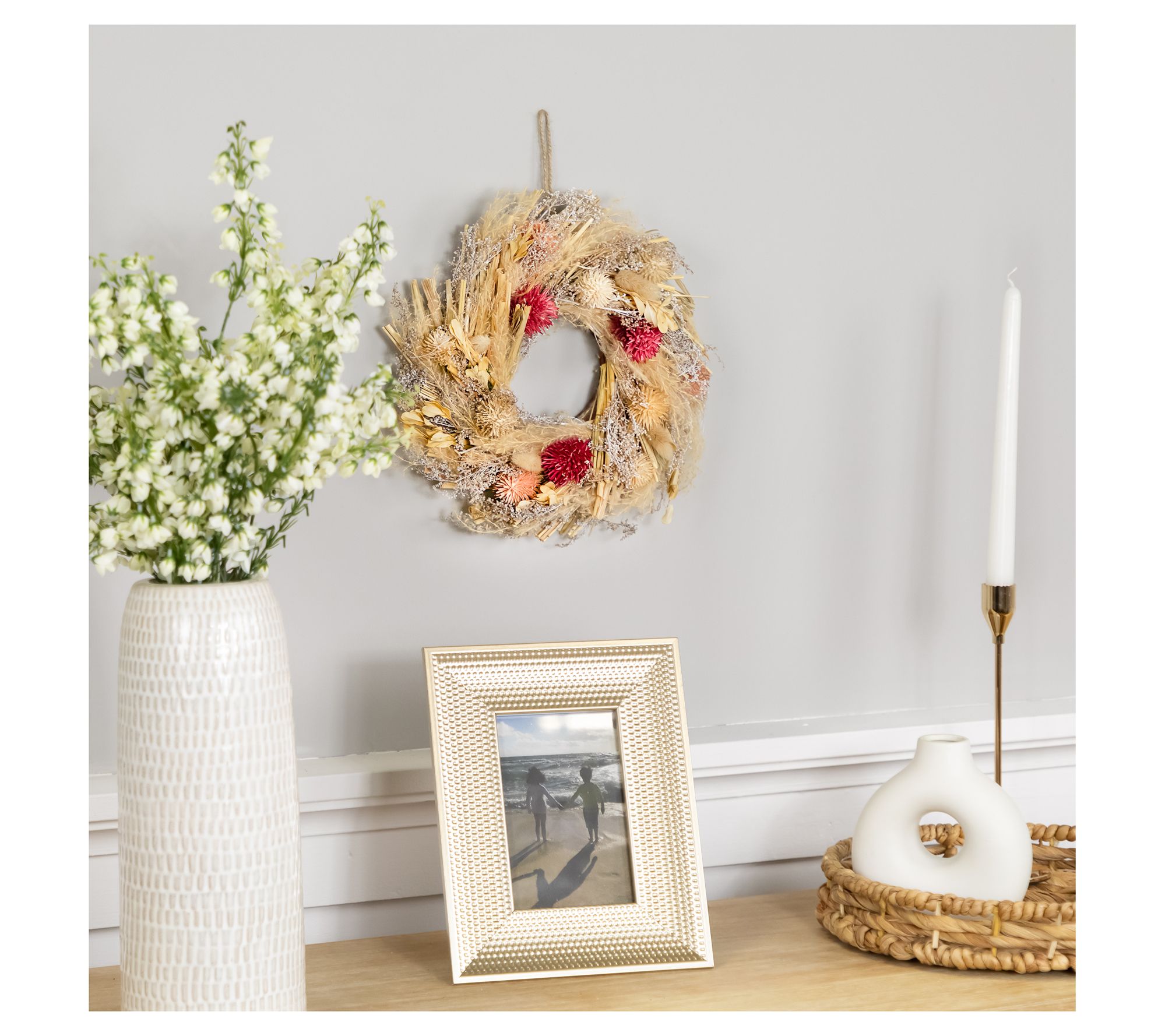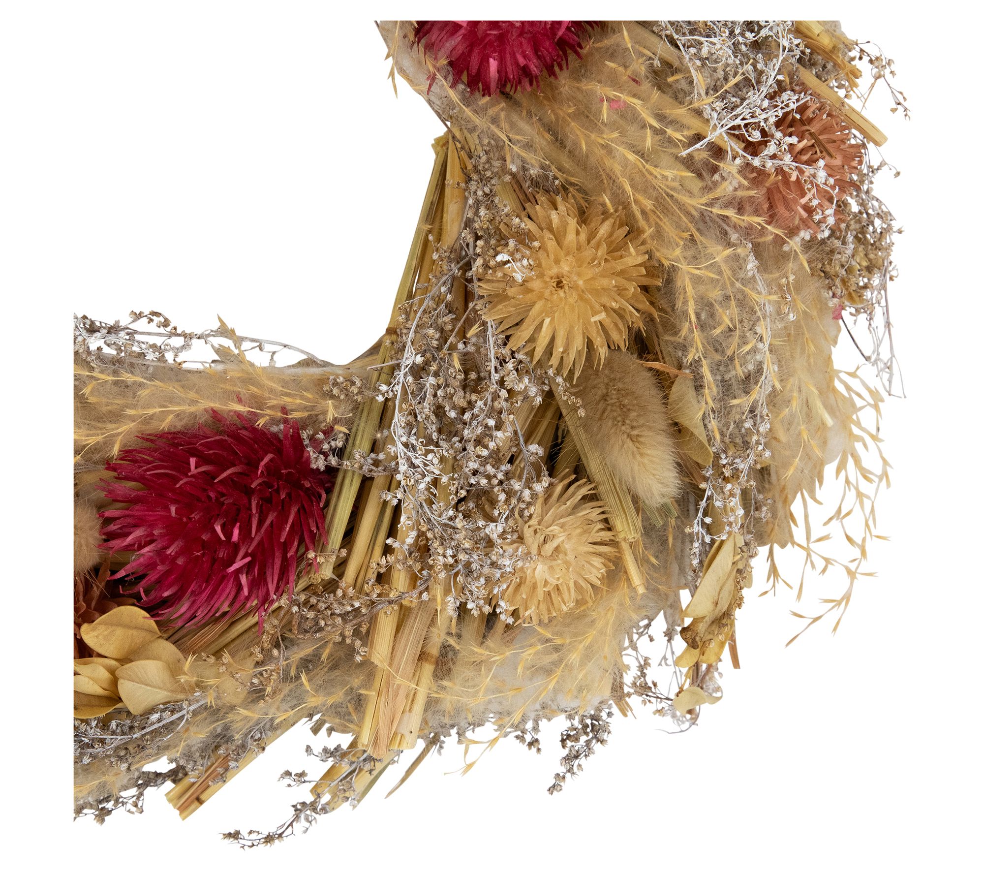 Warm up your entryway or mantel with a fall harvest floral wreath, where pampas grass, wheat, barley, and delicate dried blooms create a welcoming scene in gentle reds, pinks, and beiges. This inviting piece adds a hint of rustic elegance to your home and arrives ready to hang for effortless seasonal decorating. From Northlight.