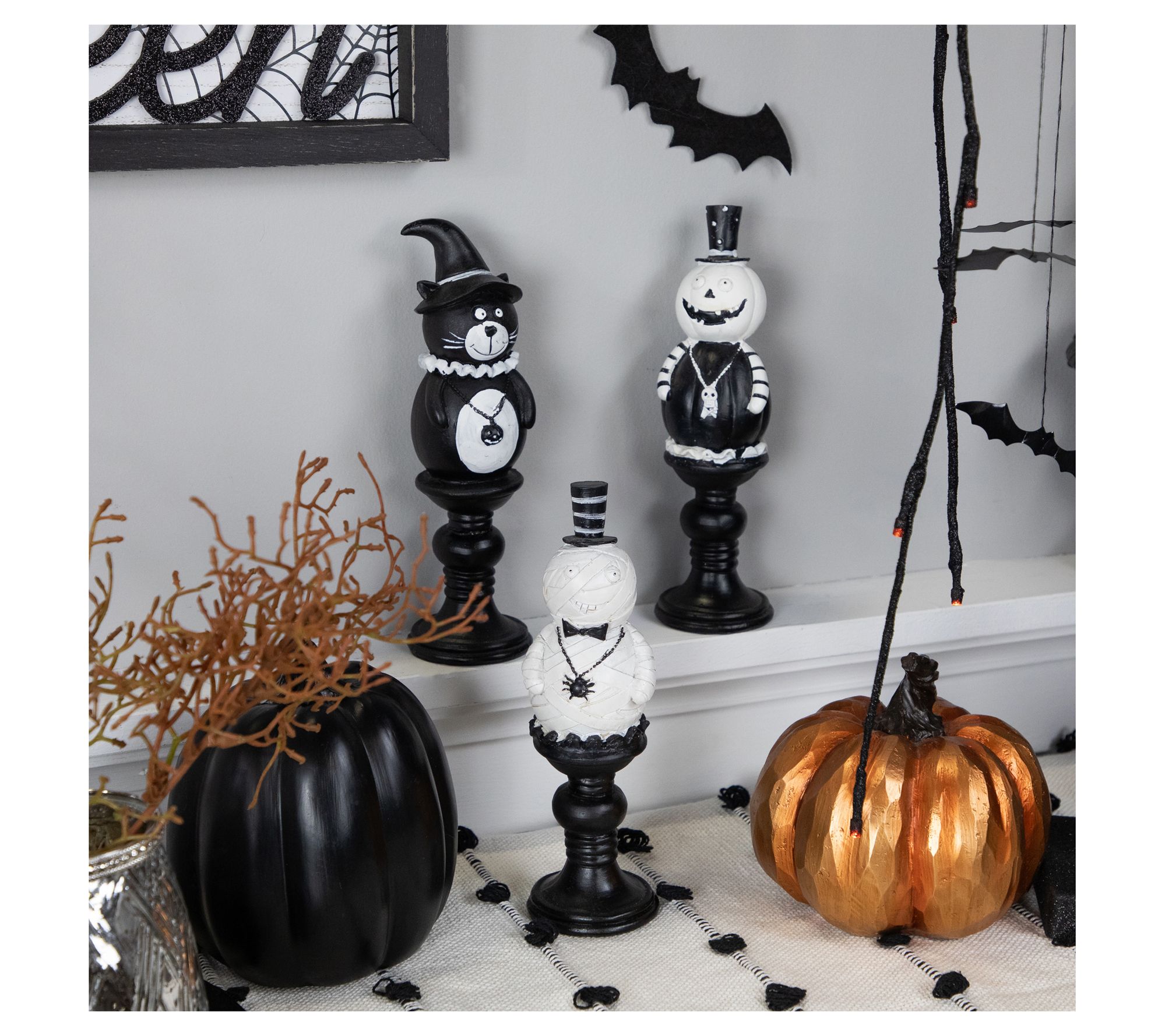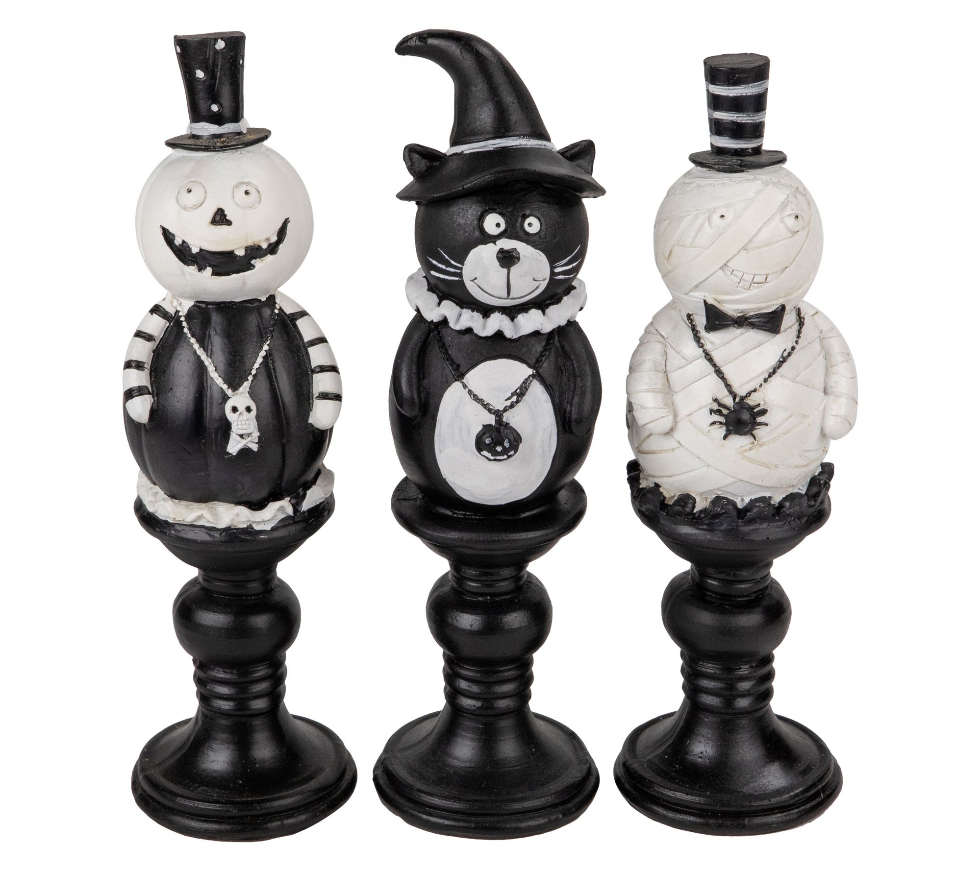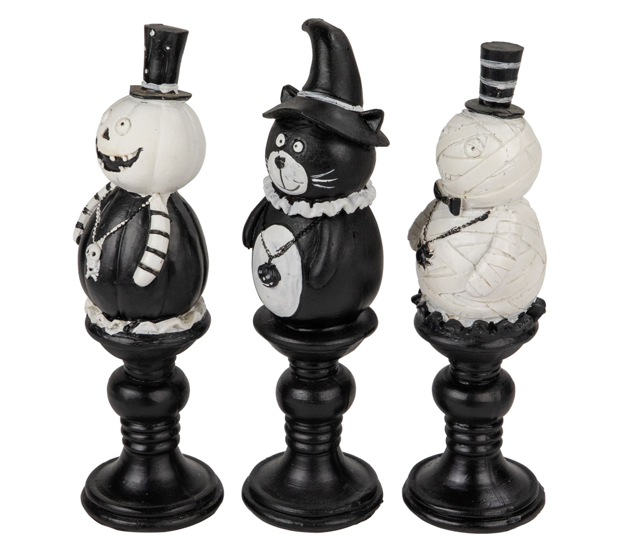 Make Halloween even more delightful with this set of candlestick decorations featuring a pumpkin, ghost, and black cat, each dressed up with festive hats and pendants. These playful accents instantly bring personality to your mantel, table, or shelf -- anywhere you want to add that spooky seasonal charm. From Northlight.