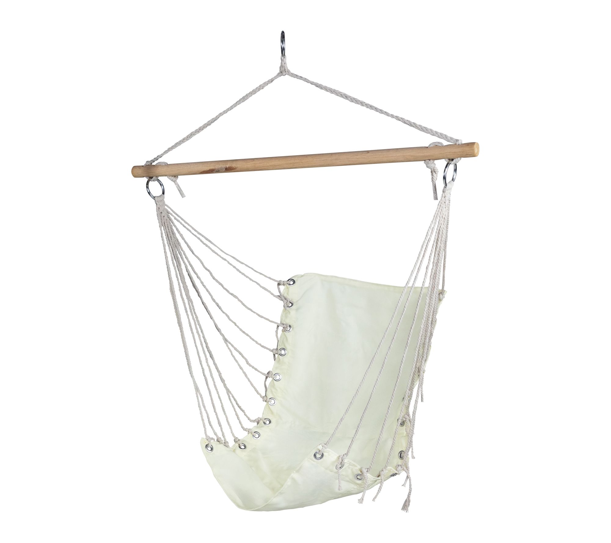 Bring peaceful comfort to your patio or garden with this hammock chair. Whether you're enjoying a morning coffee, reading a favorite book, or catching the sunset, its cream-colored seat and sturdy wooden bar create an inviting space to unwind. Hang it from a metal frame or between trees for an effortless retreat. From Northlight.
