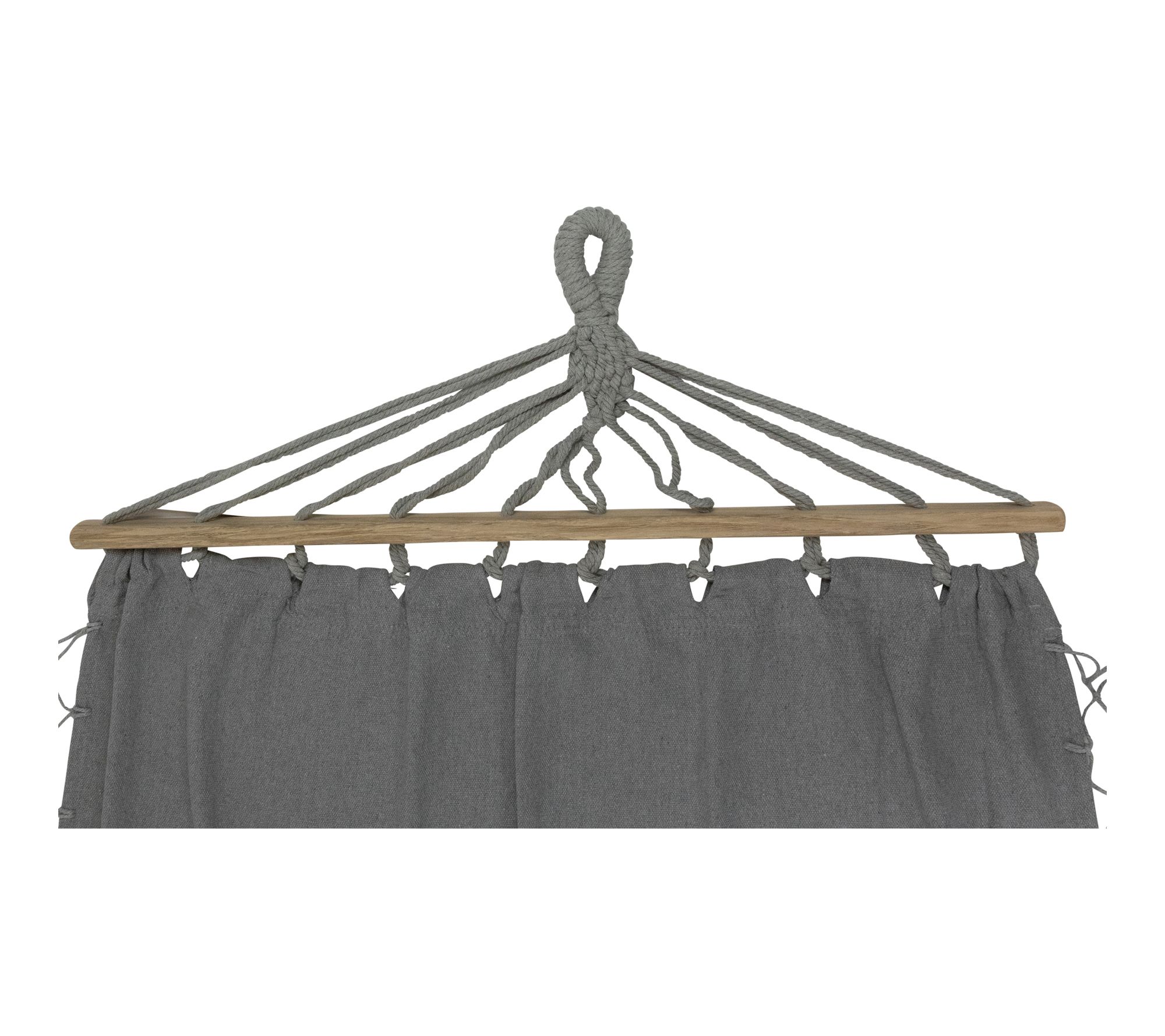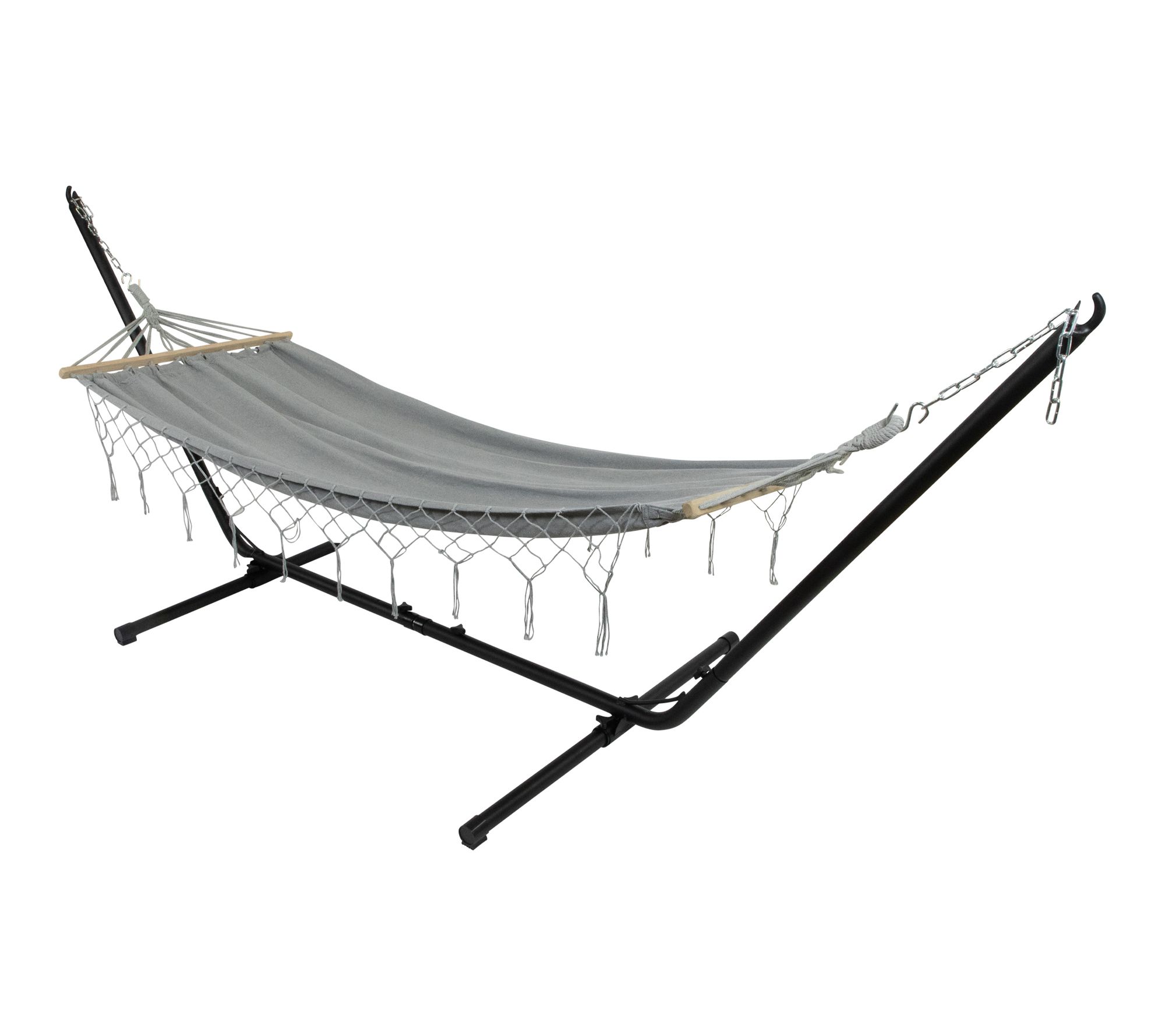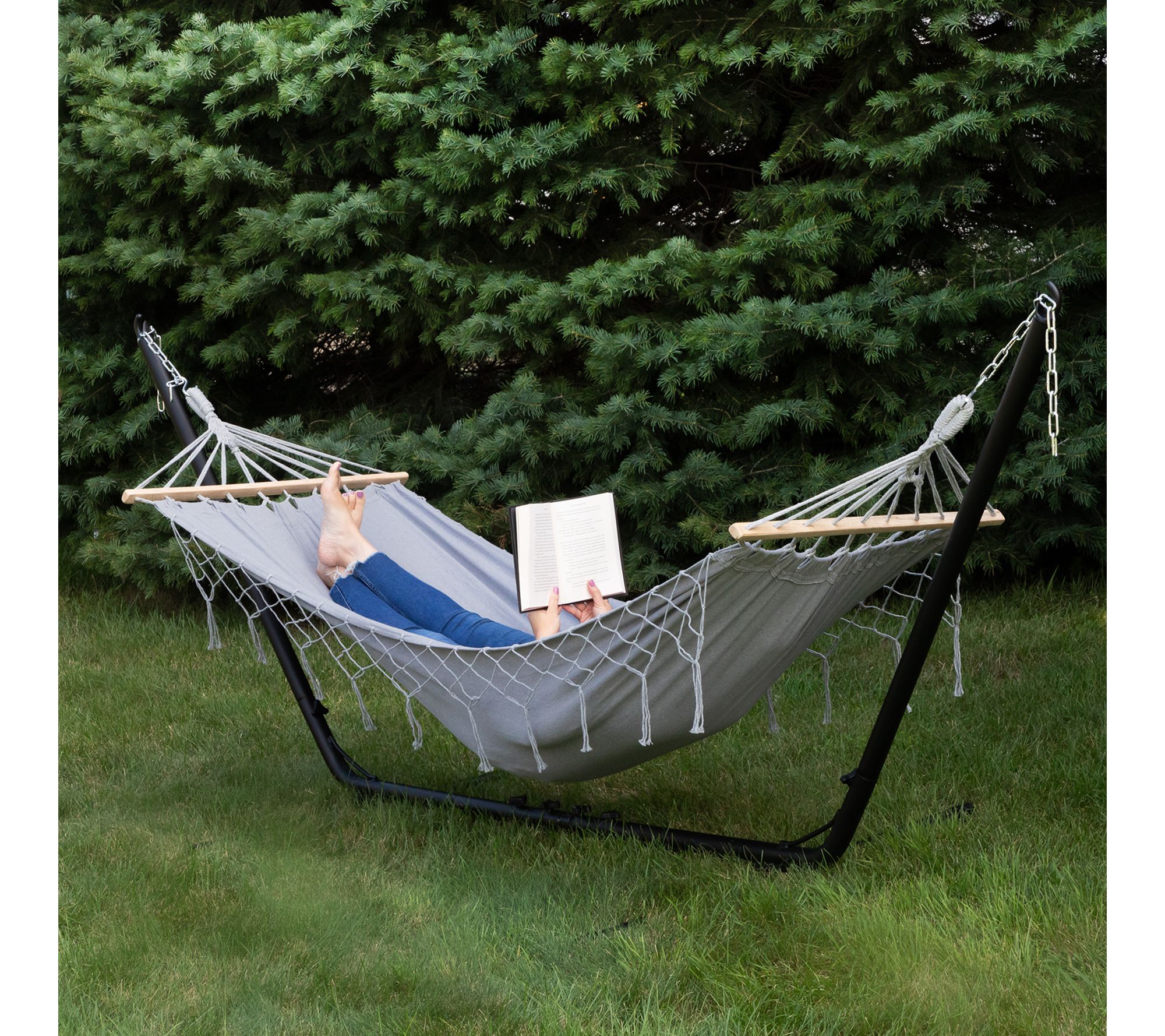 Relax under the open sky with this inviting hammock, featuring netted fringe details and sturdy wooden bars that add a touch of charm to your outdoor space. Whether you're unwinding with a book or catching an afternoon nap, its generous size offers plenty of room to stretch out and enjoy the breeze. From Northlight.