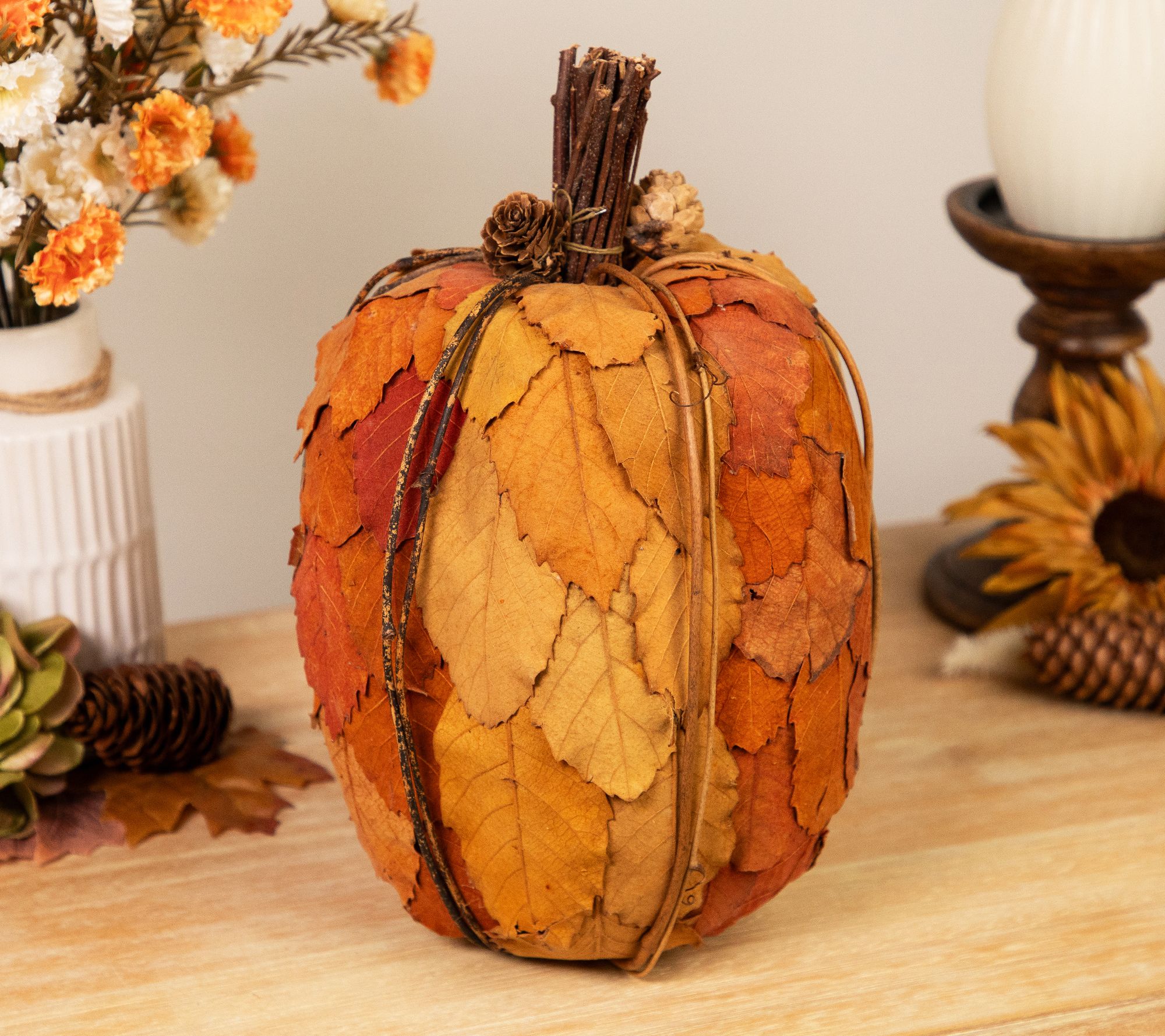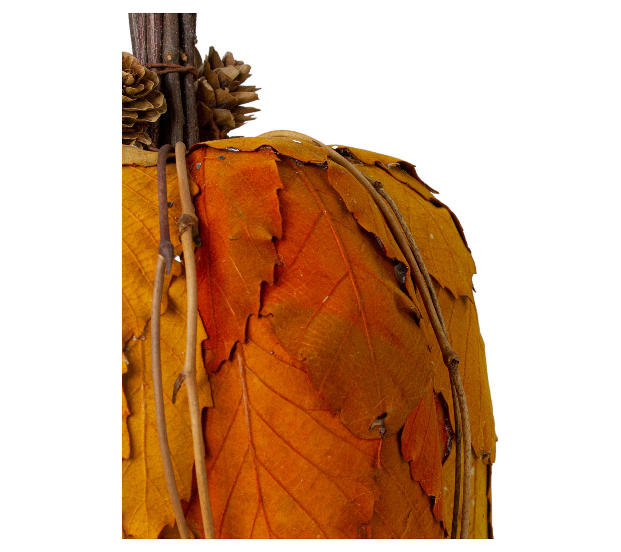 • Artificial tabletop pumpkin with layered two-tone orange fall leaves, pinecones, and twigs