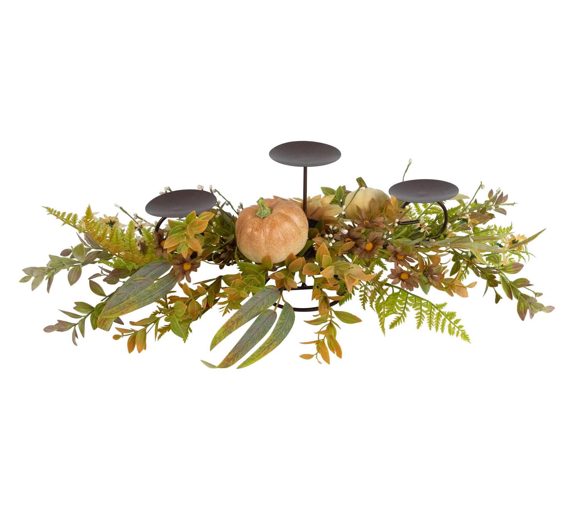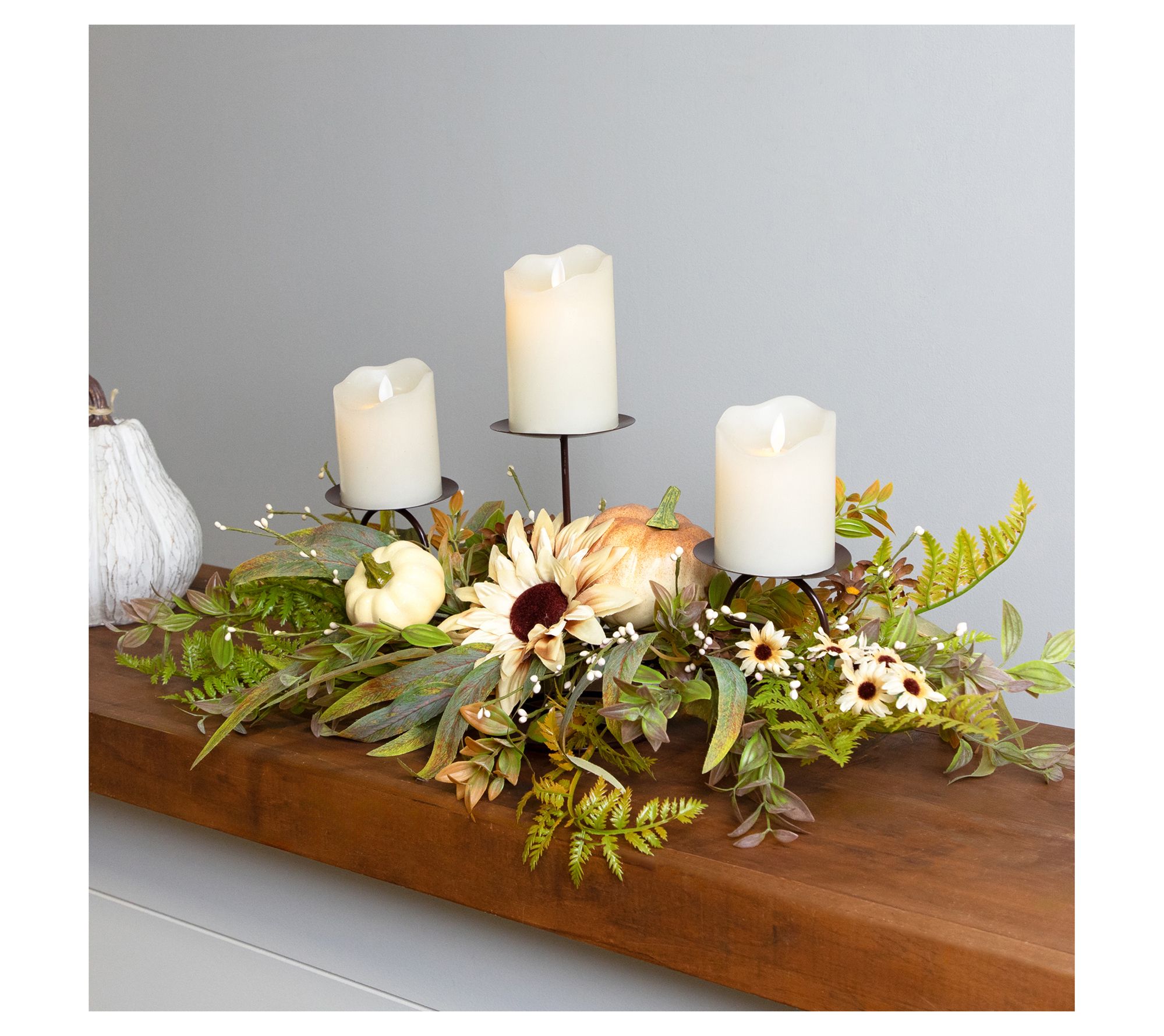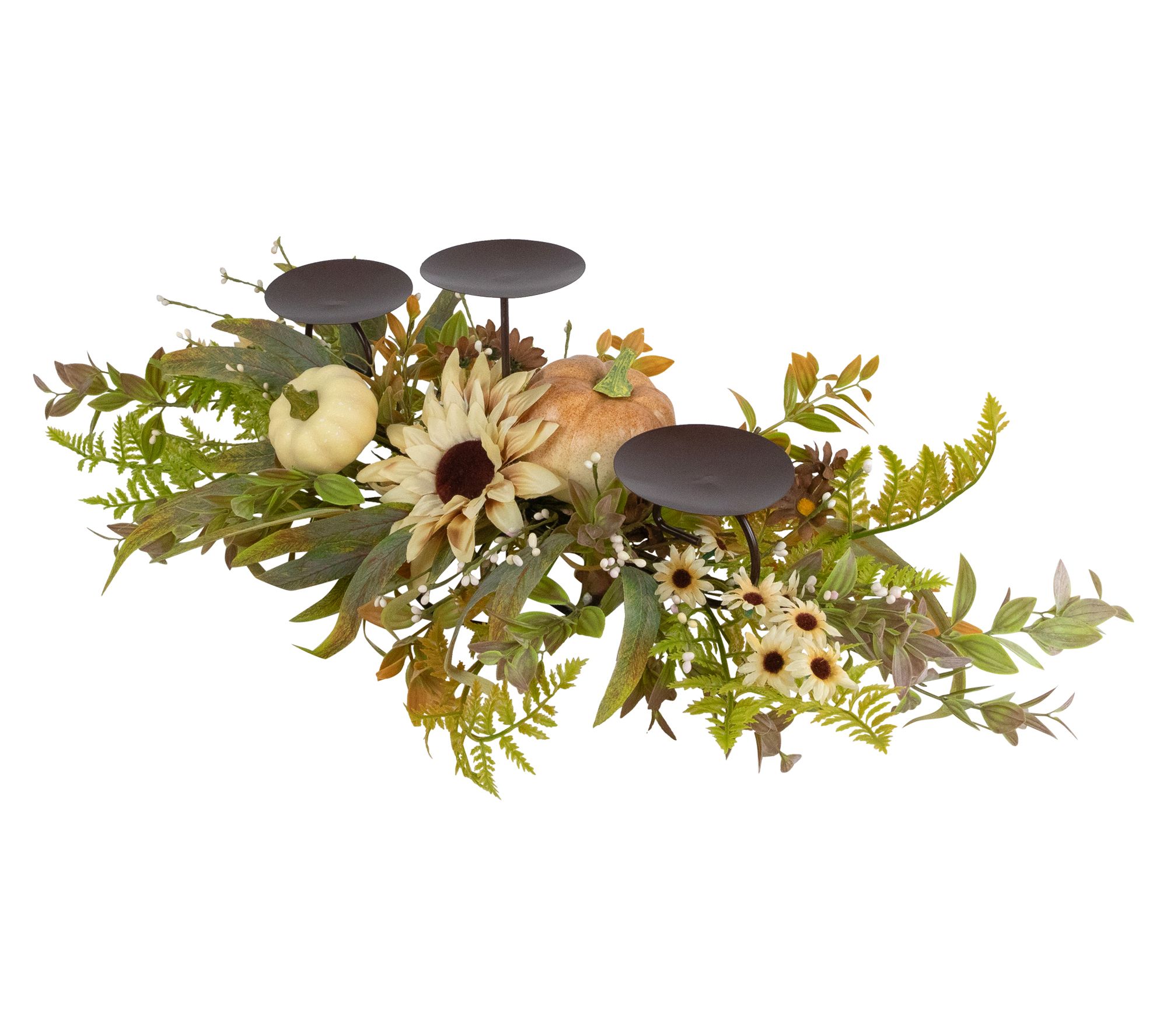 As you gather friends and family around the table, this harvest triple candle holder brings warm, inviting color to autumn get-togethers. Its tiered design displays an artful mix of fall foliage, a bright sunflower, and cheerful pumpkins, setting the scene for cozy dinners or festive centerpieces. From Northlight.