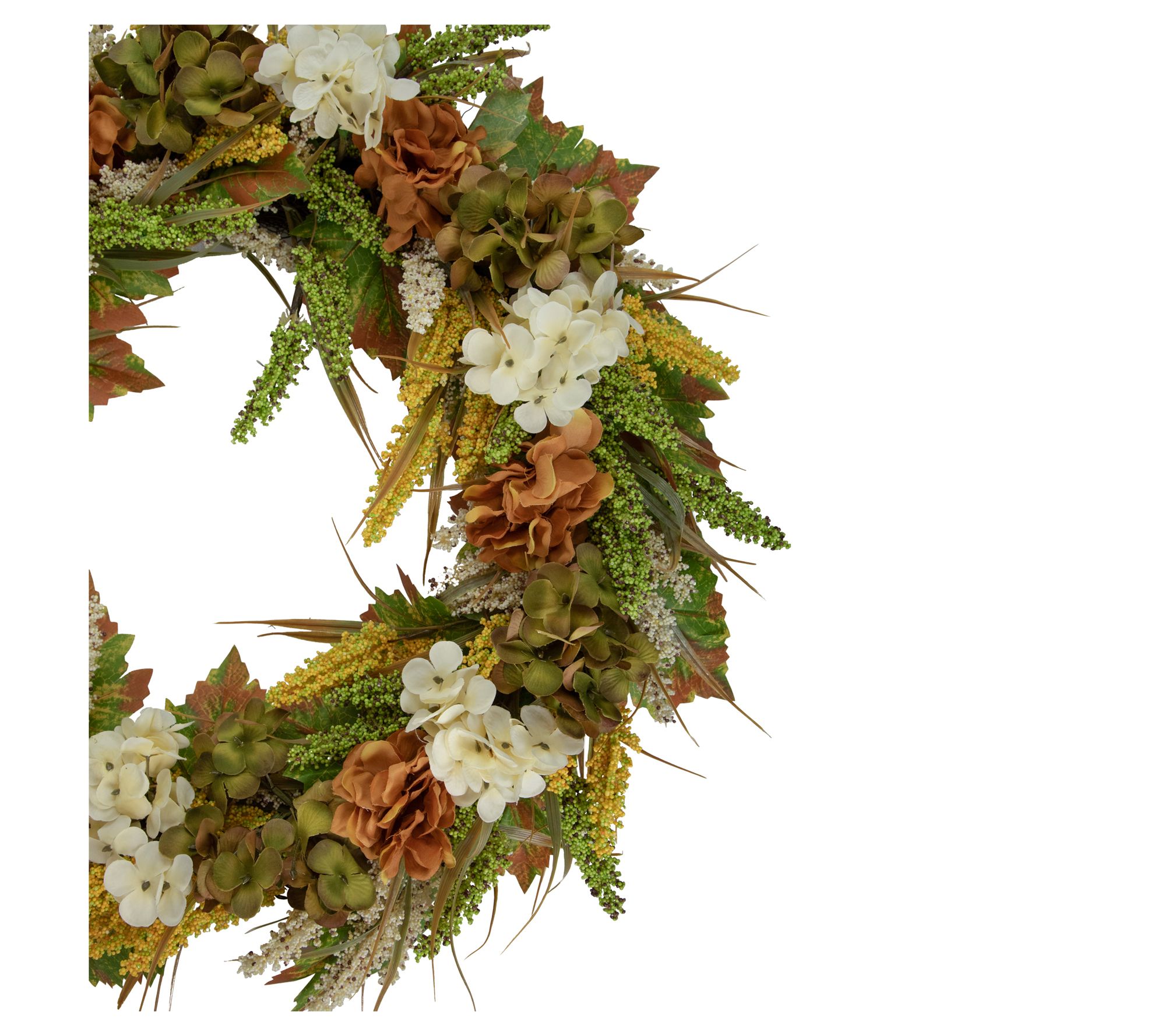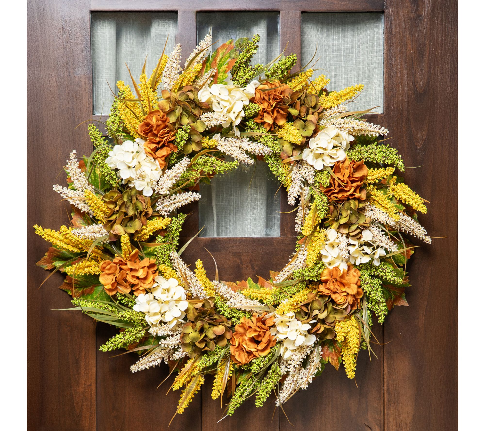• Features white, orange, and green hydrangeas with wheat and green foliage