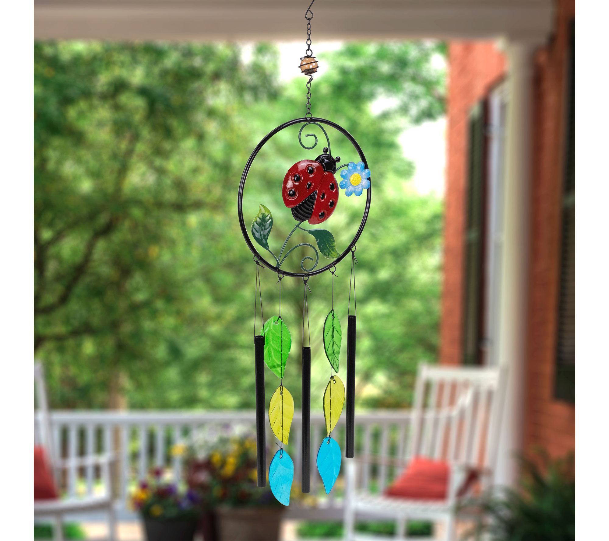 Let your outdoor retreat sing with gentle melody as the breeze dances through this ladybug dreamcatcher windchime, adorning your garden or porch with whimsy and charm. Delicate leaf and flower accents pair with three bell chimes, creating both a delightful visual and tranquil soundscape for relaxing afternoons or warm evening gatherings. From Northlight.