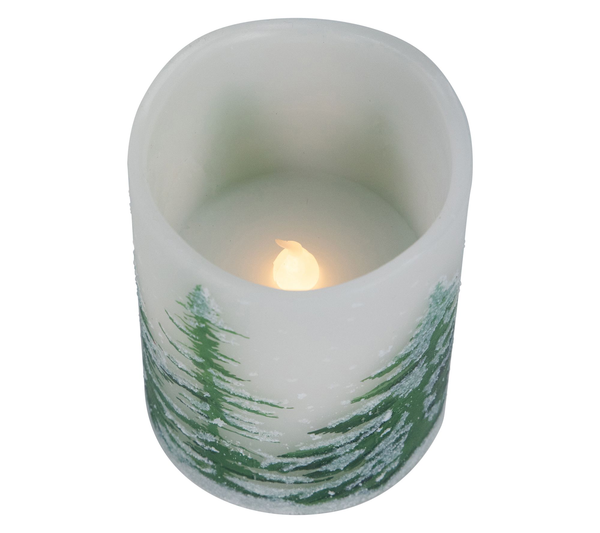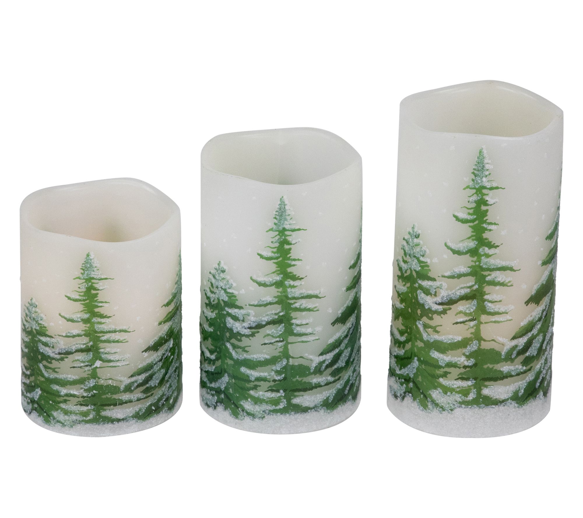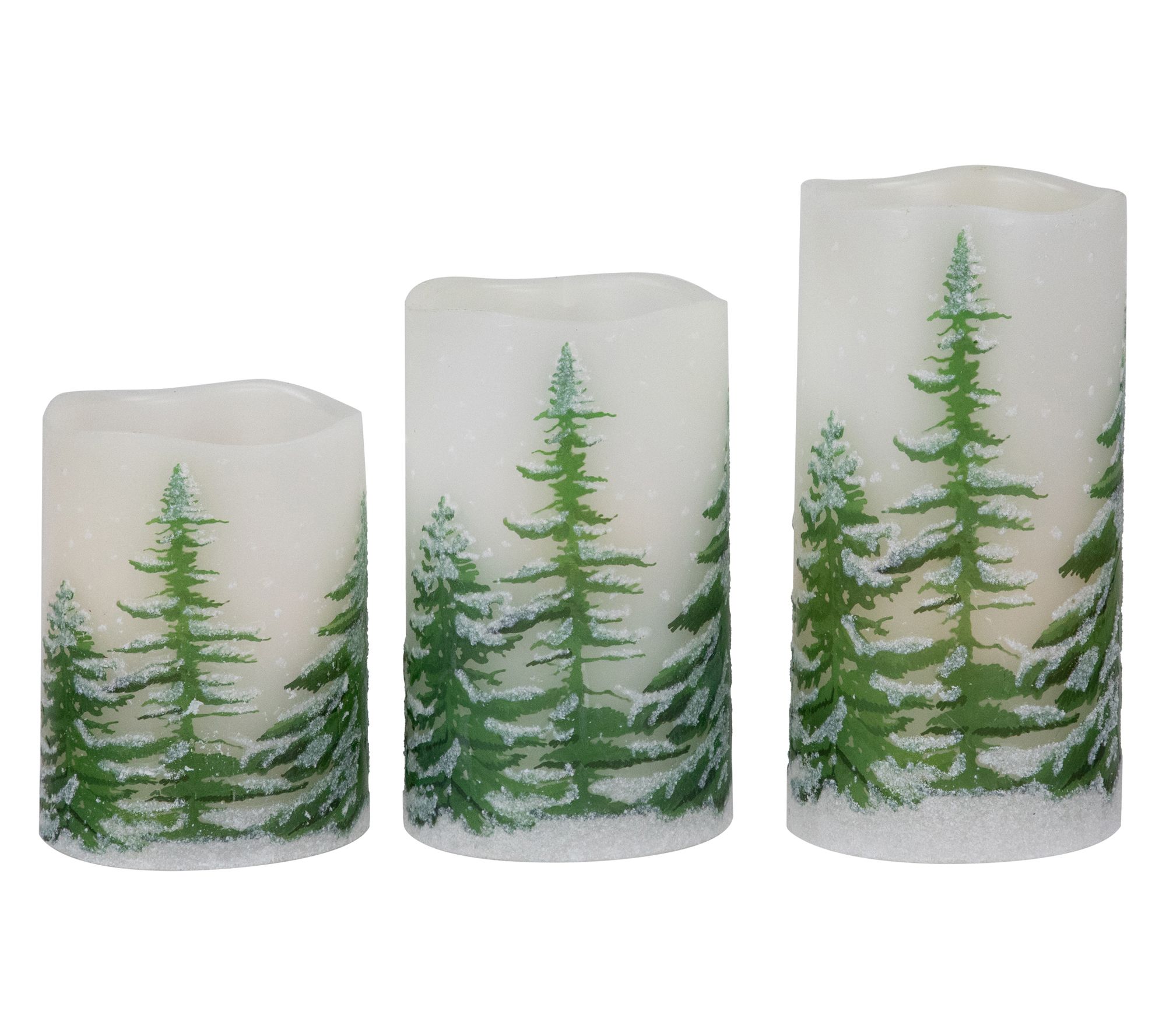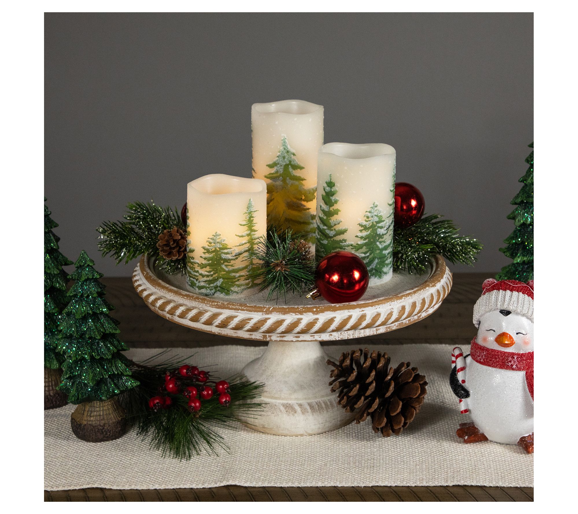 Transform your holiday decor into a picturesque winter scene with these enchanting flameless pillar candles. Nestled gracefully amidst pine trees dusted with faux snow, these pieces effortlessly replicate the cozy elegance of candles without the threat of an open flame. Their lush flicker transforms any room into a warm haven, perfect for Christmas displays or enhancing your dining table's charm. Complete with a simple on/off switch, they bring convenience and beauty in equal measure. From Northlight.