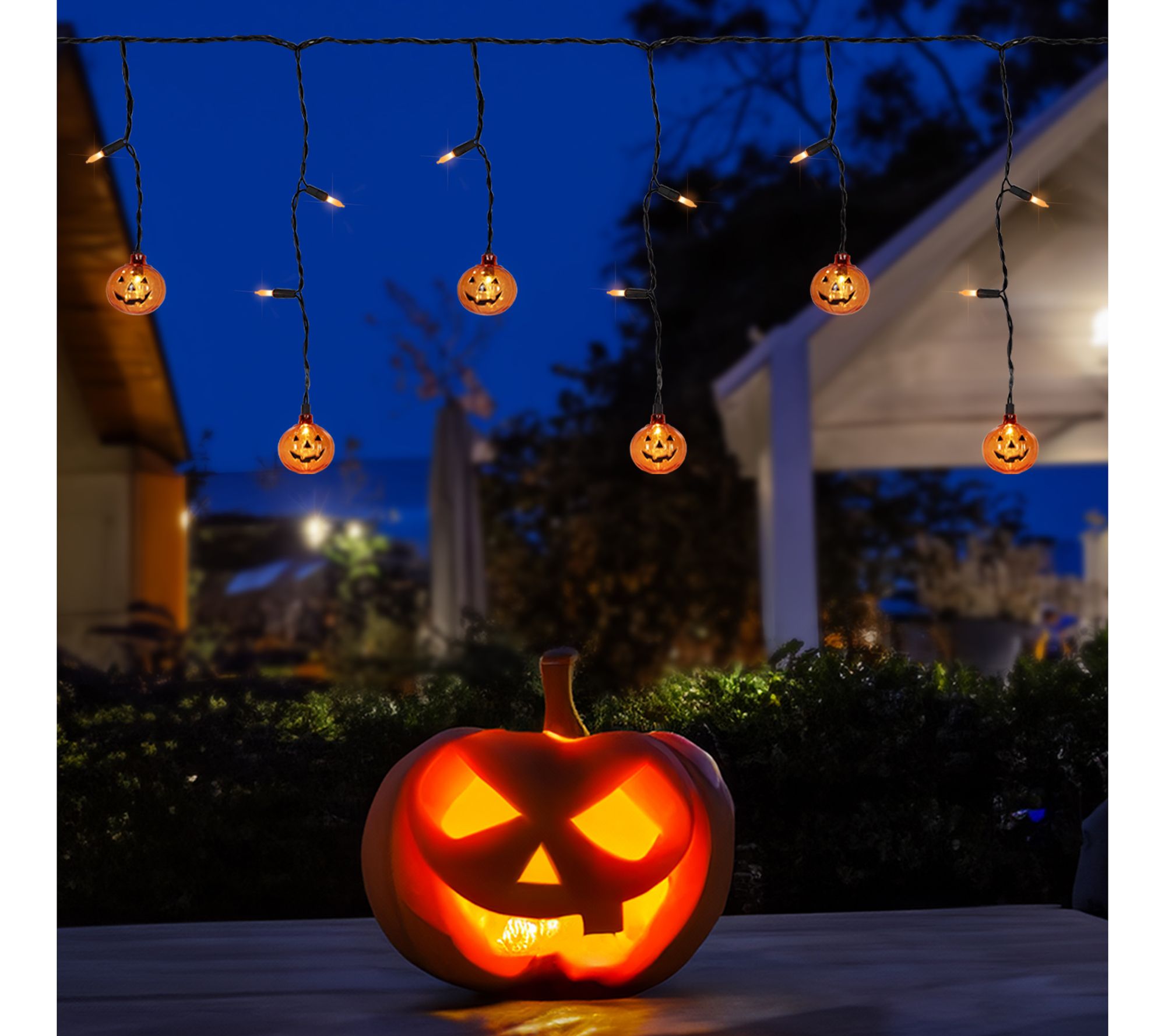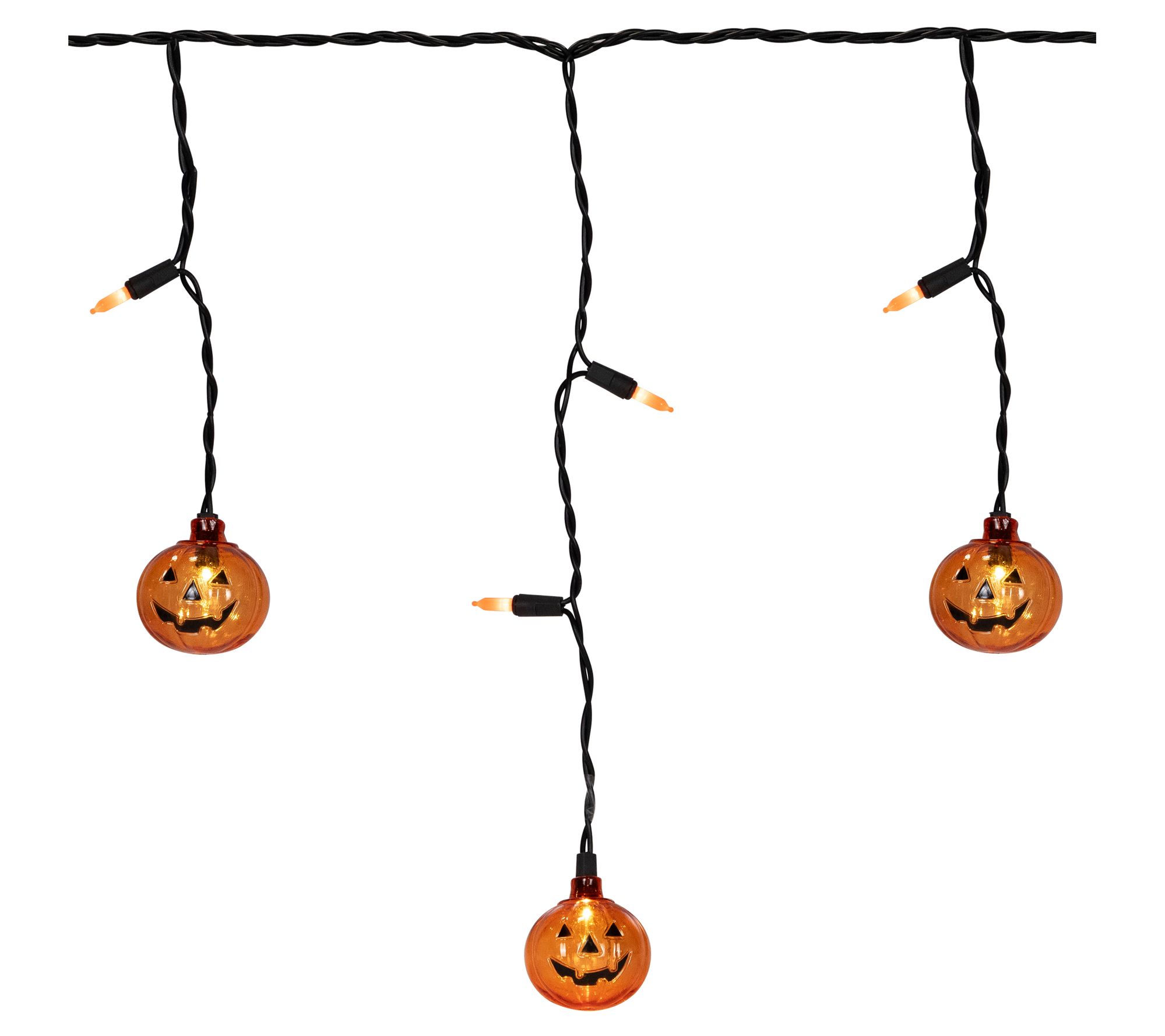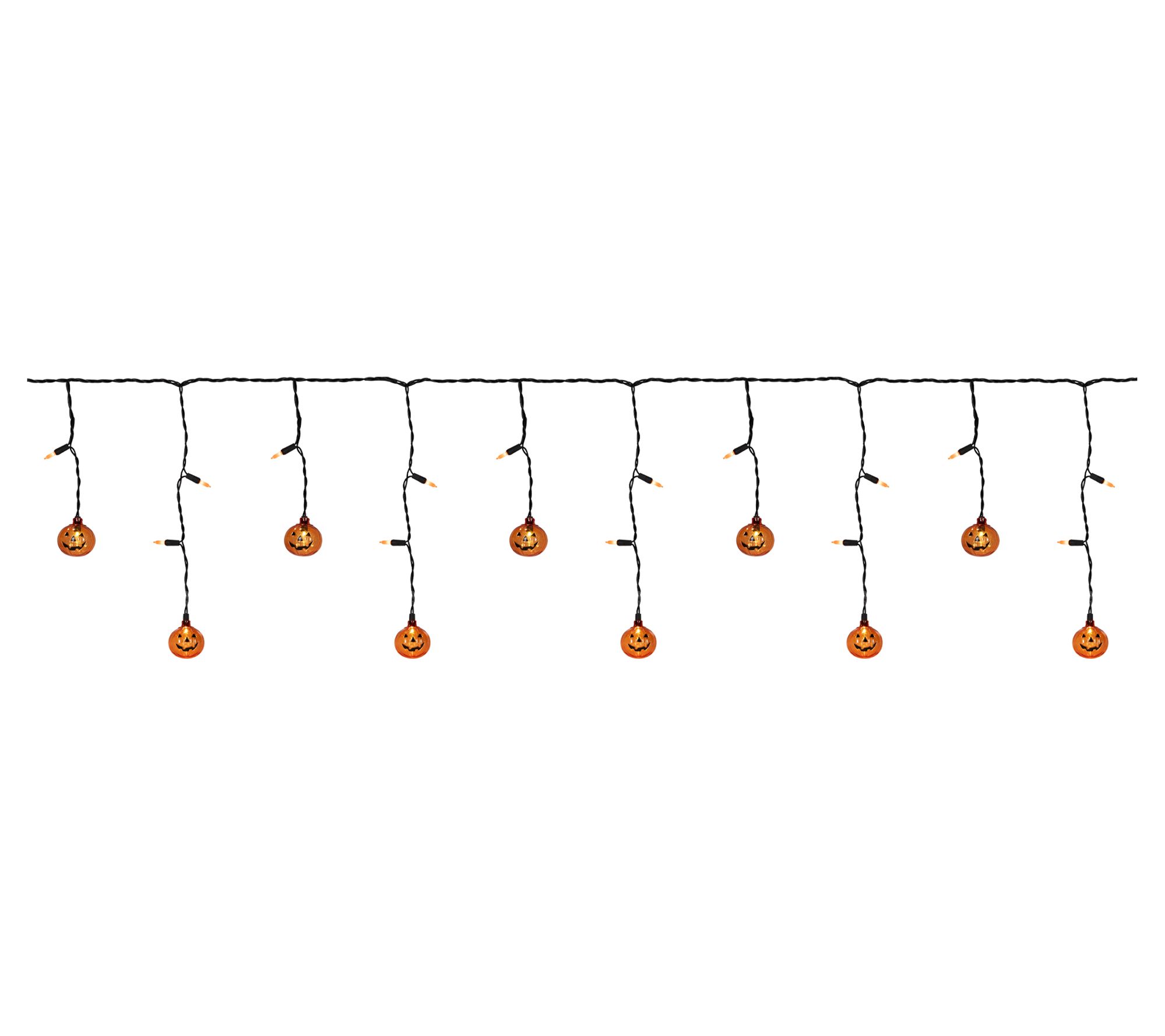 Brighten up your Halloween celebrations with these LED Halloween curtain icicle lights, featuring glowing orange bulbs and transparent pumpkin accents for a whimsical, festive display. Whether you're welcoming trick-or-treaters or hosting a spooky gathering, these lights set the scene for a memorable night with their playful charm and vibrant illumination. From Northlight.