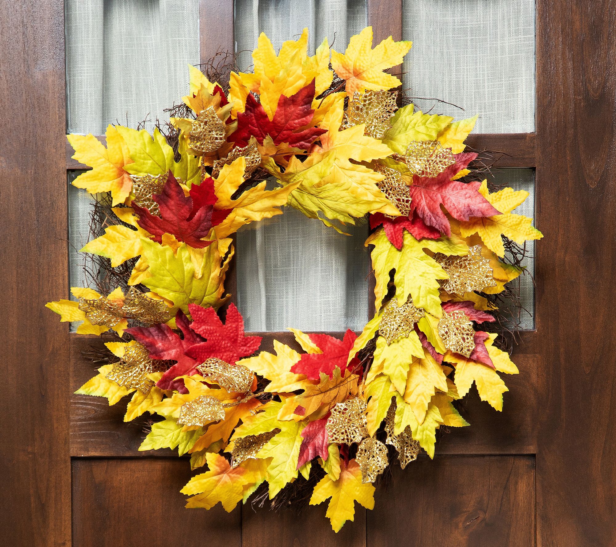 • Wreath features lifelike orange, burgundy, red, and green maple leaves with gold glitter leaves throughout