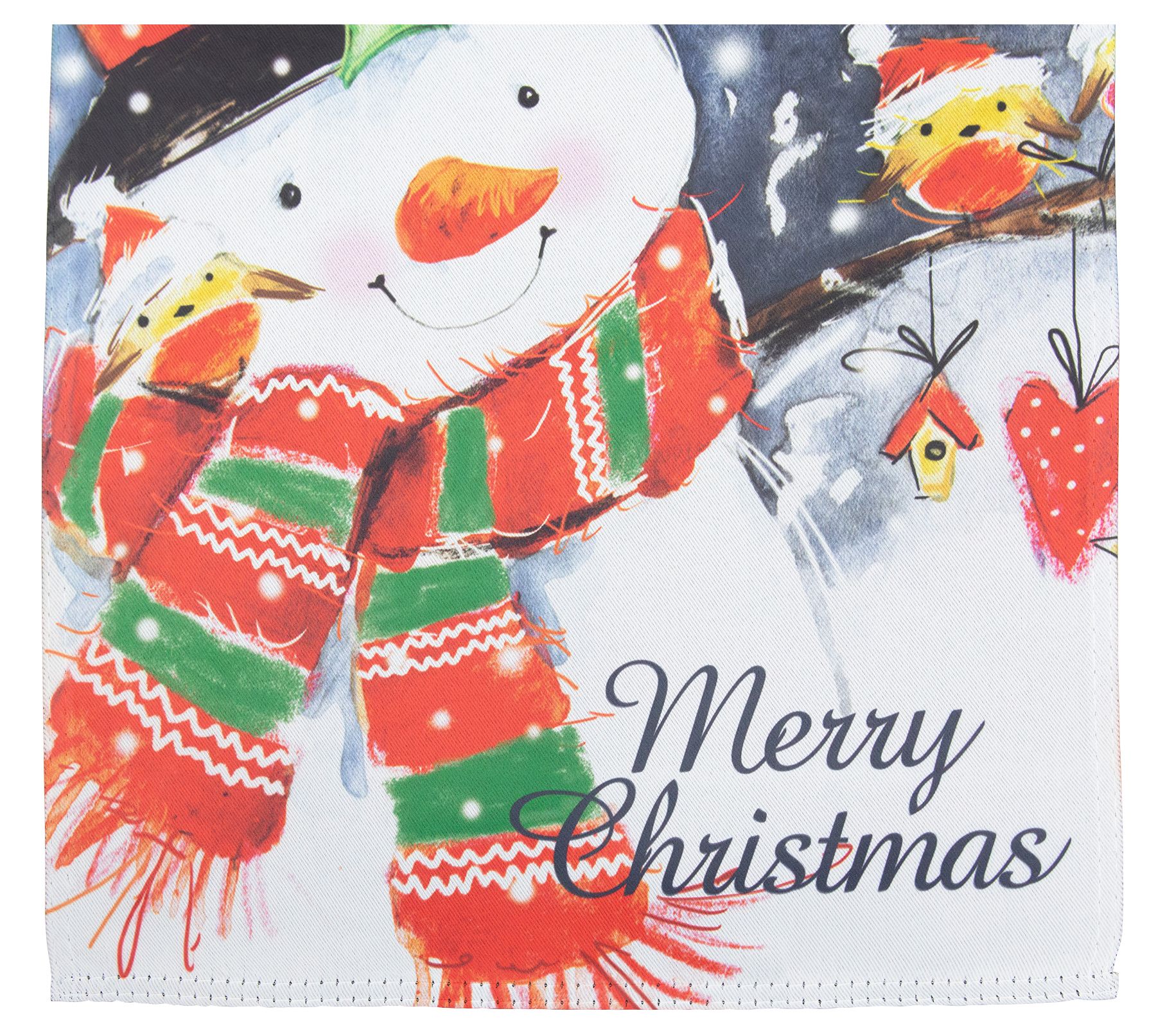 Bring the holiday spirit to your front yard with this whimsically charming snowman flag. Its festive design showcases a cheerful snowman adorned in a striped scarf and stovepipe hat, flanked by four cute goldfinch birds donning Santa hats. As snowflakes gently fall, the warm wishes of "Merry Christmas" stand out, letting everyone know where the festive cheer begins. Crafted for durability, this delightful flag is sure to spread joy throughout the season. From Northlight.