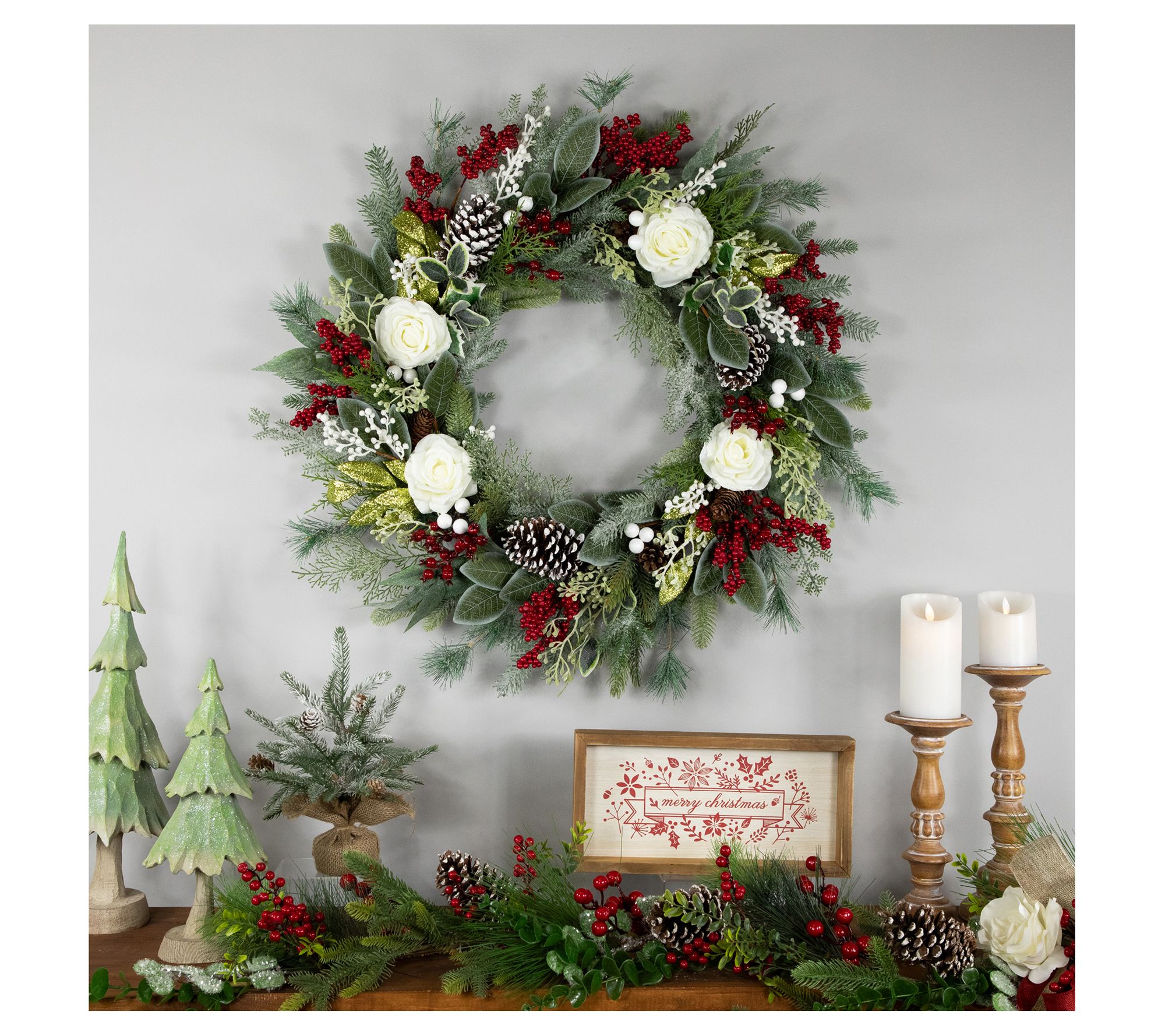 Set the stage for holiday gatherings or quiet winter evenings with this festive wreath, designed with a cheerful mix of lifelike greenery, elegant roses, vibrant red berries, and frosted pinecones. Hang it above a mantel or on your front door to welcome guests with timeless seasonal charm. From Northlight.