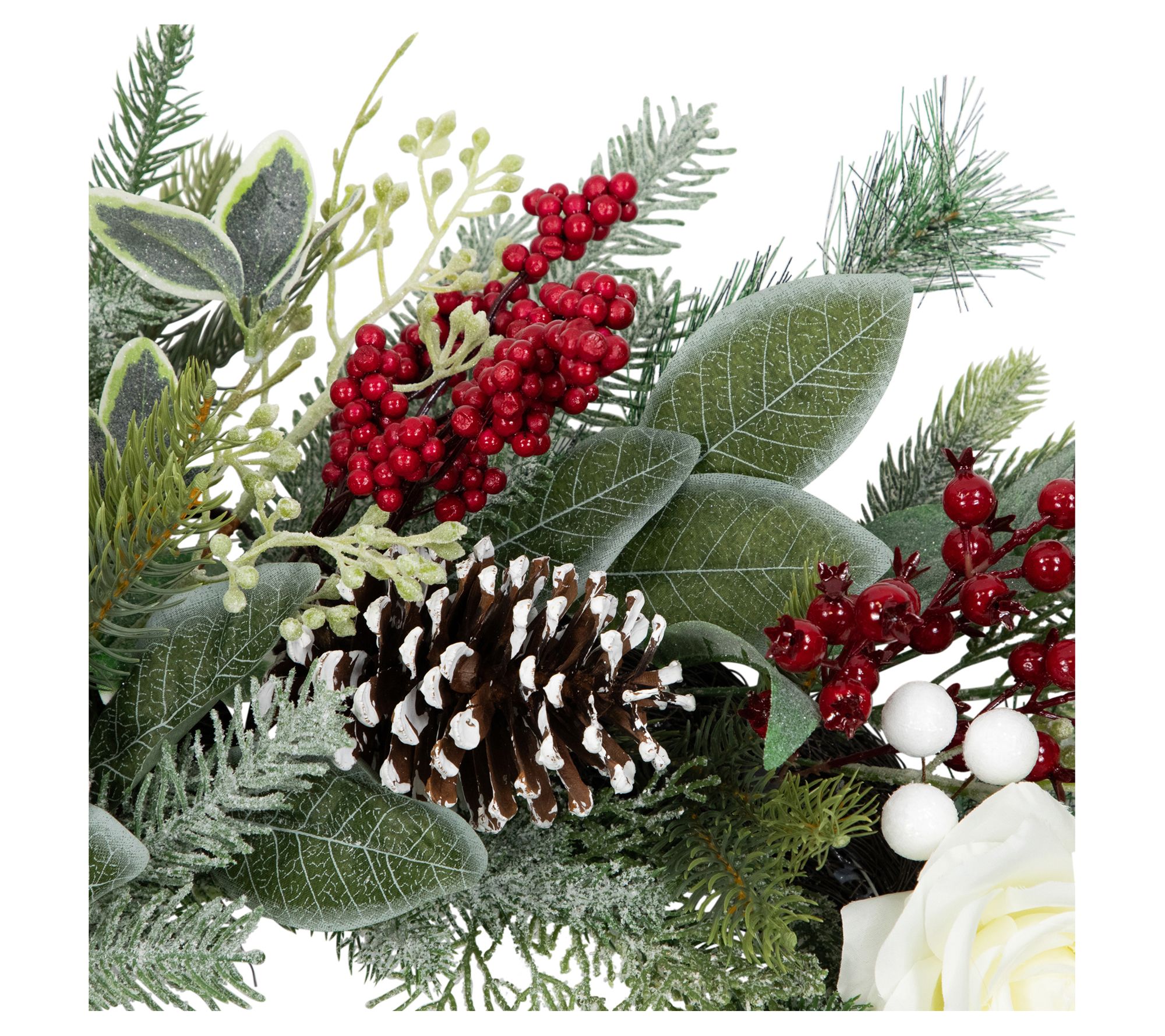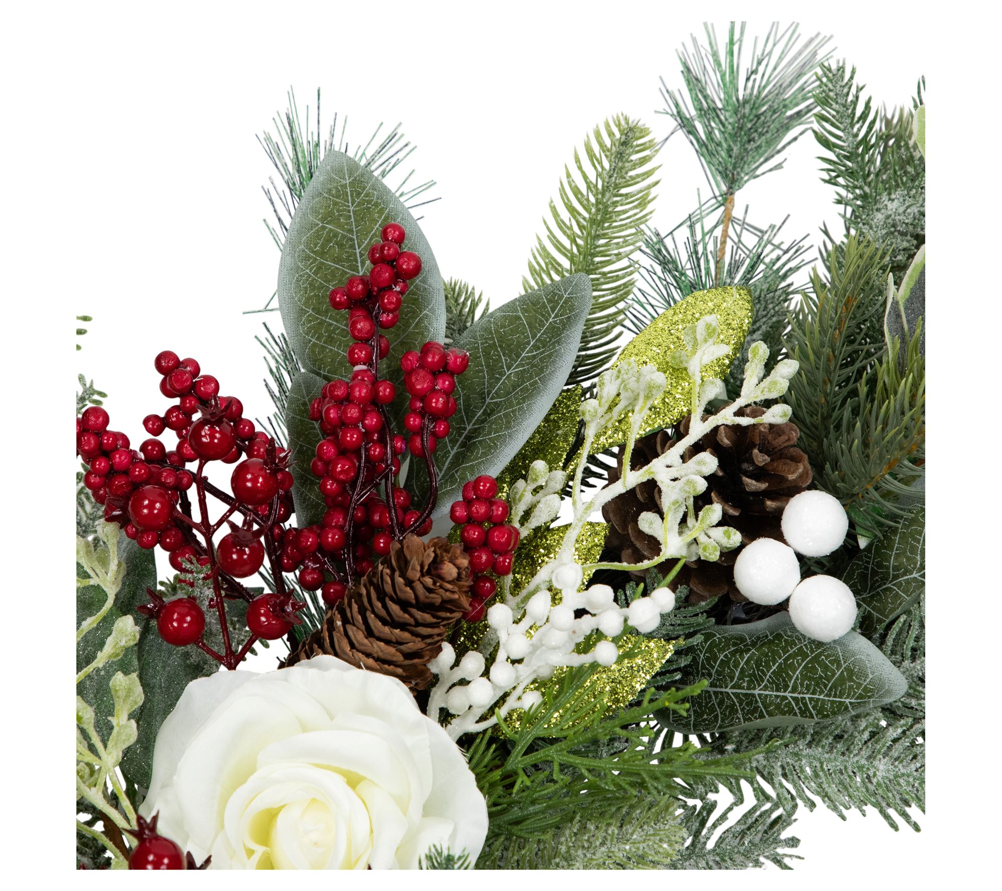 • Features white flowers, red berries, and frosted pinecones