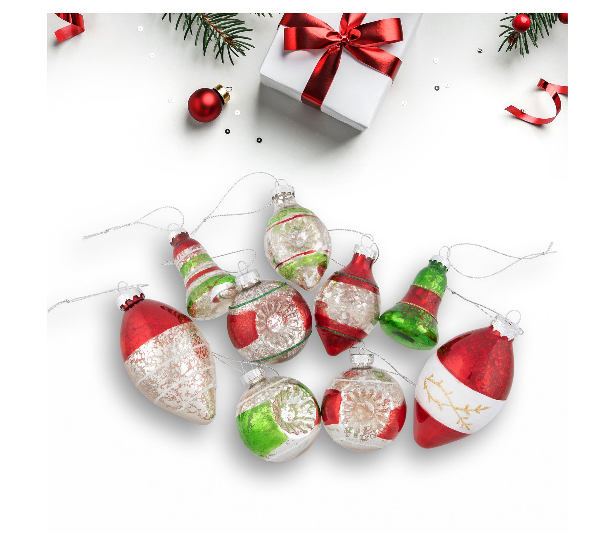 • Includes three ball ornaments, two bell ornaments, and four finial-shaped ornaments