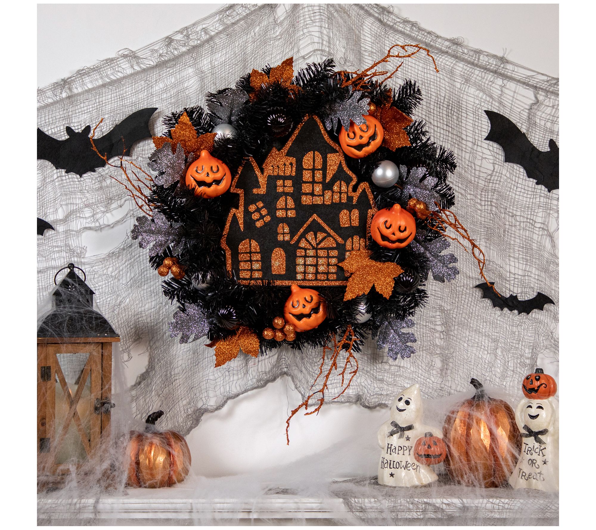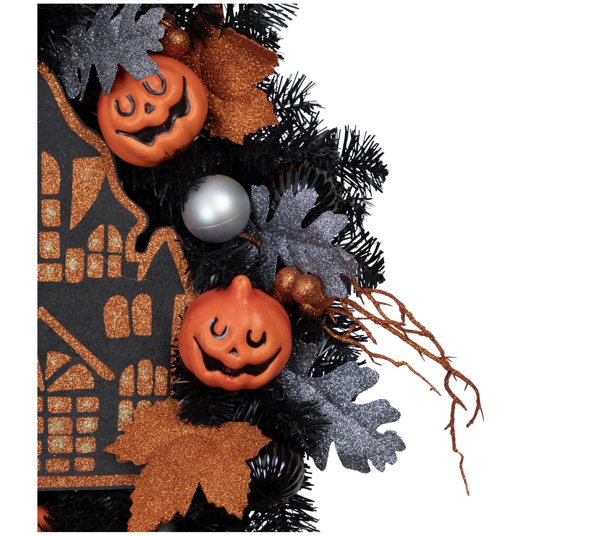 • Wreath features silver and black shatterproof ornaments, berries, and pumpkins with haunted house in the center