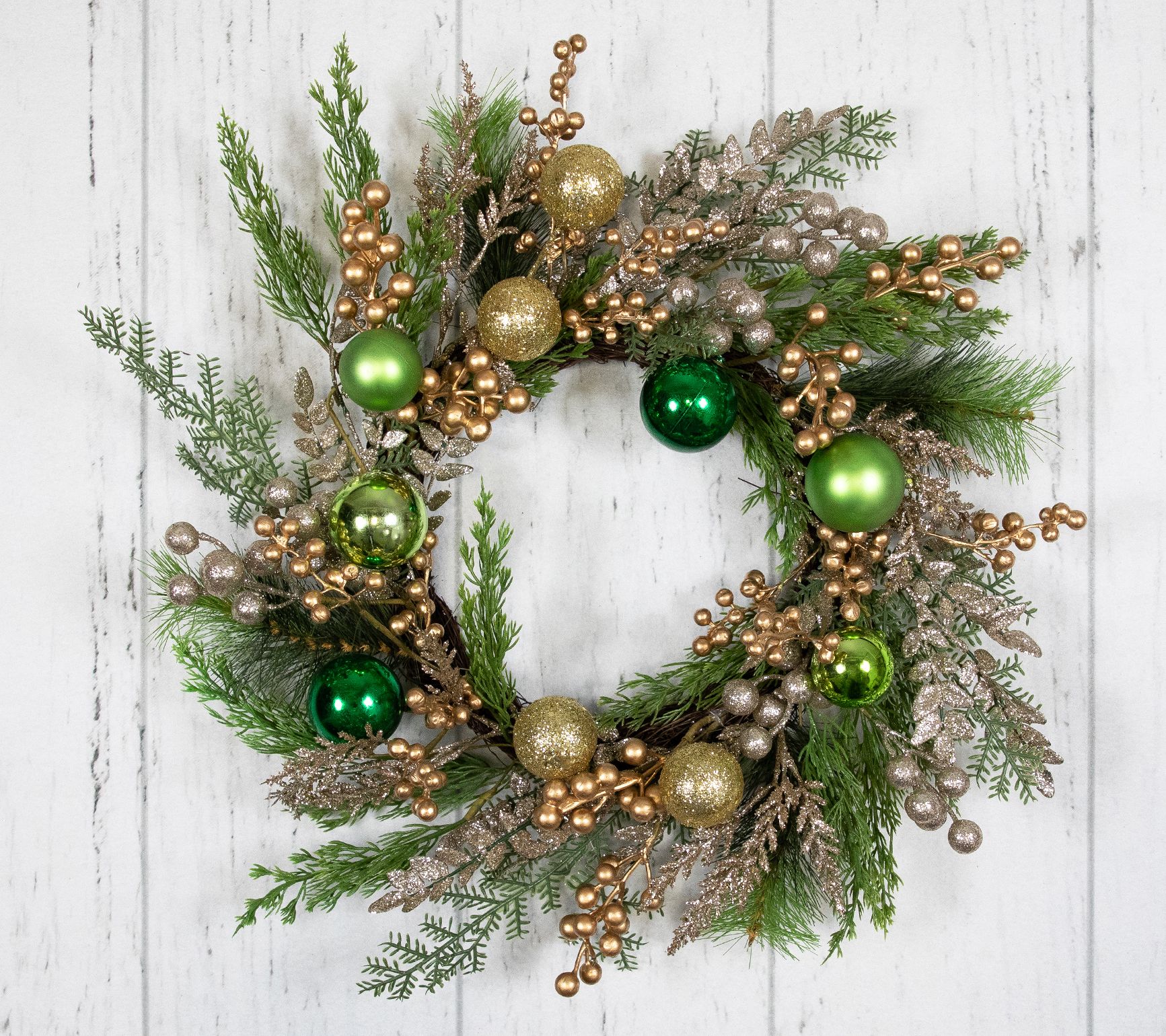 A festive, cheerful vibe greets everyone at the door when this ornaments and berries Christmas wreath takes center stage in your entryway or living room. Shiny, matte, and glittered ball ornaments mingle with vibrant berries and hints of sparkling glitter for a look that feels both classic and full of seasonal magic. Effortlessly hang it up thanks to the sturdy twig grapevine backing and let it brighten up your holidays year after year. From Northlight.
