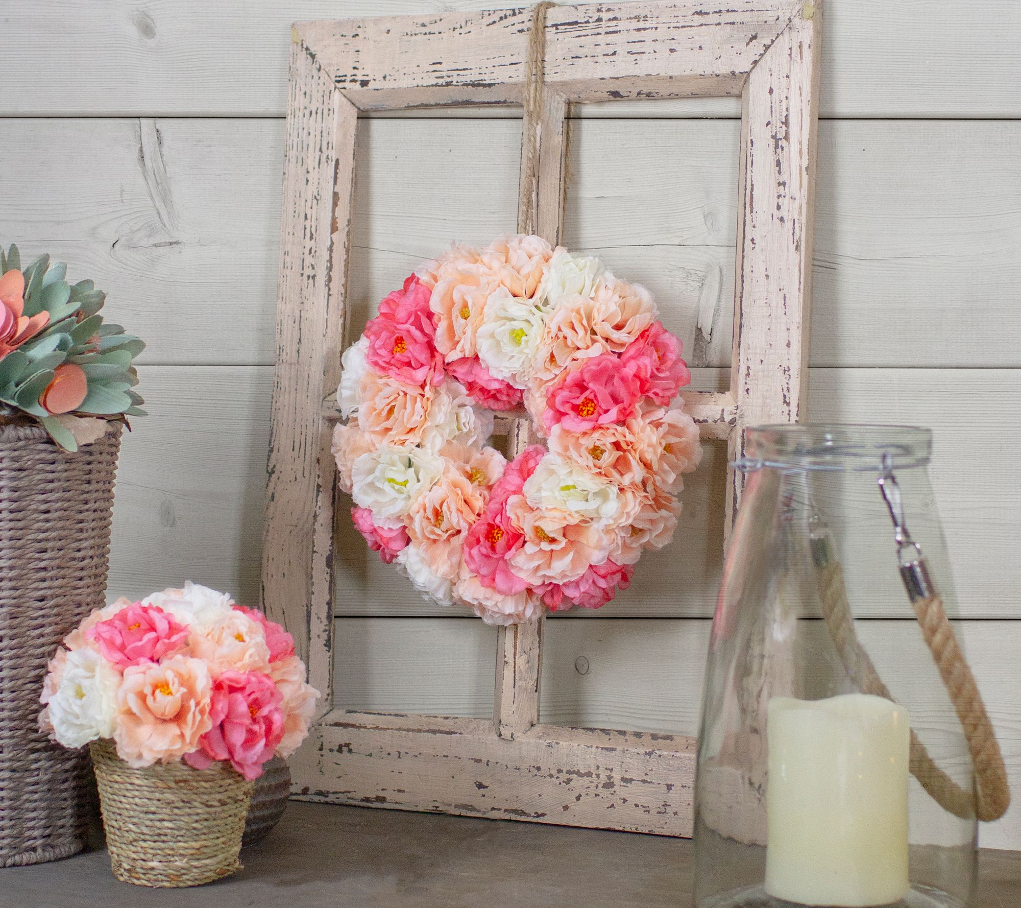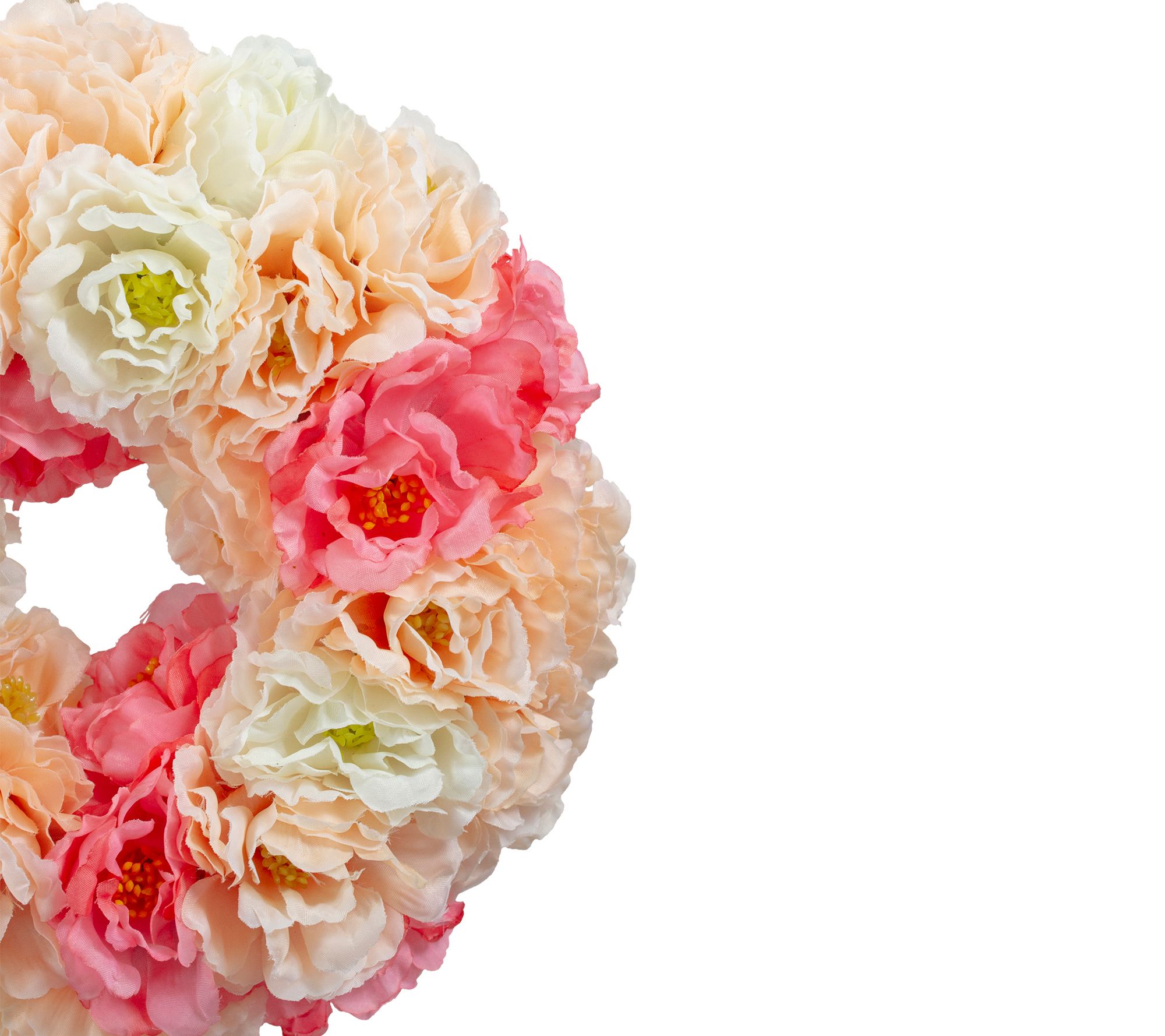 Celebrate the beauty of springtime with this faux wreath that features fluffy peonies in lovely shades of pink, peach, and white. From Northlight.