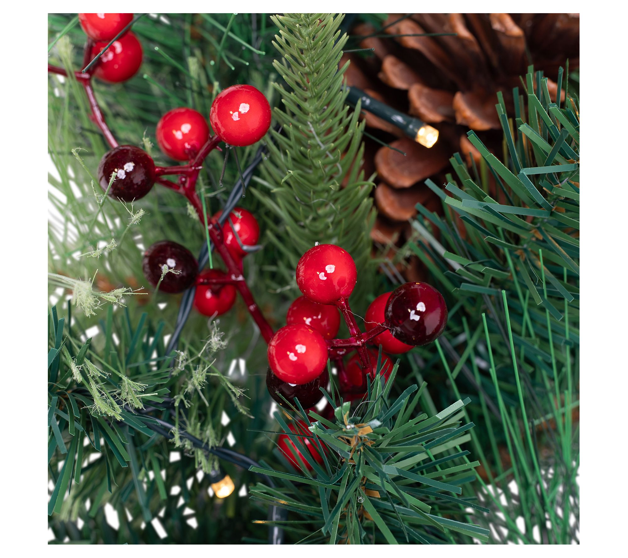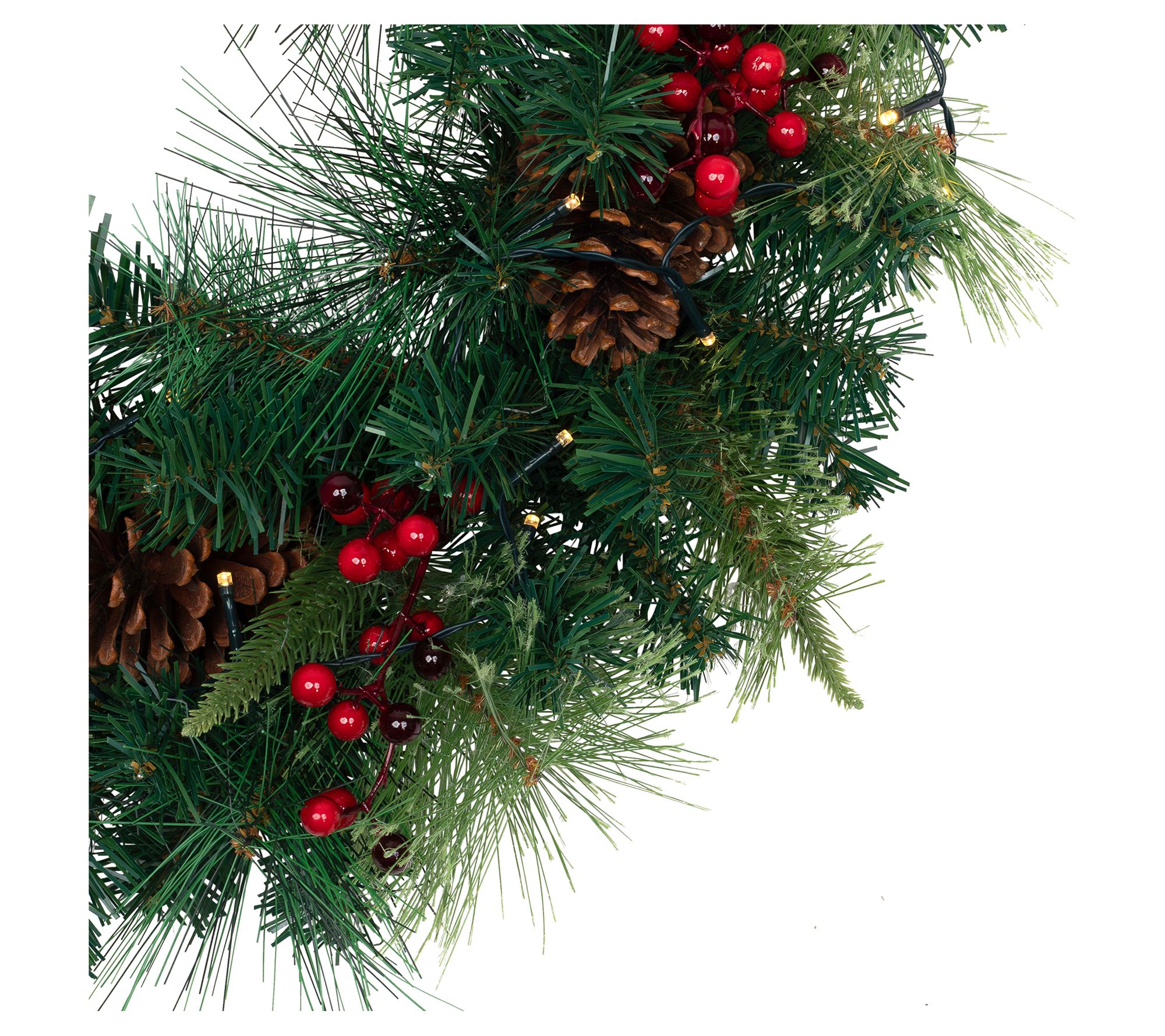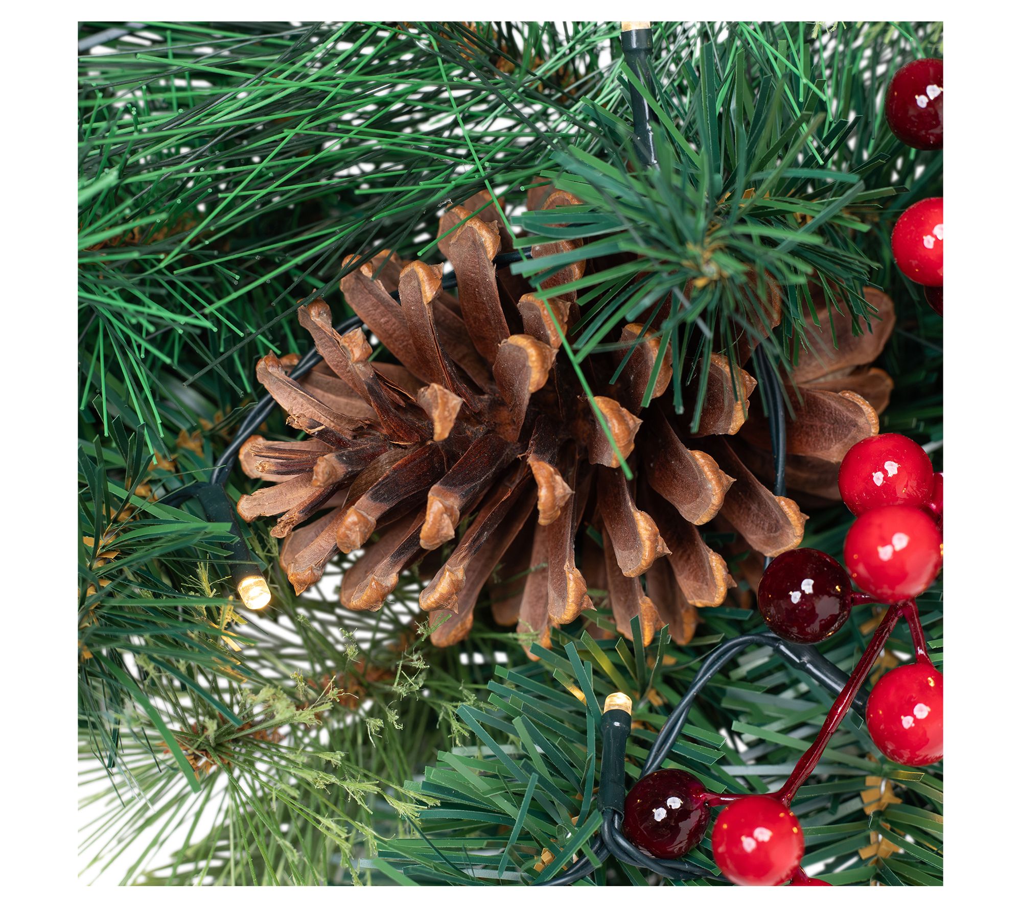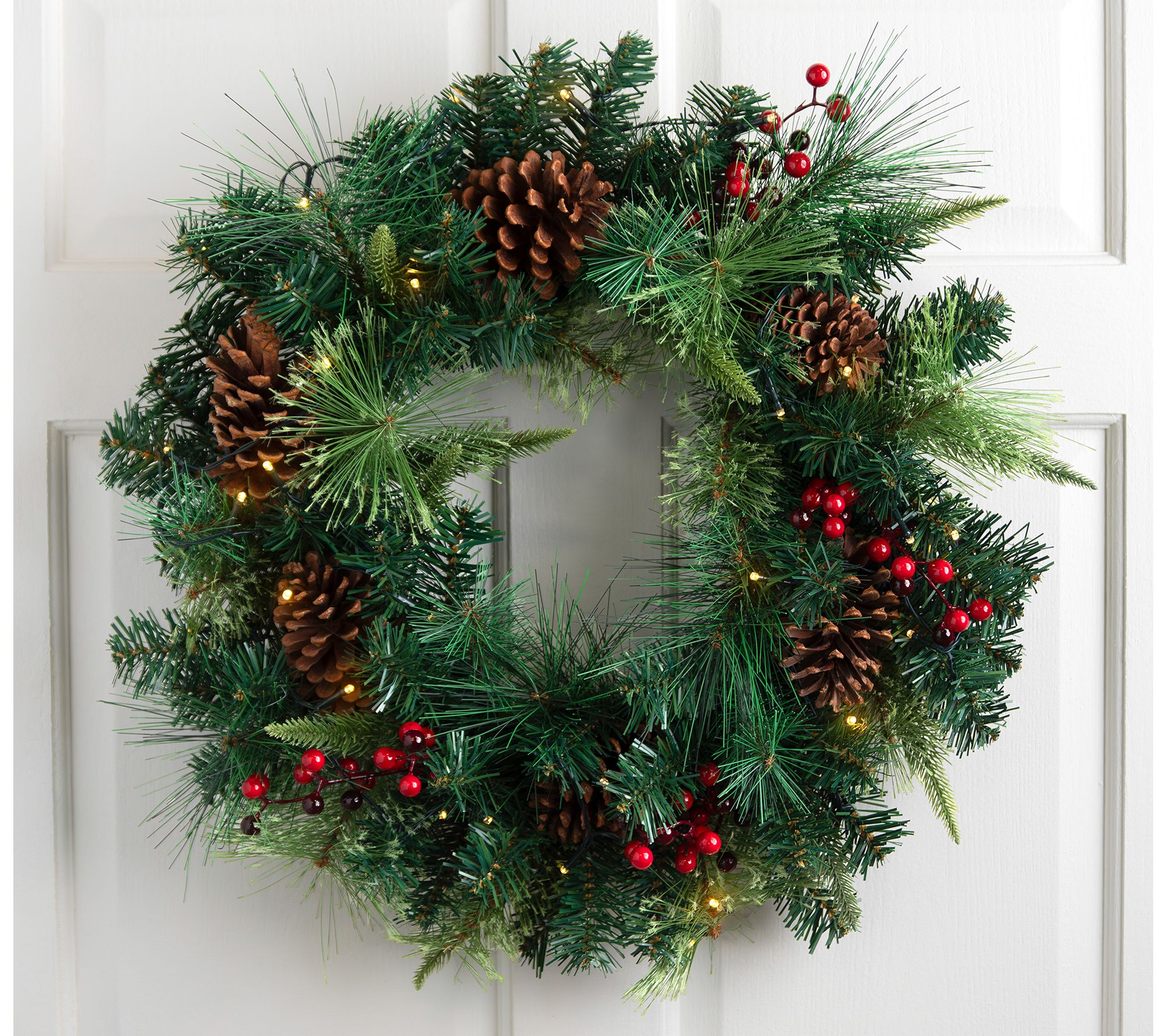 • Includes prelit lifelike mixed pine and berries wreath