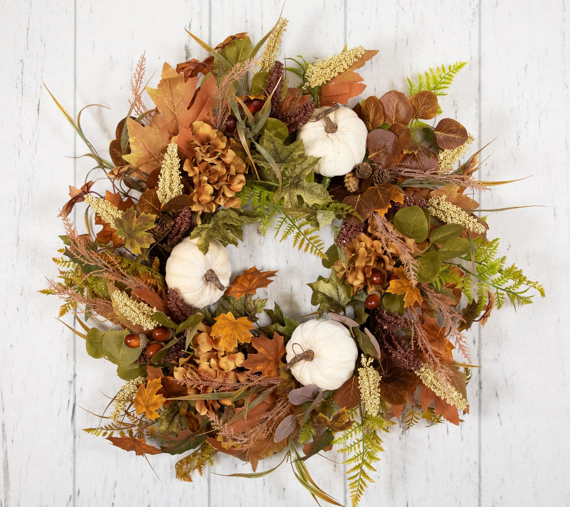 Add a burst of autumn color to your entryway or above the fireplace with this festive fall harvest wreath. Lifelike pumpkins, leaves, acorns, and mini pinecones come together on a rustic grapevine base to welcome guests with the inviting feel of the season. From Northlight.