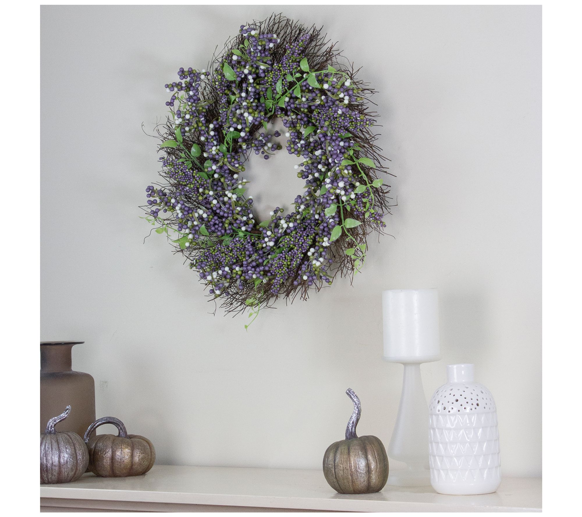Celebrate every season with a pop of color -- this mini berry Thanksgiving wreath adds warmth and charm to your entryway, mantel, or dining room wall. Overflowing with purple, white, and green berries nestled among twigs and leaves, it brings the beauty of the outdoors right into your home. From Northlight.