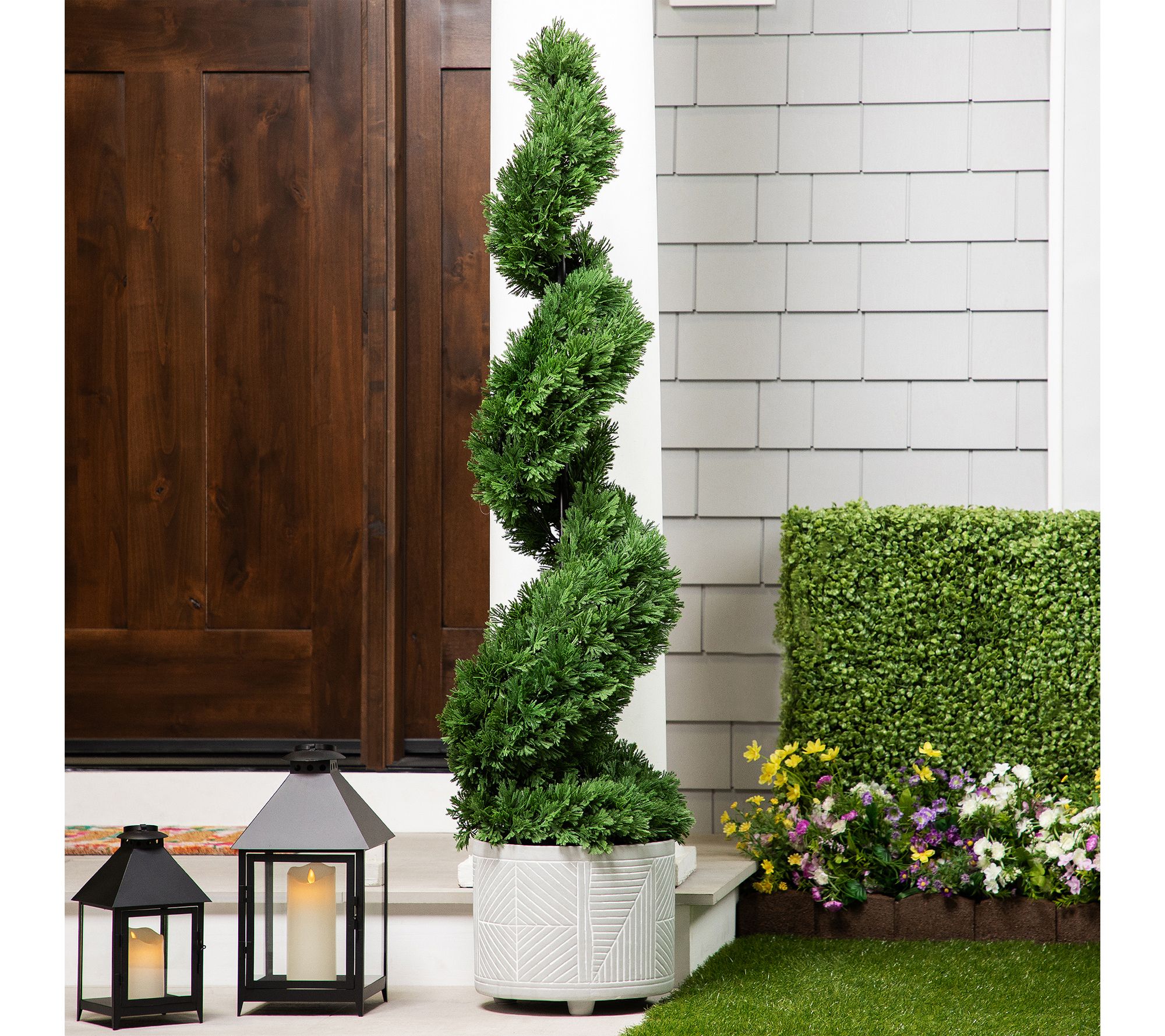 Give your home or porch a welcoming touch with this lifelike cedar spiral topiary tree, featuring Real Touch branches for a lush look without the upkeep. Nestled in a weighted black pot with faux moss soil, it's a stylish way to brighten any entryway or refresh a quiet corner -- no watering or sunlight required. From Northlight.