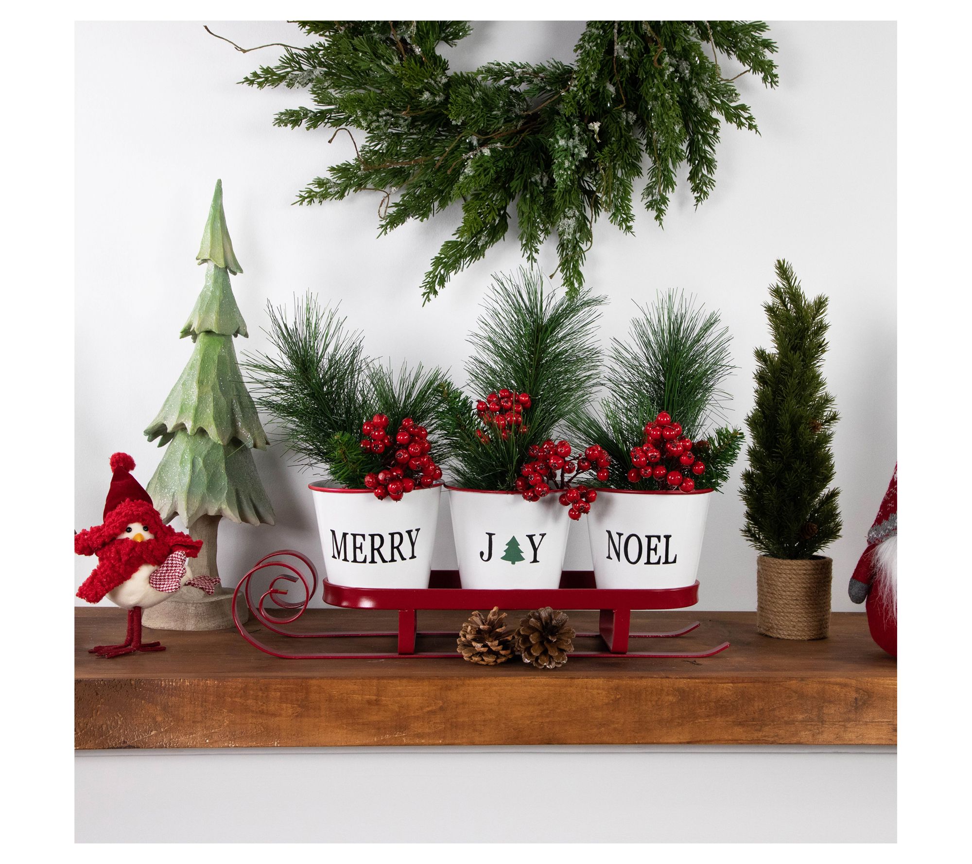 Dress up your holiday table with this retro-inspired sleigh featuring large tin buckets that can be used to house nuts, candies, dried flower arrangements, or flameless candles. From Northlight.