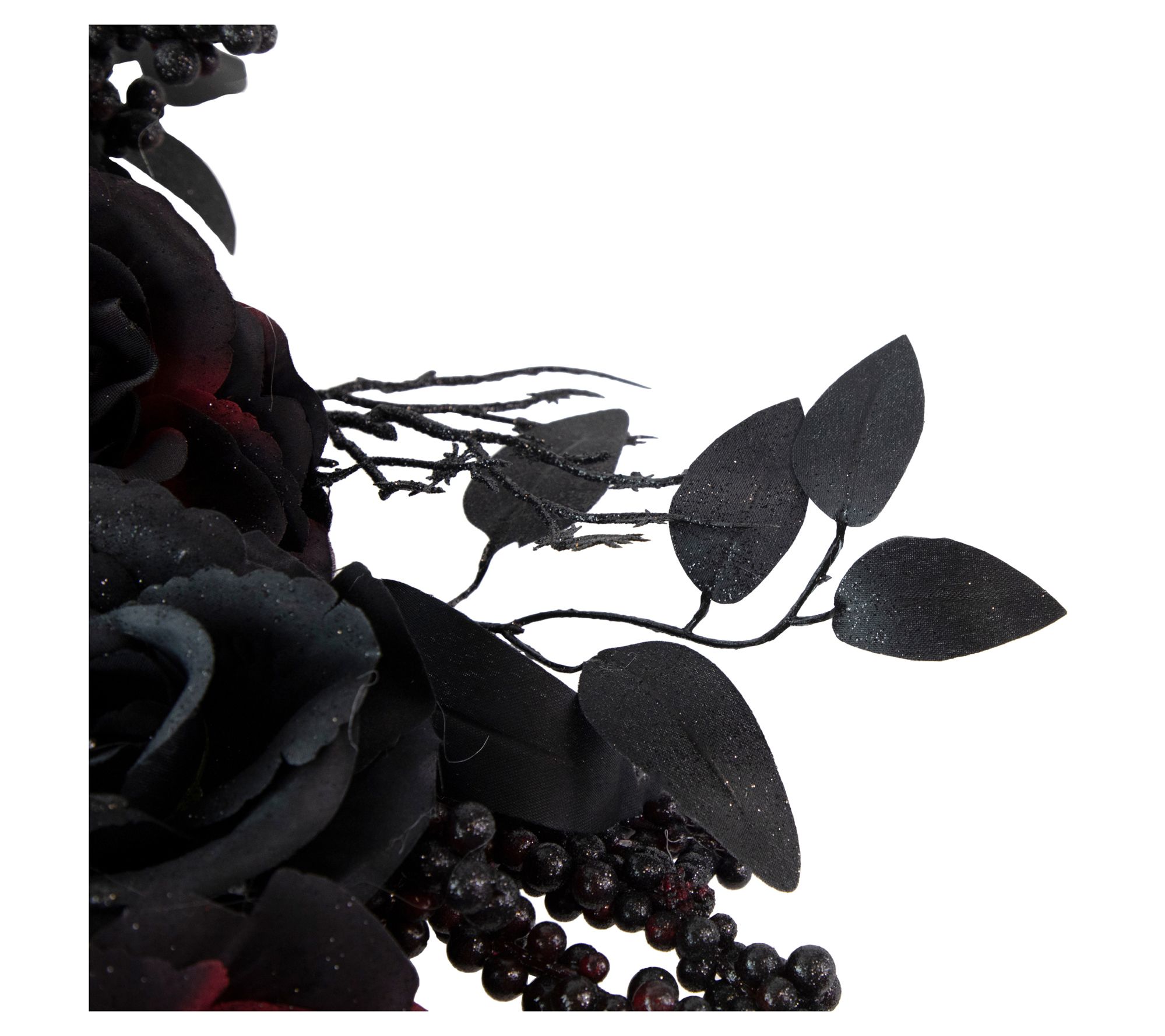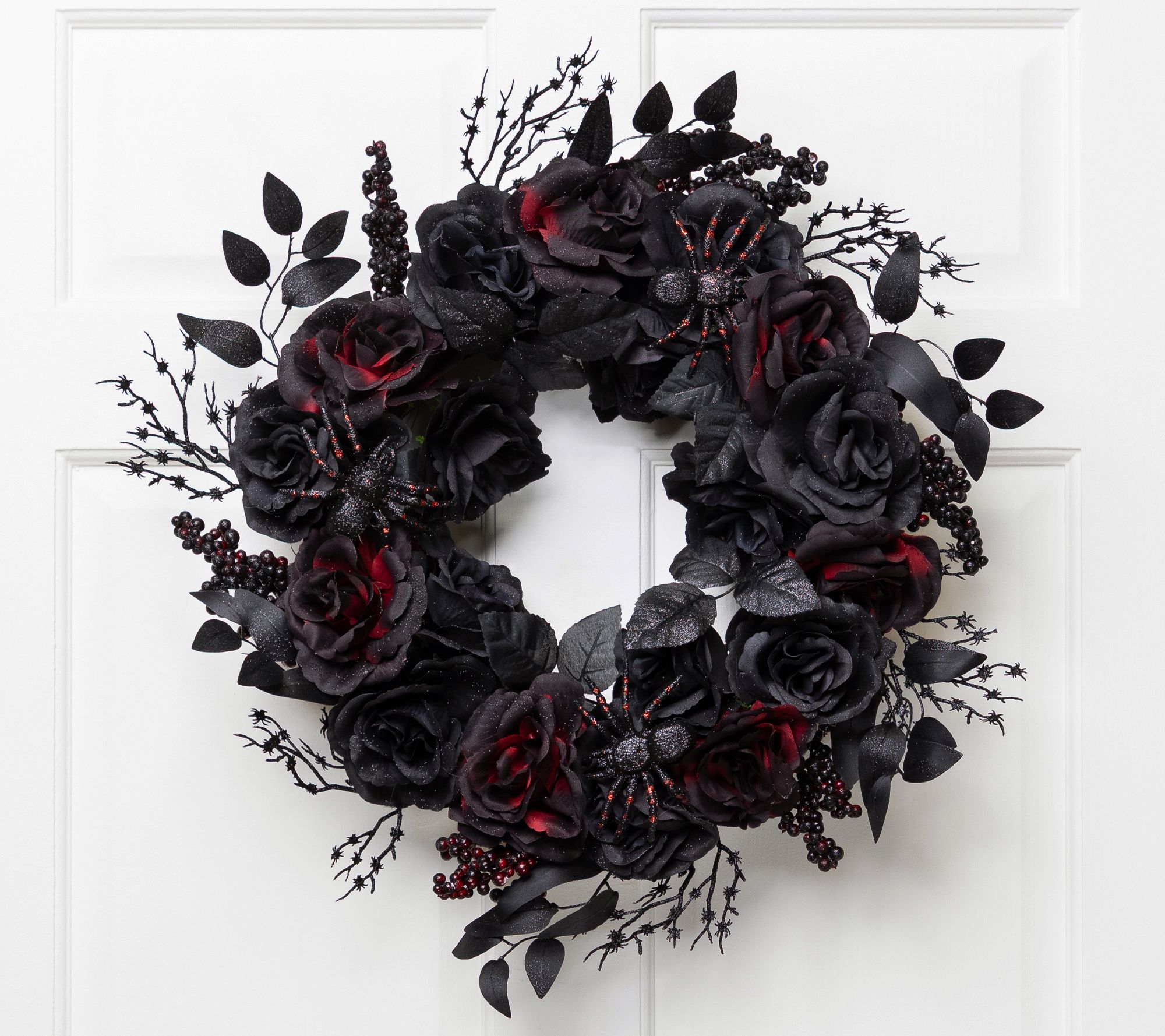 • Accented with black and burgundy glittered roses and spiders