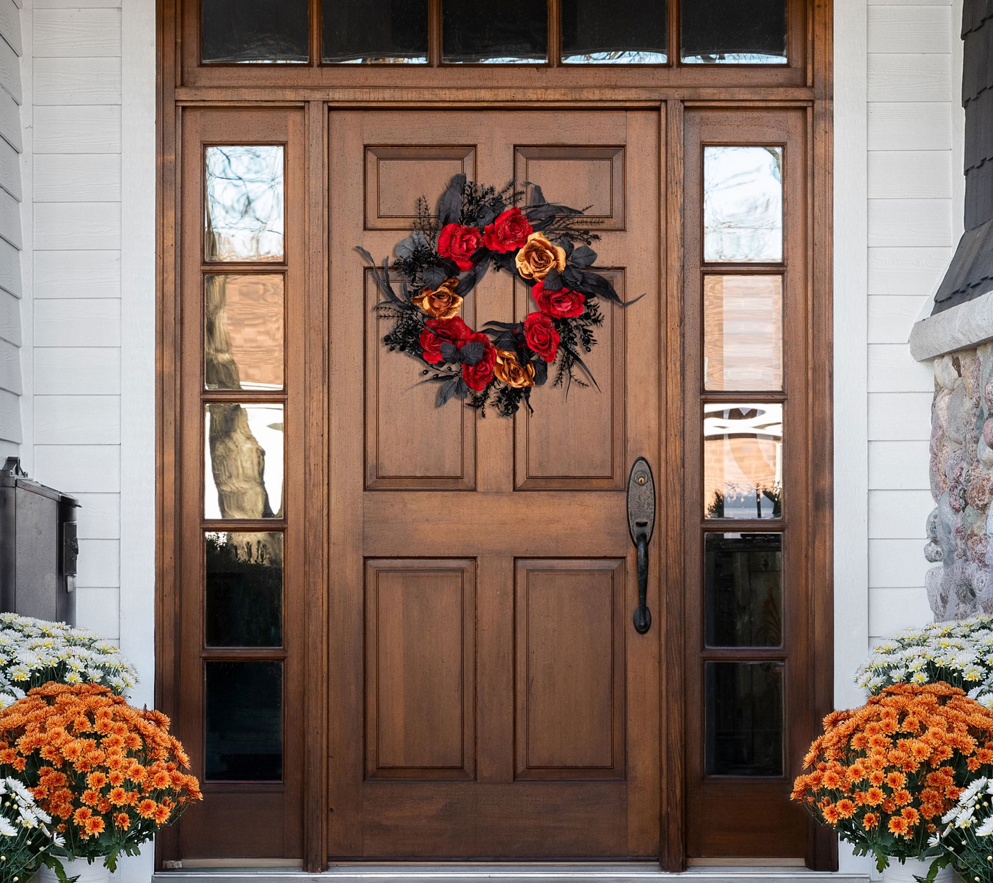 Set a mysterious mood for Halloween festivities by displaying this wreath, bursting with velvety red and gold roses and dark, dramatic foliage. Its sculptural grapevine base looks striking whether hung on your front door, over a buffet, or as a centerpiece for a party. From Northlight.