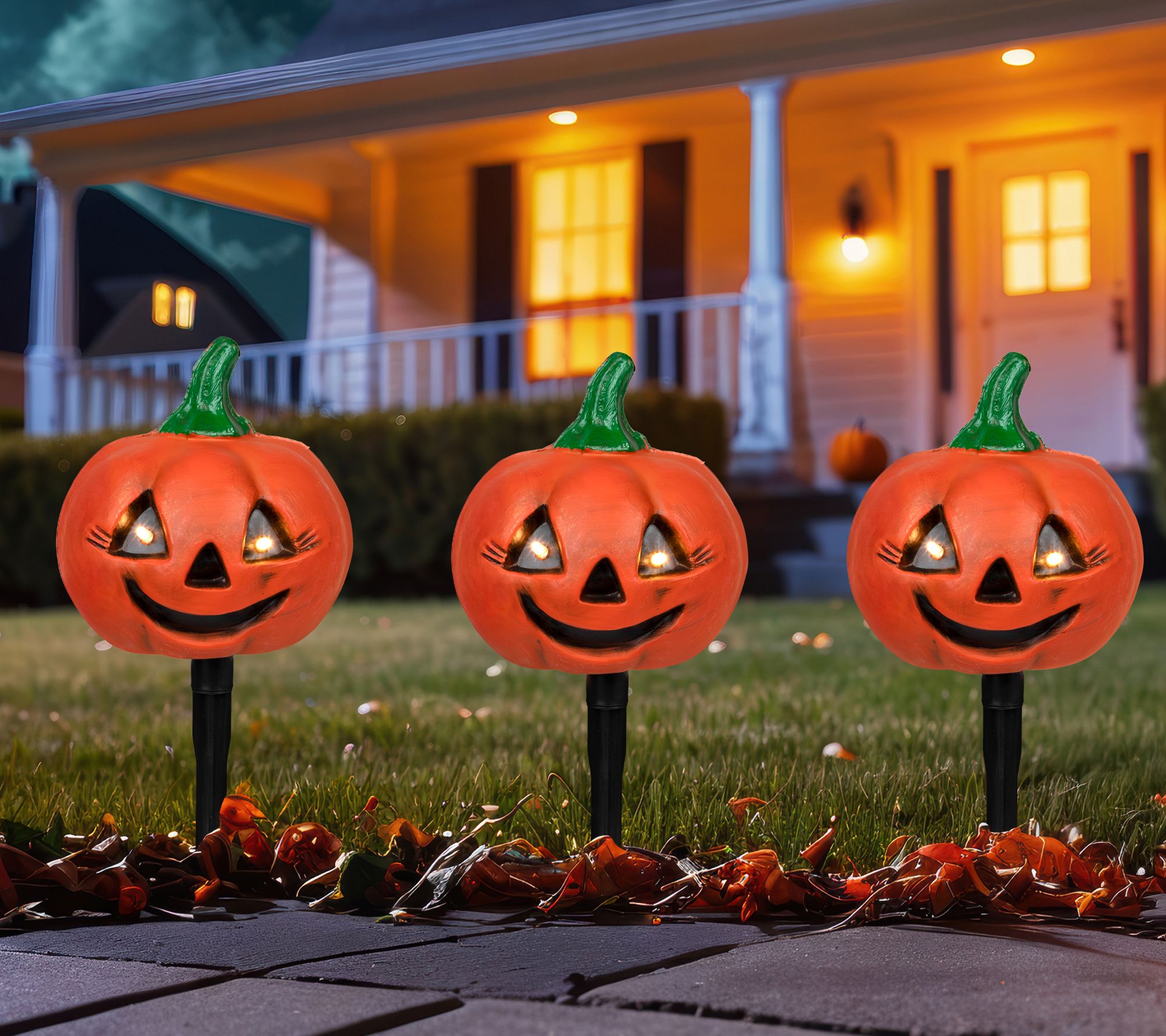 • Includes three lighted Jack-o-Lantern Halloween Pathway markers