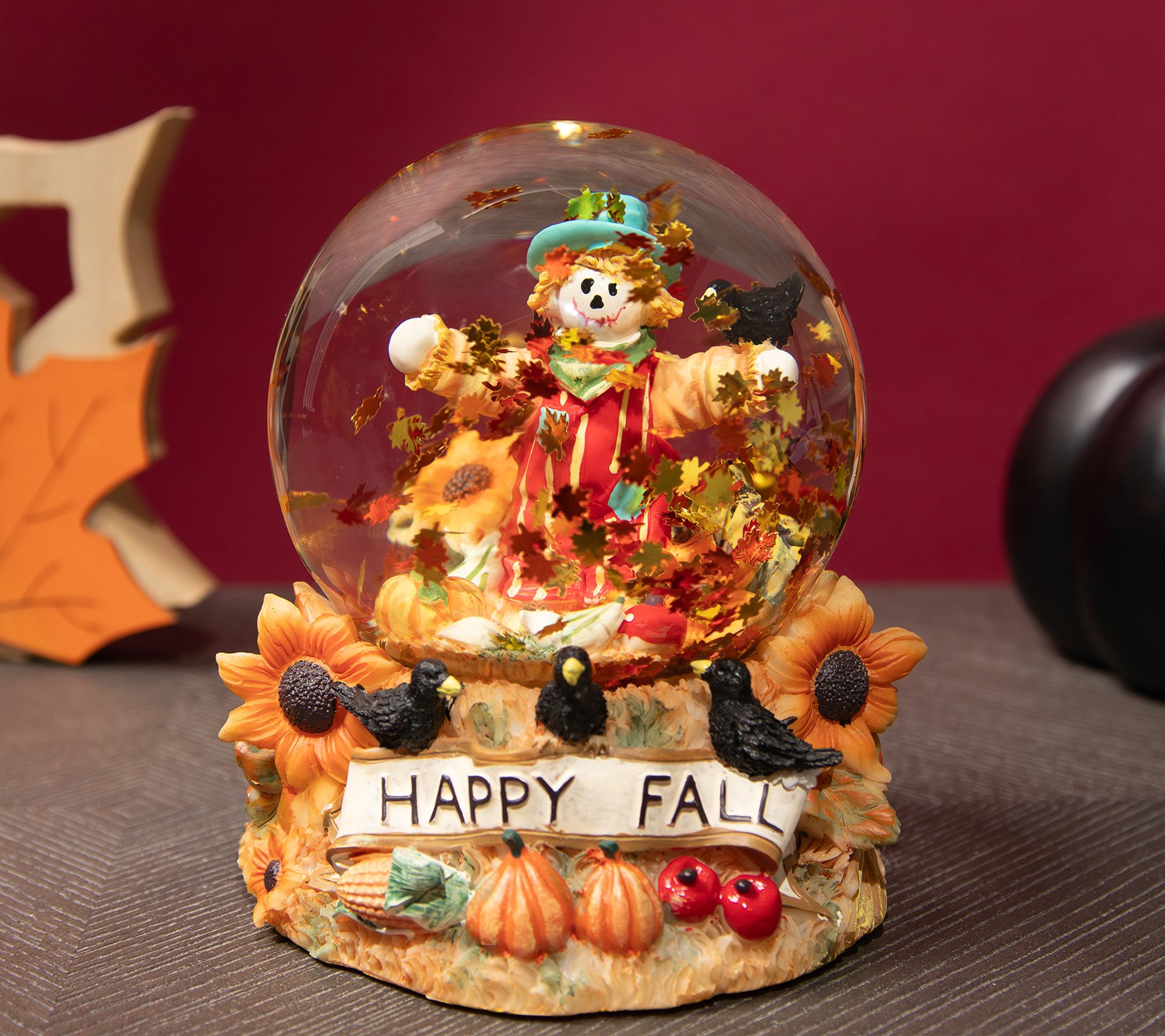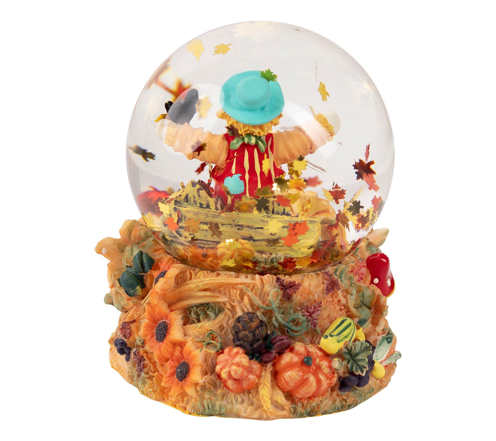 • Globe interior features scarecrow, sunflowers, pumpkin, and fence