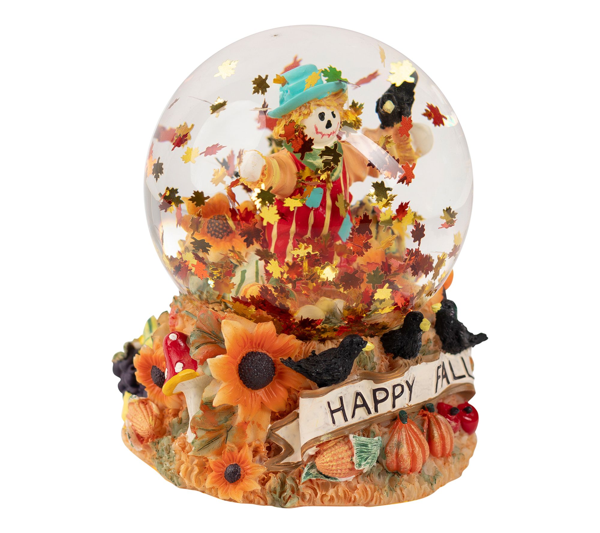 Autumn's warmth and whimsy come to life in this fall harvest snow globe, where a cheerful scarecrow stands surrounded by sunflowers, pumpkins, and swirling maple leaf glitter. A "Happy Fall" banner and vibrant base add festive charm, transforming any shelf or mantel with the cozy spirit of the season. From Northlight.