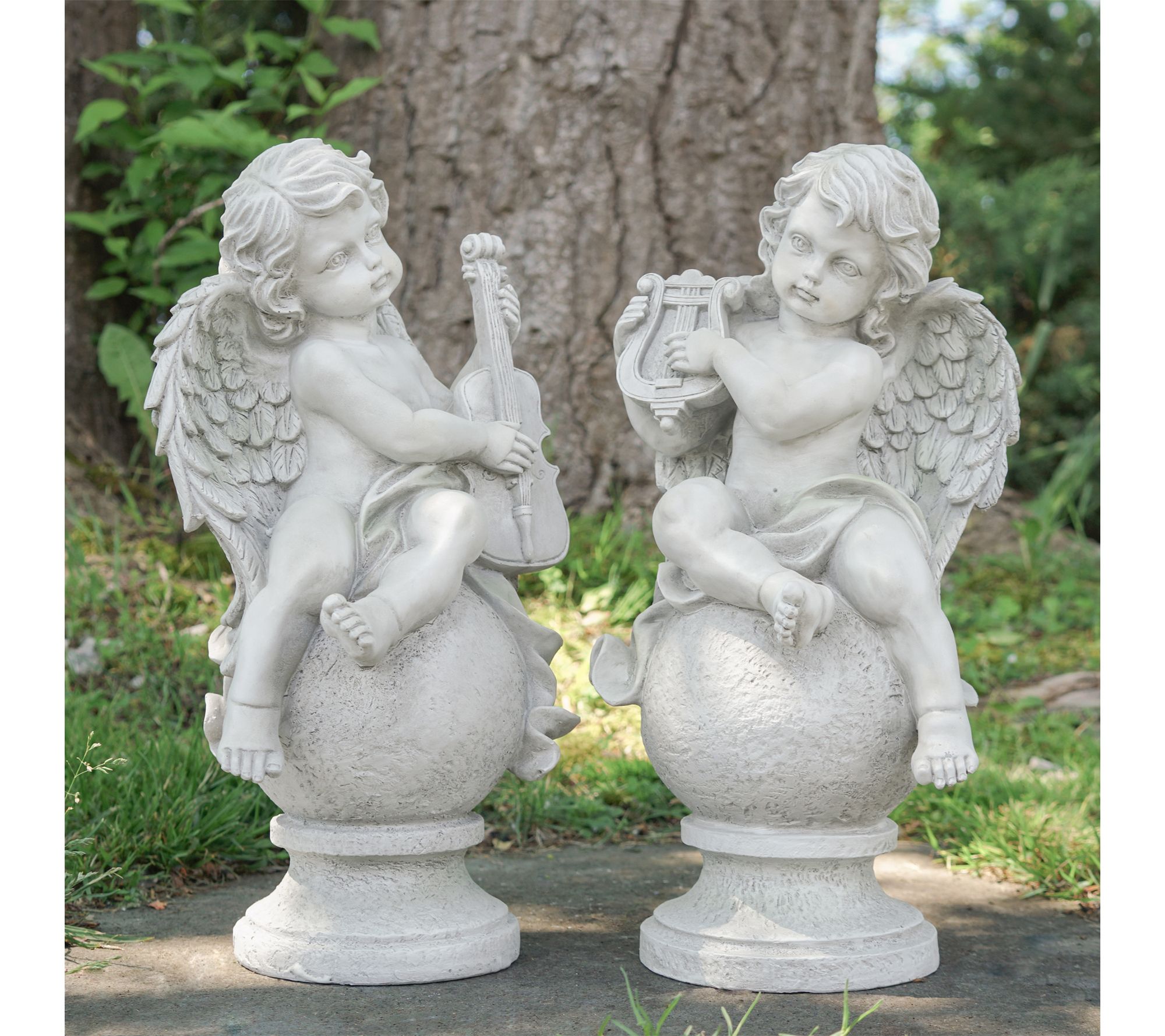 Create an inviting atmosphere in your outdoor space with this set of cherub angels garden statues. Placed among blooming flowers or on a porch, these endearing figures playing the harp and violin add a touch of charm that's sure to draw smiles from guests and family alike. The life-like details offer a gentle accent for garden paths, patios, or even a cozy sunroom. From Northlight.