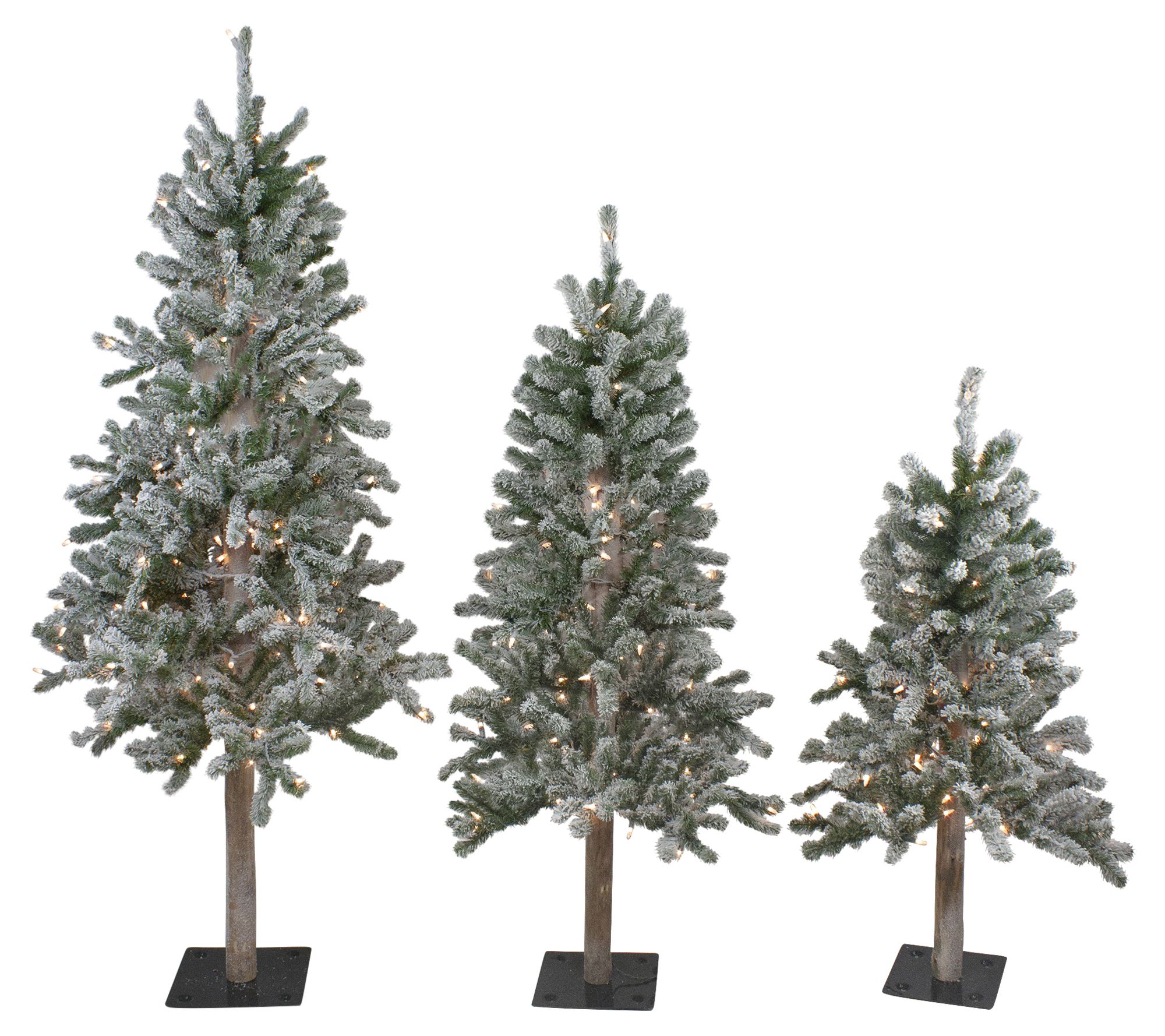 Celebrate the rustic charm of the holiday season with this set of three flocked Alpine trees, each adorned with clear lights to add a warm, festive glow to your decor. These slim-profile trees, featuring realistic wood trunks and a light dusting of snow, effortlessly bring the beauty of a country Christmas into your home. From Northlight.