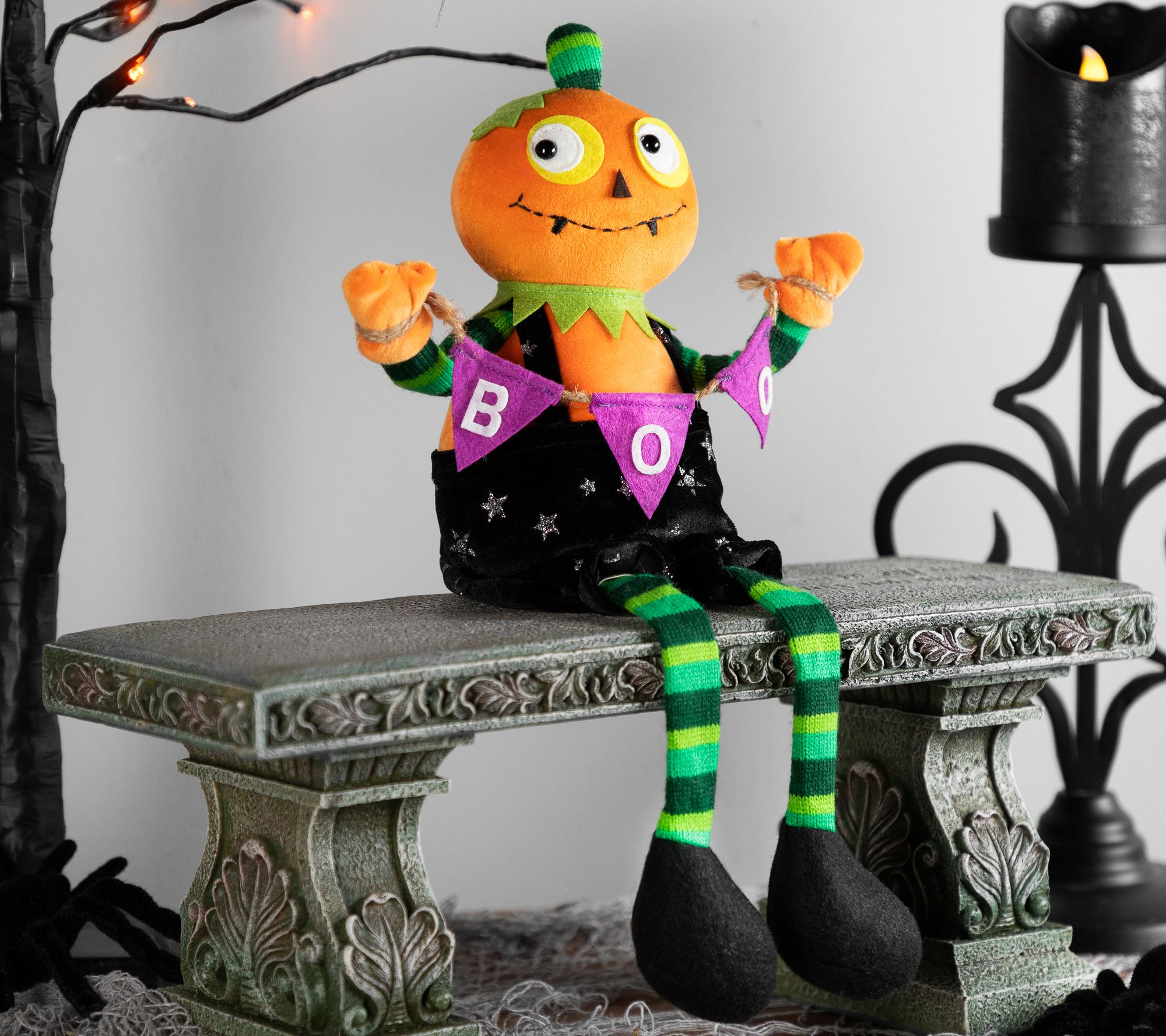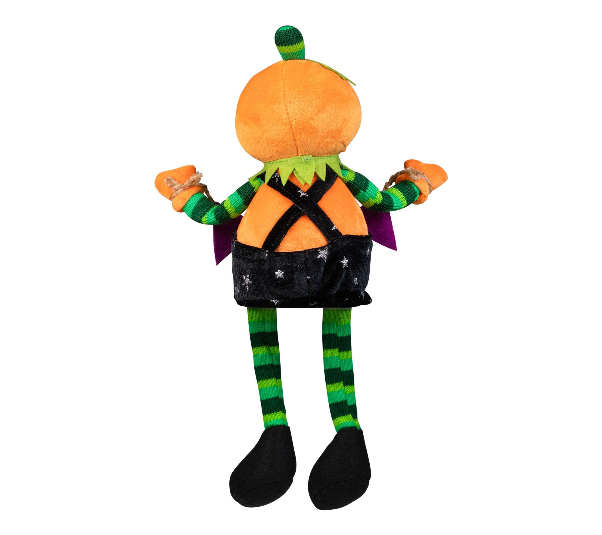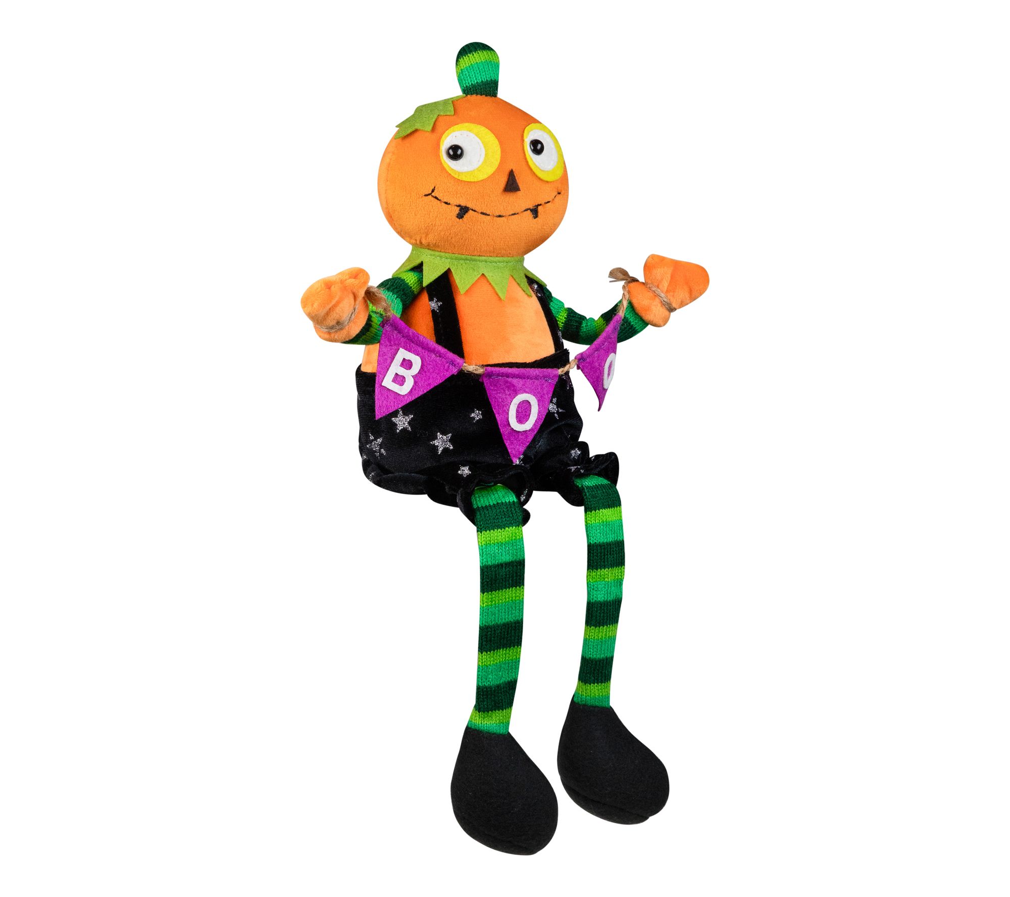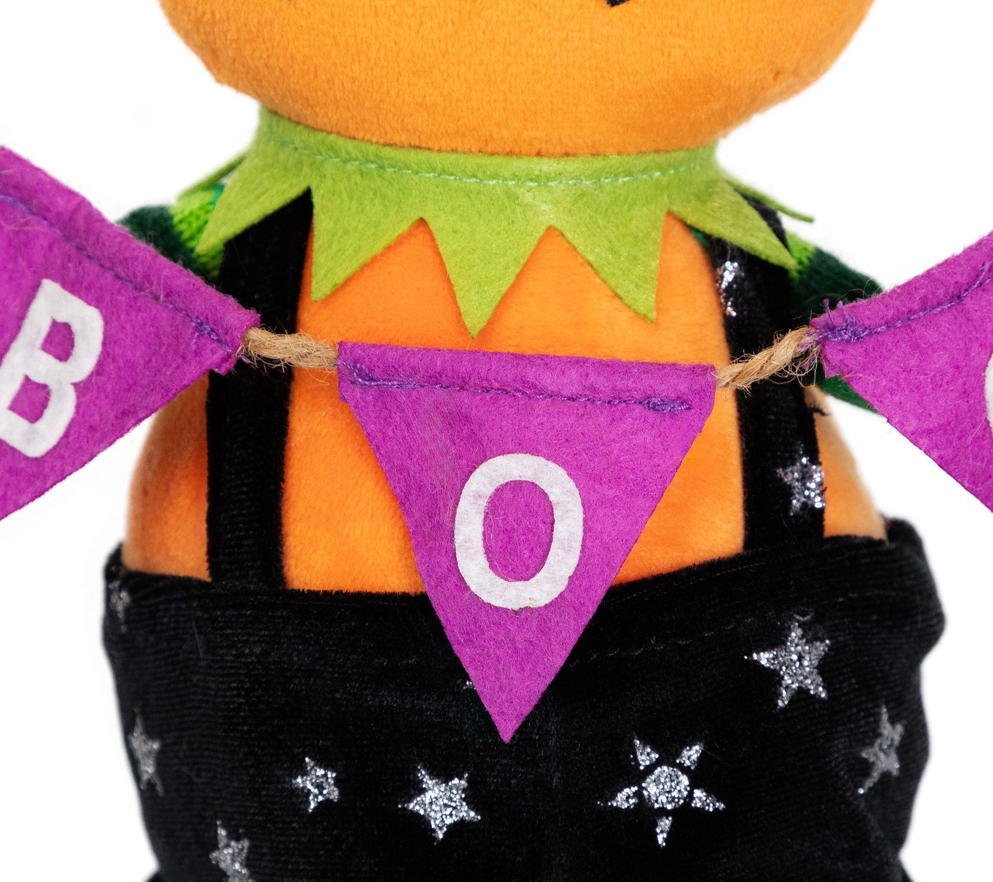 Create an eye-catching Halloween scene with this sitting plush jack-o'-lantern, decked out in black velvet overalls scattered with glittery silver stars. Playful green striped arms, dangling legs, and a whimsical string of purple "BOO" pennants add a cheerful touch, making it the ideal accent for shelves, mantels, or entryways. From Northlight.