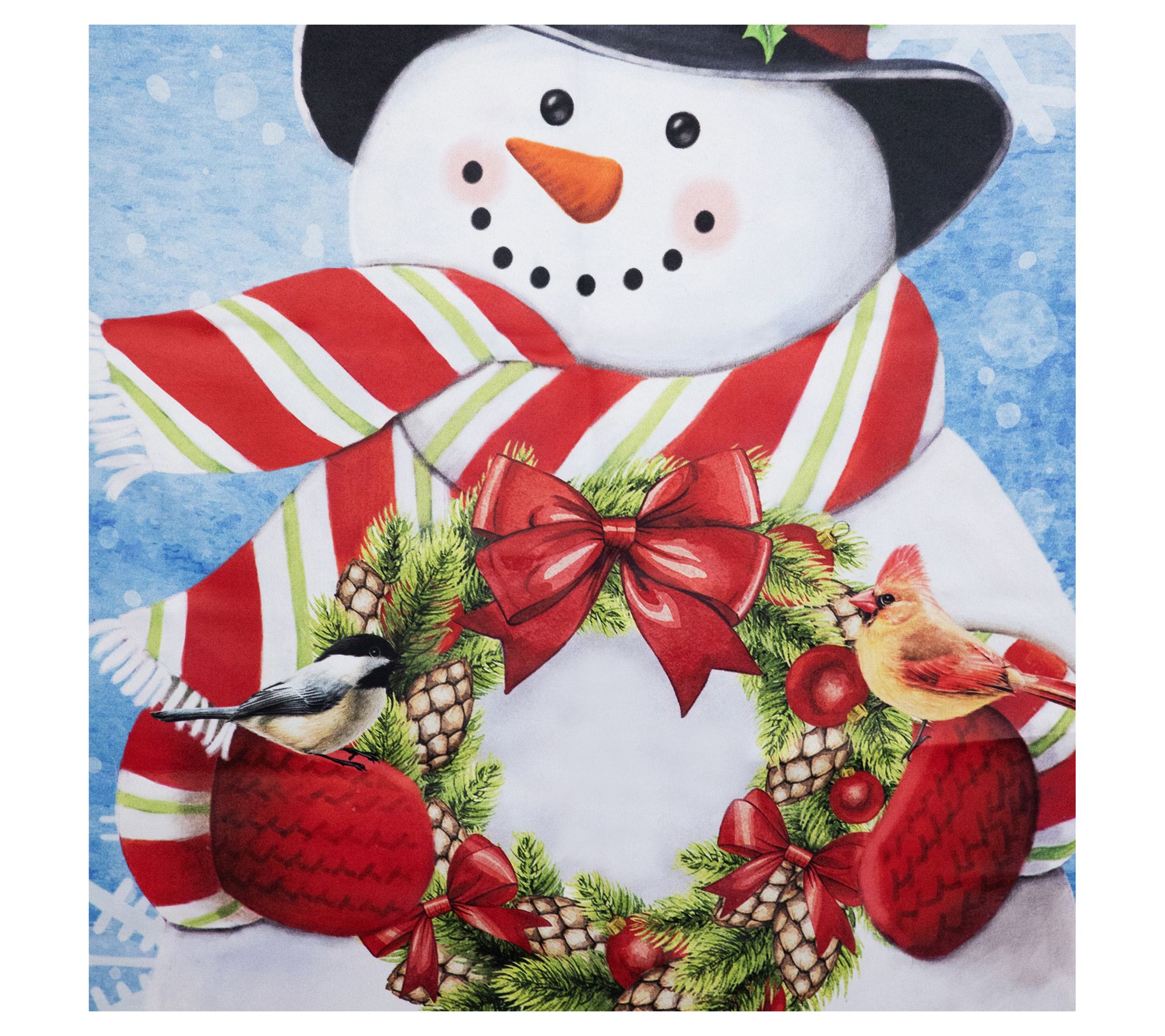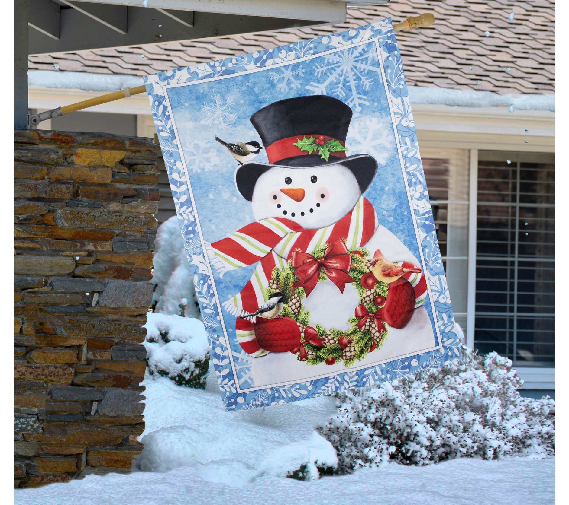 Add a touch of festive whimsy to your garden with this charming snowman flag. Dapper in his top hat and scarf, the snowman holds a wreath embellished with bows and pinecones, while three cheerful birds perch playfully atop his ensemble. The snowflake-adorned border with pine branches and holly leaves enhances the seasonal elegance of your outdoor decor. Make your space merry and bright this Christmas season with this delightful garden accent. From Northlight.