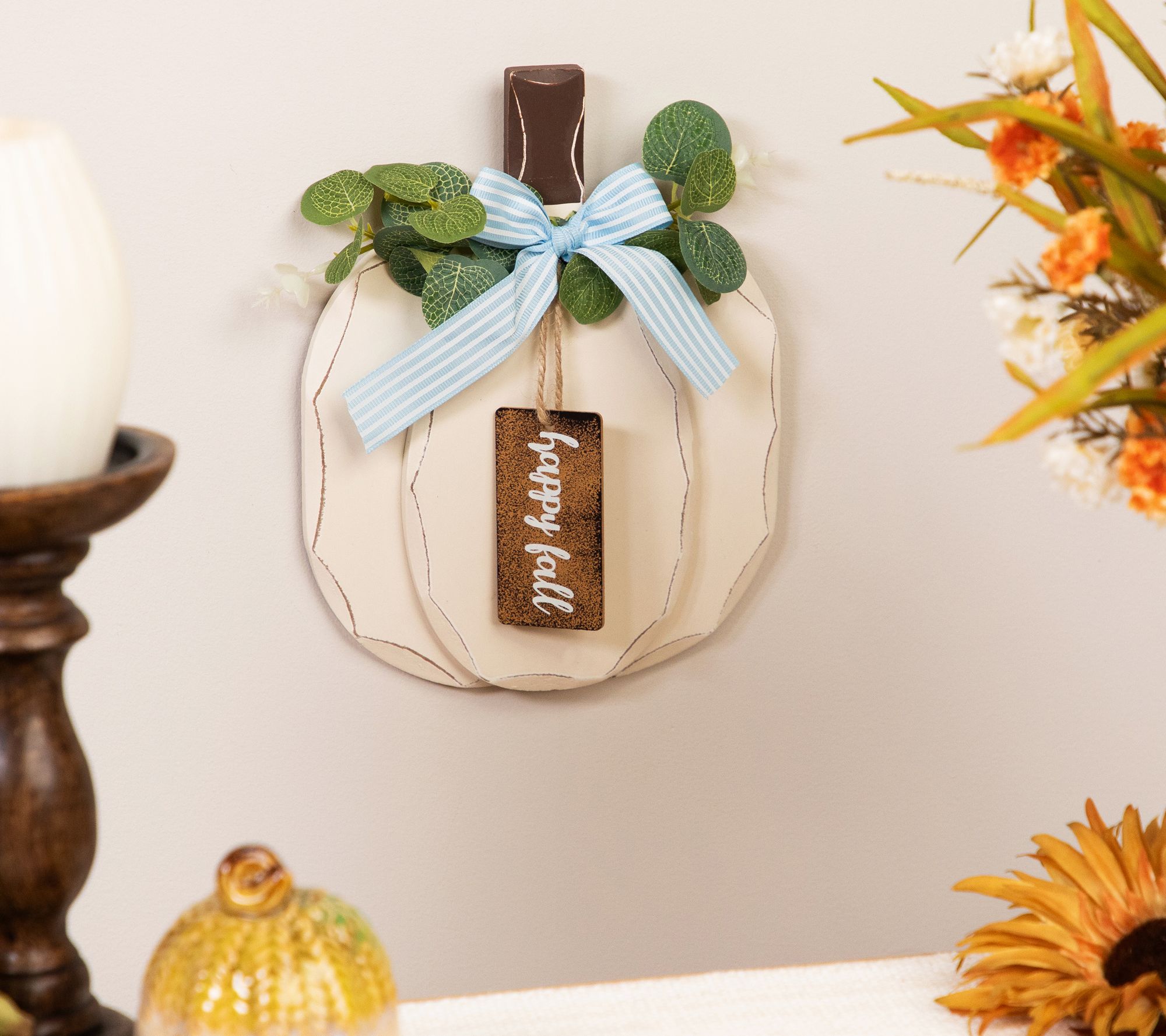 A charming centerpiece or accent for your entryway table, this freestanding pumpkin decor welcomes fall in rustic style. From Northlight.