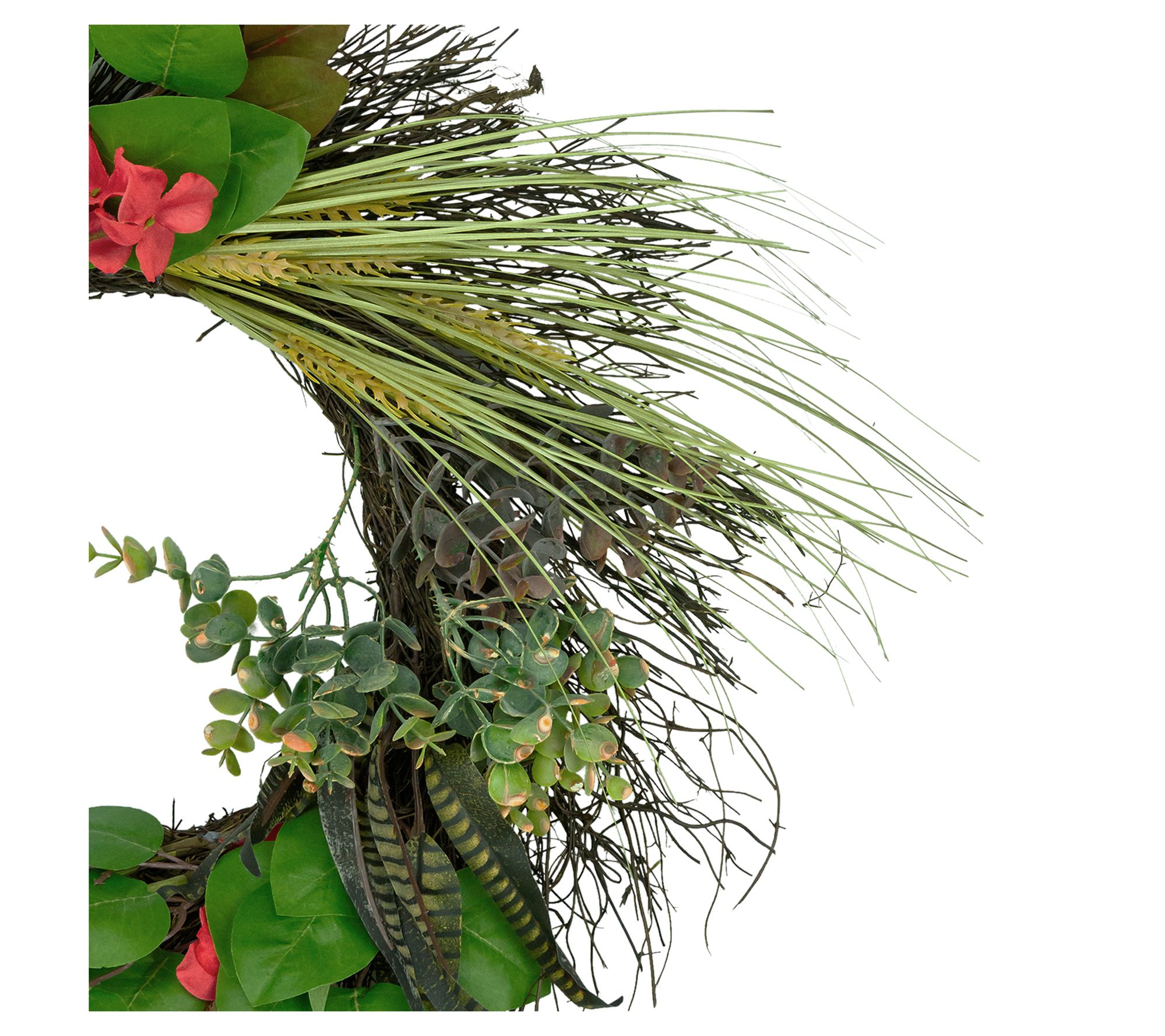 Welcome guests with a burst of seasonal charm by displaying this eucalyptus wheat and twig artificial wreath on your front door or above your mantel. Sprigs of lifelike wheat, two-toned eucalyptus, and faux striped feathers bring pops of color and eye-catching texture, instantly brightening your living room, entryway, or office. From Northlight.