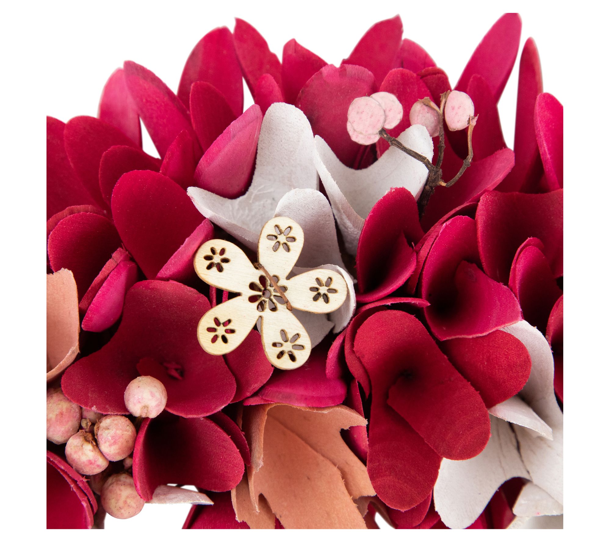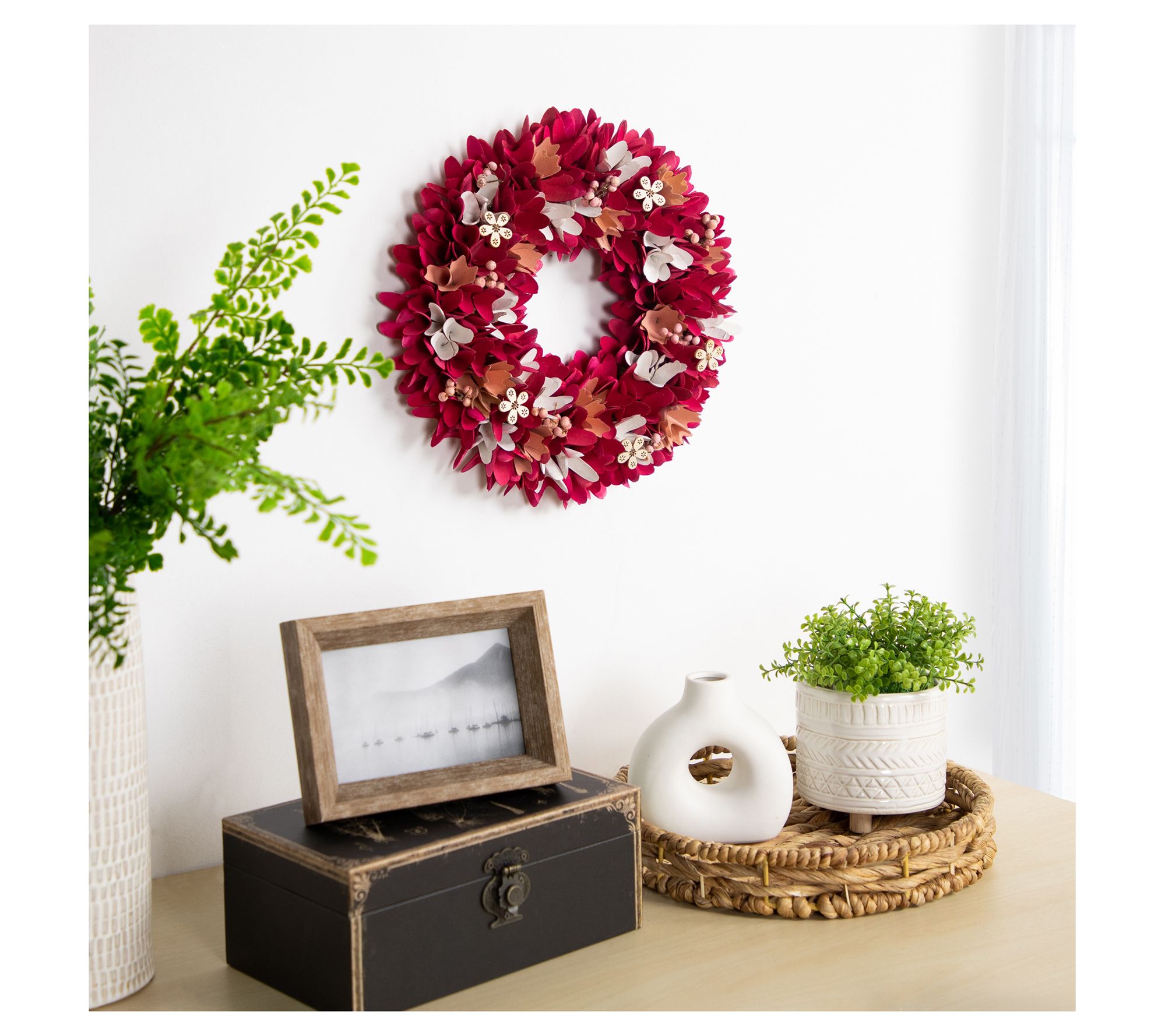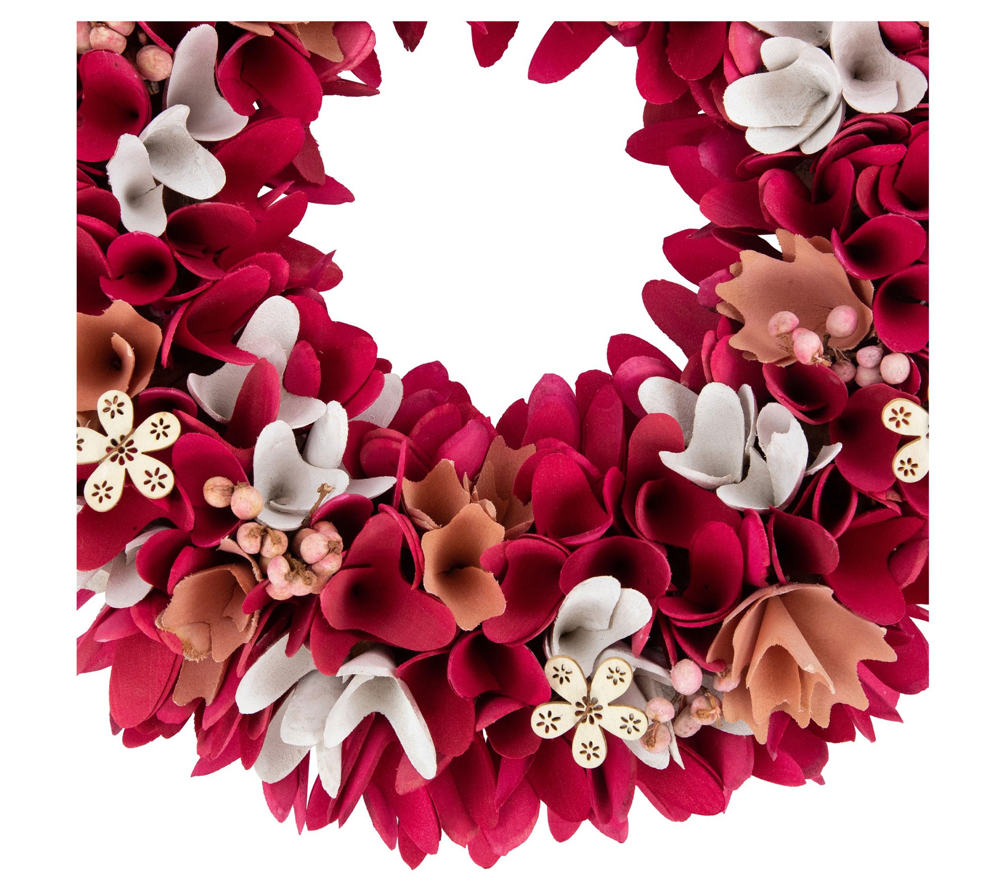 Bring the beauty of spring indoors with this vibrant floral wreath! Featuring a stunning blend of fuchsia, soft pink, and crisp white wooden flowers, accented by tiny wood flowers and pink berries, it's perfect for brightening up your home. Whether you hang it on your front door, above your mantel, or use it as a centerpiece, its flat-back design will ensure it stays snug against any surface. From Northlight.