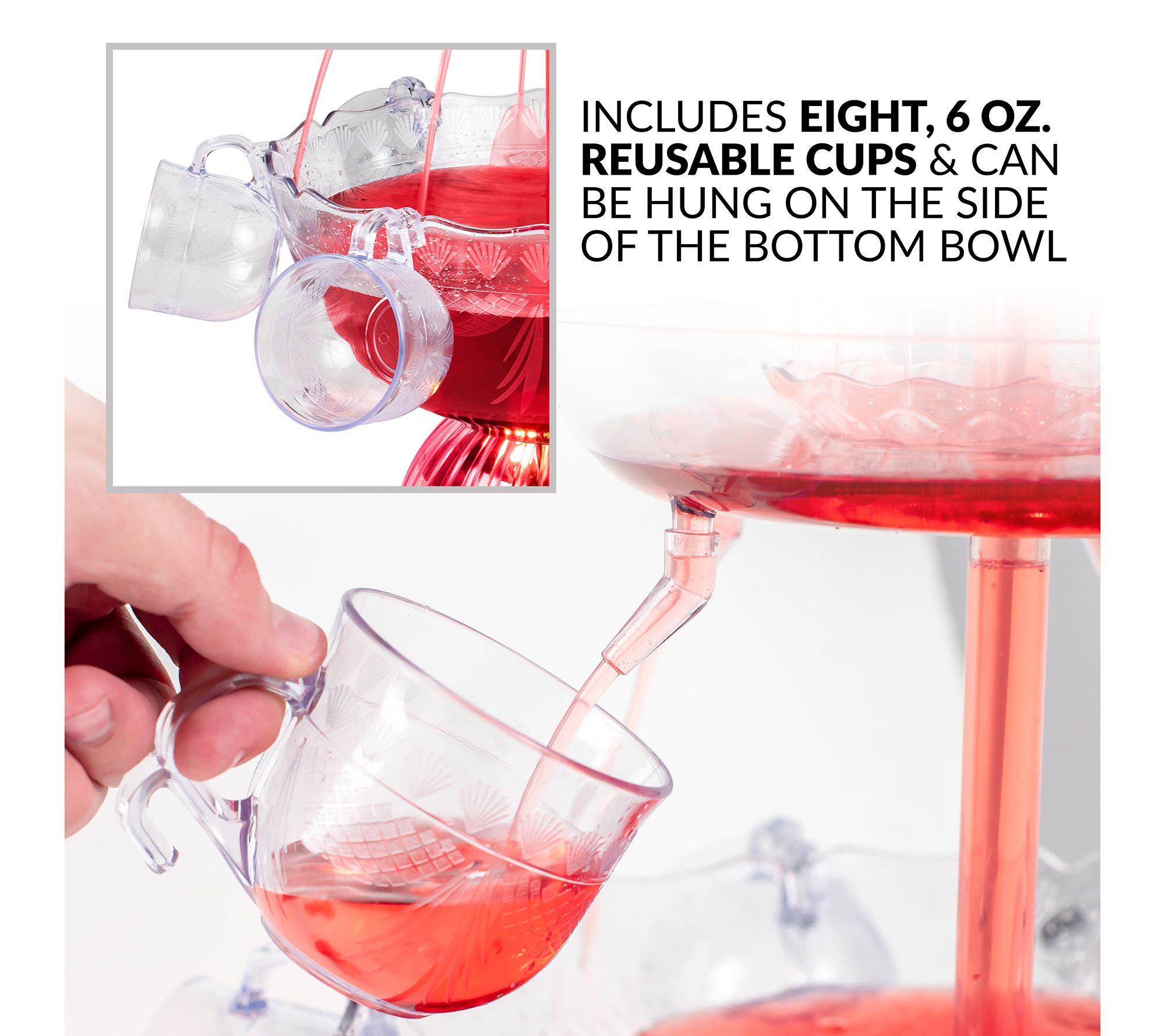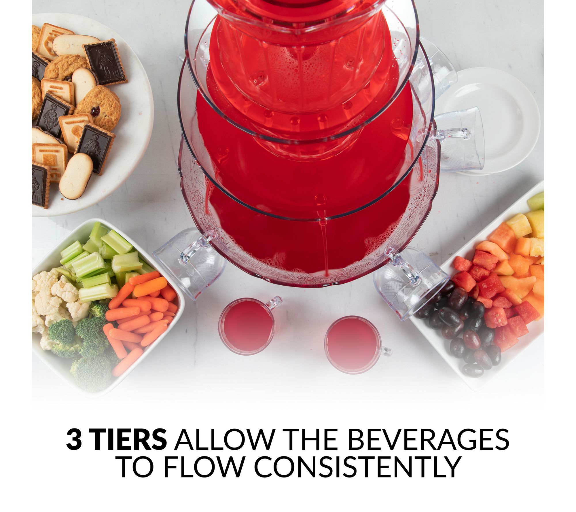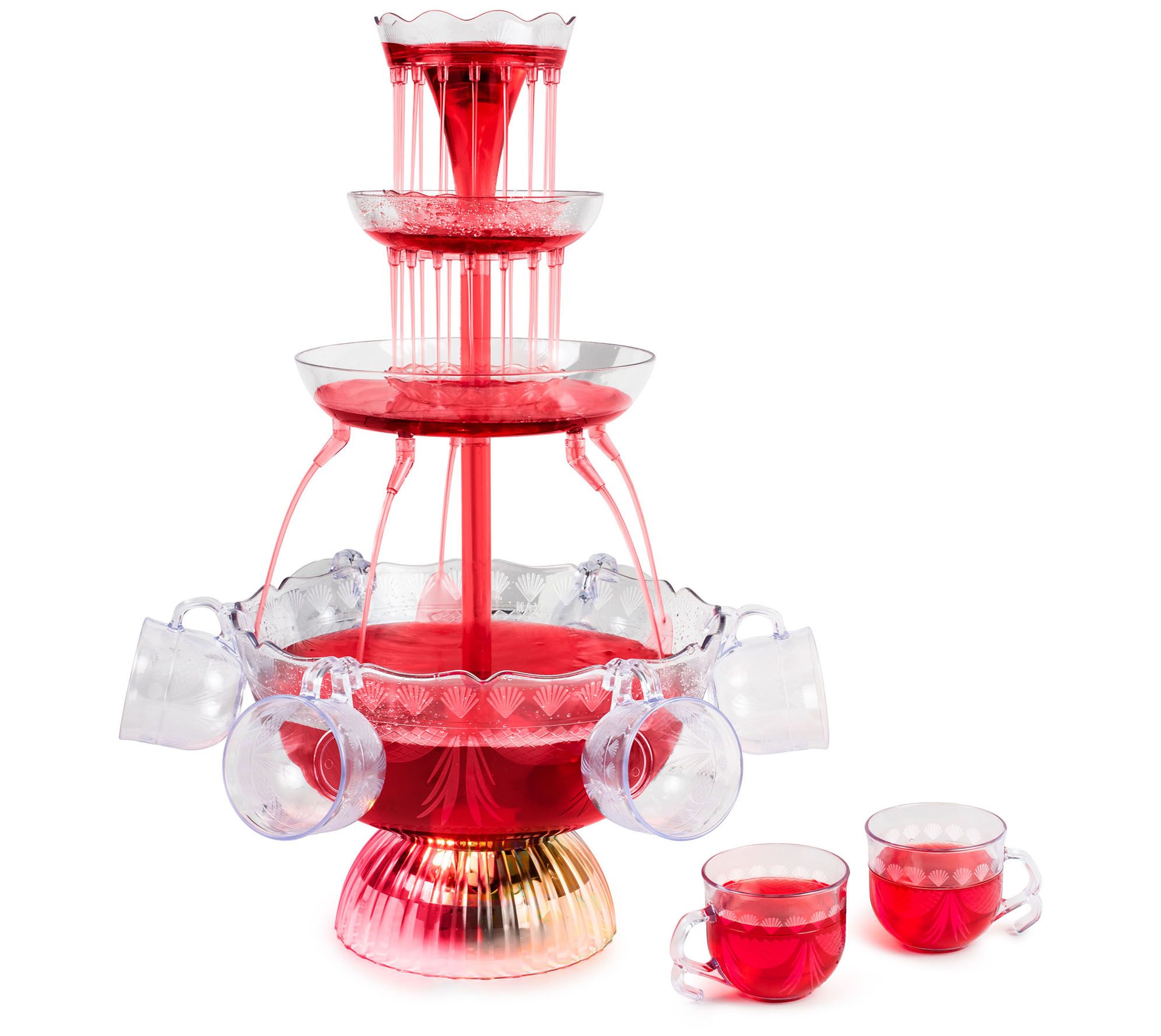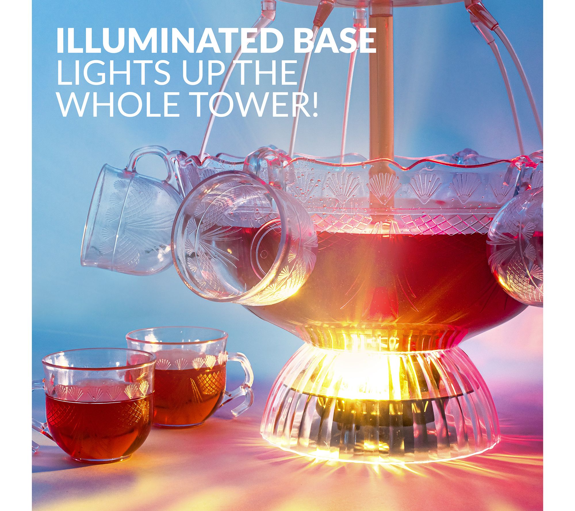 Create a beautifully illuminated centerpiece for your next event with this three-tier, lighted party fountain that holds up to 1.5 gallons of juices, cocktails, champagne, and more. The extension spouts make it easy for guests to serve themselves, and the LED base lights up the cascading beverage for a sparkling flow. Eight beverage cups are included. From Nostalgia.