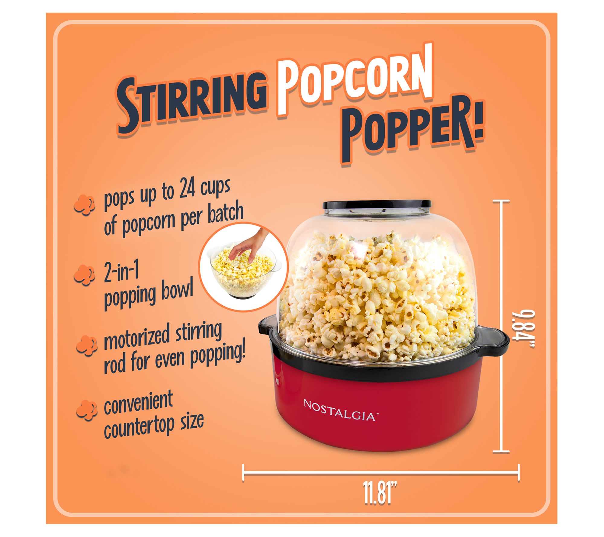 Size up the ultimate movie night with the Nostalgia 6-qt Stainless Steel Stirring Popcorn Popper. Effortlessly make up to 24 cups of delicious hot popcorn for friends and family. Quick-heat technology ensures every kernel pops without the need for preheating. Enjoy your snacks with the included serving bowl, which makes flipping and serving popcorn an easy task. From Nostalgia.