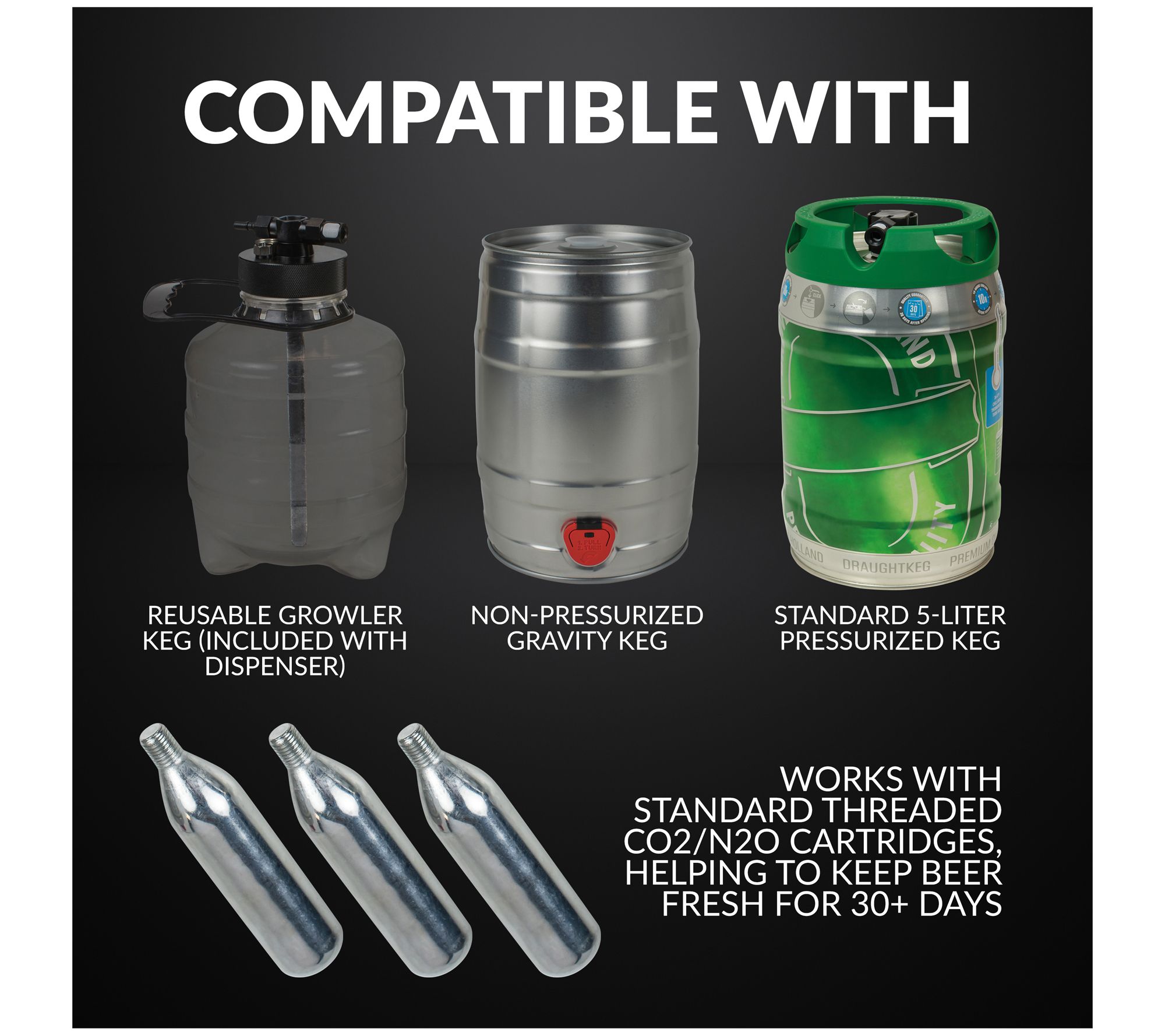 • Includes three 16g CO2 cartridges, 5L growler, drip tray, squeeze bottle cleaning kit, 60" electrical cord