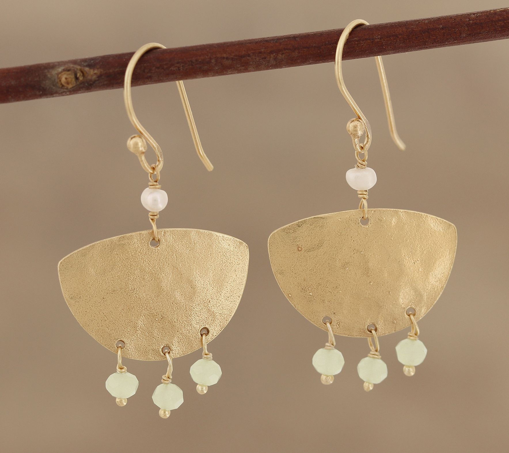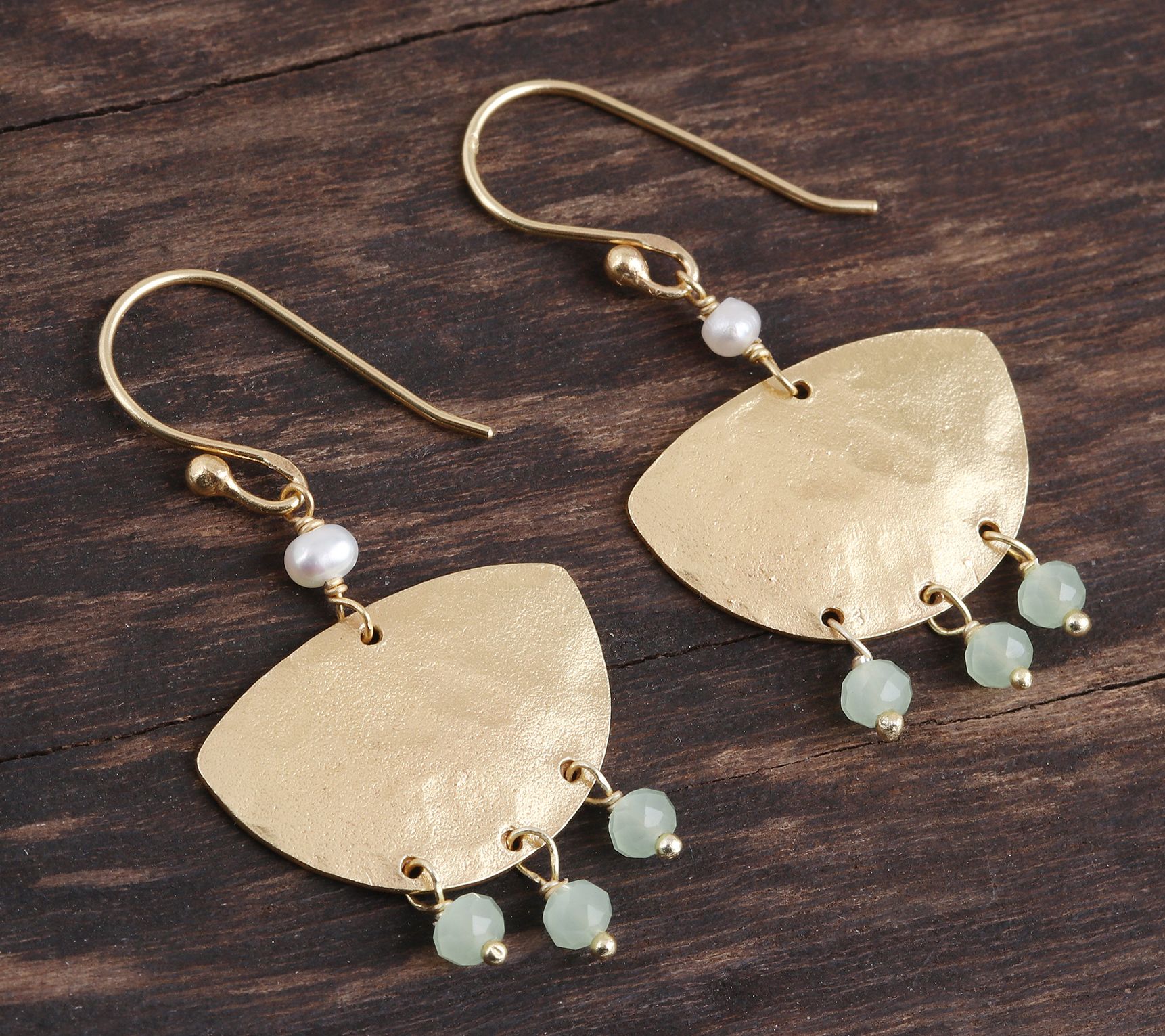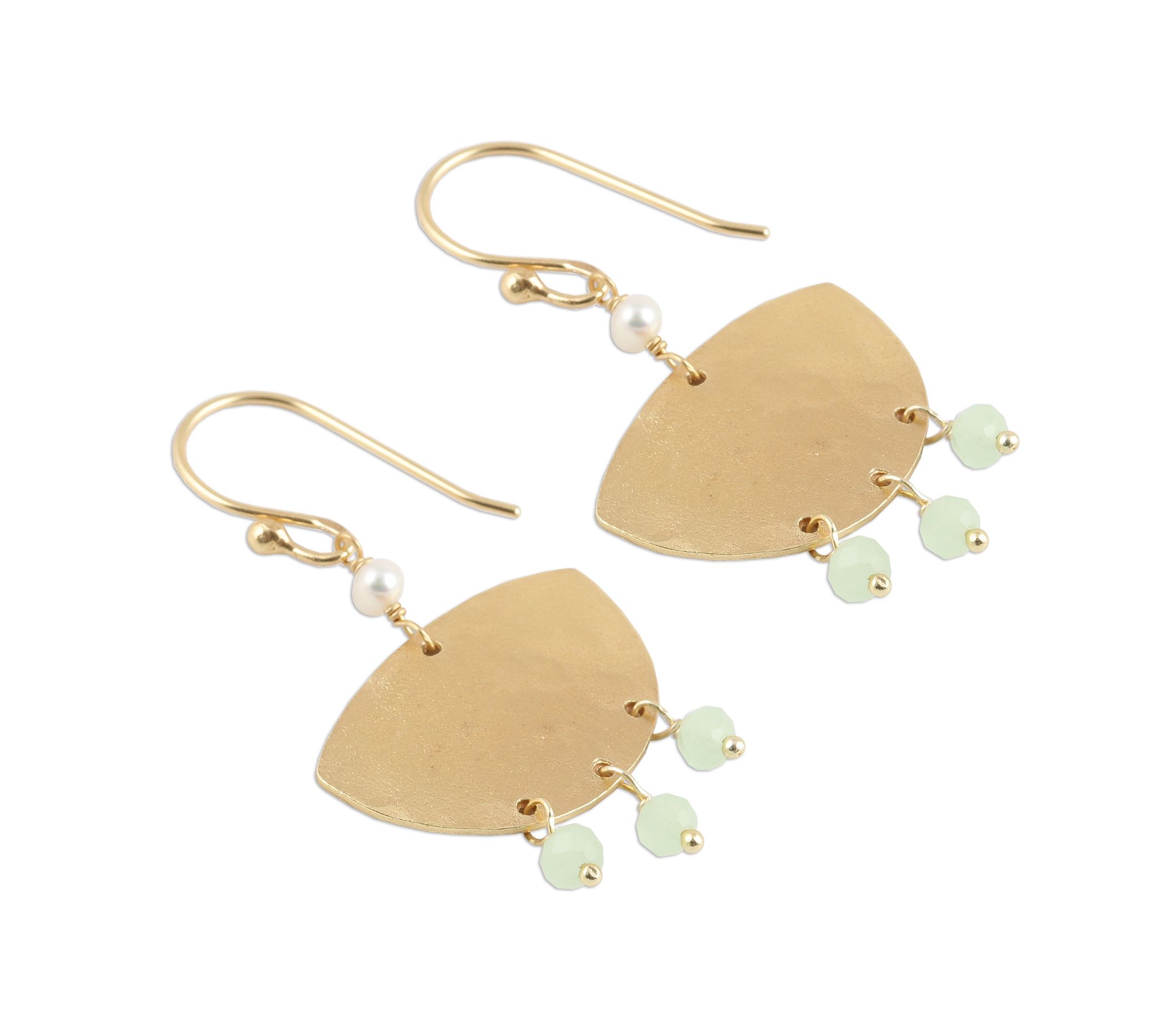 • 3mm cultured freshwater pearls suspended above a 22K gold-plated sterling silver boat shape, with three chalcedony gem accents below