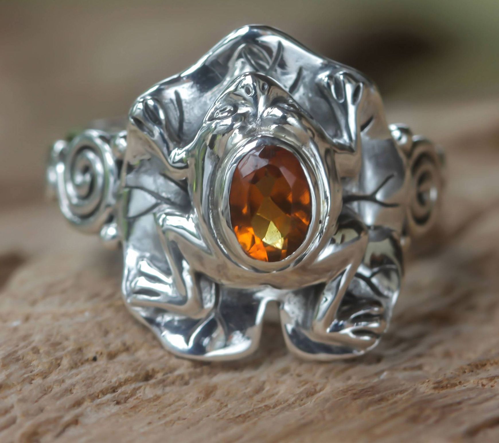 Bezel-set, oval citrine gemstone center; frog on lily pad design; swirl band design; oxidized