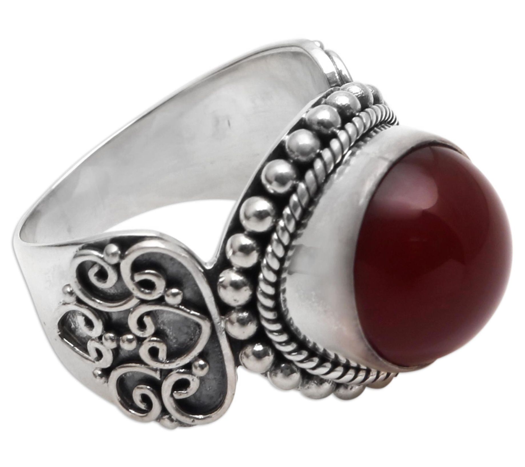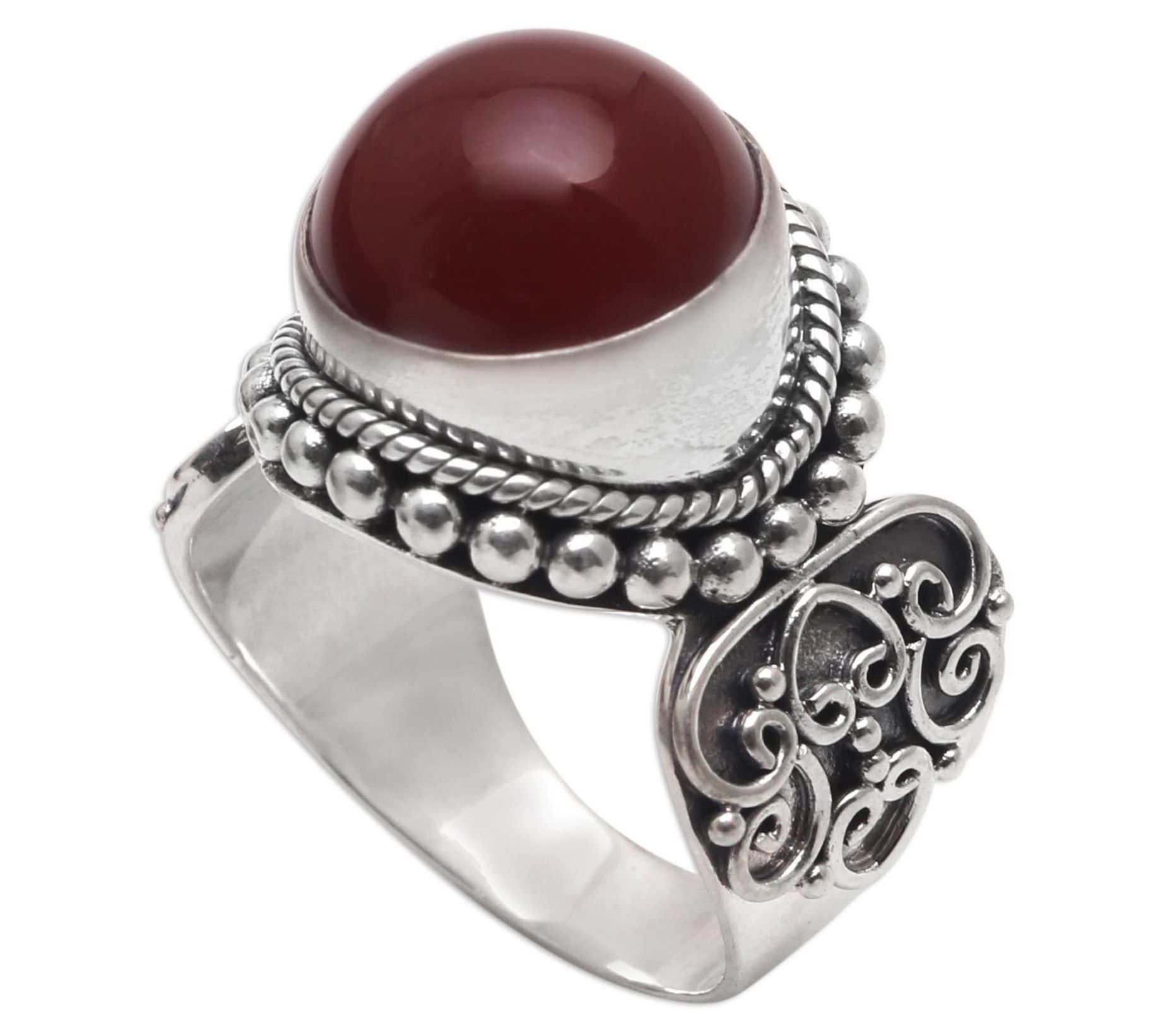Bezel-set, round carnelian gemstone; scroll design on tapered band with beaded and twisted outline; oxidized finish