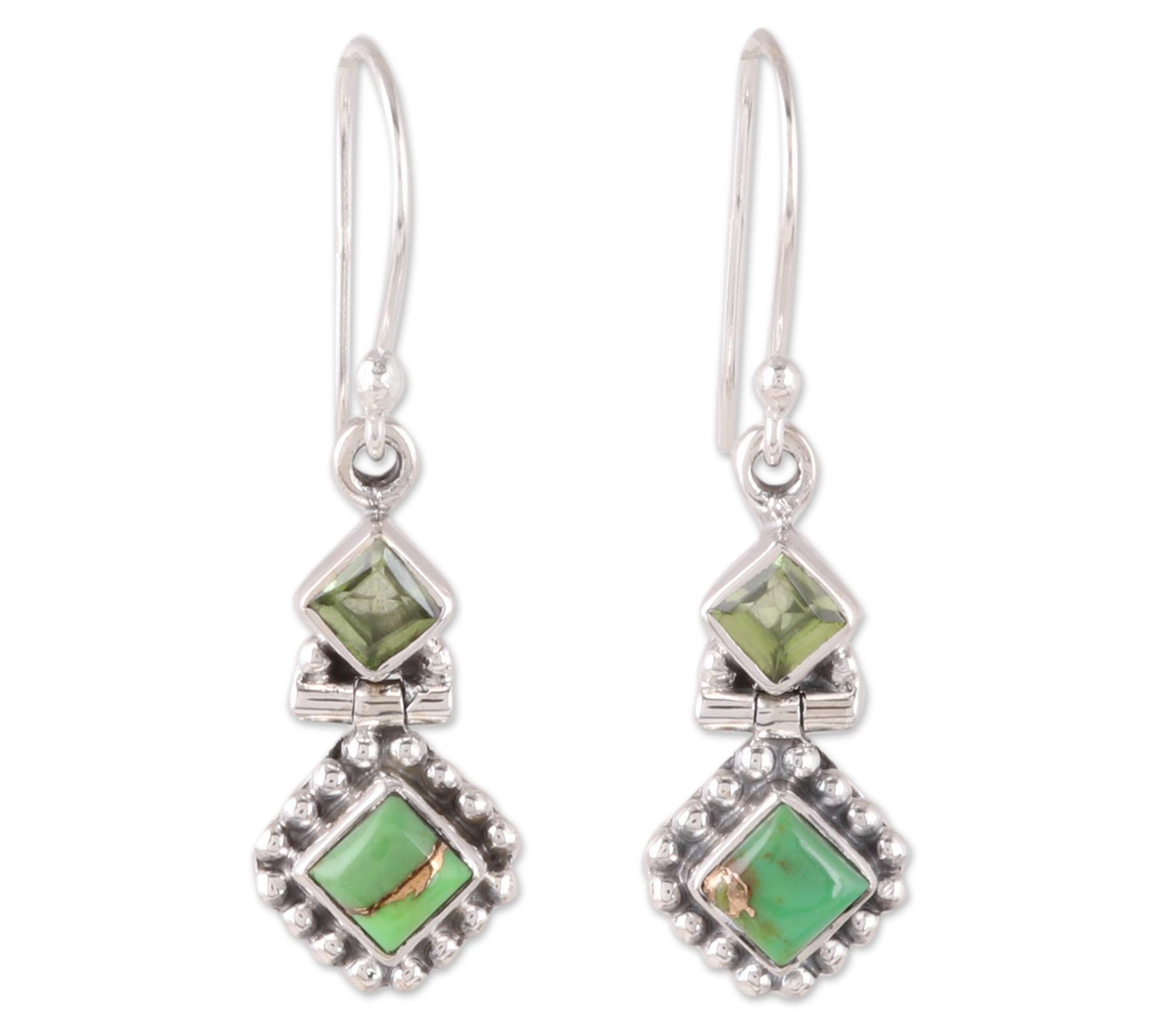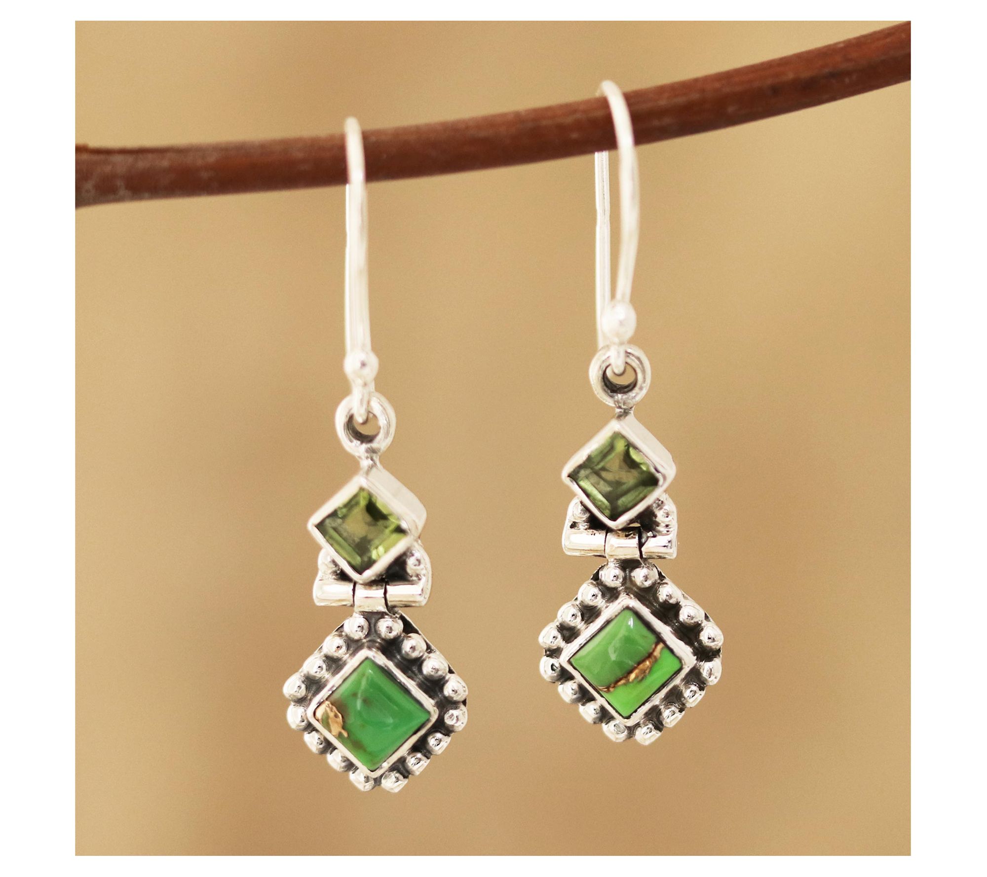 You'll be gorgeous in green when you slip on these sterling silver dangle earrings accented with faceted peridot stones and verdant composite turquoise cabochons. From Novica.