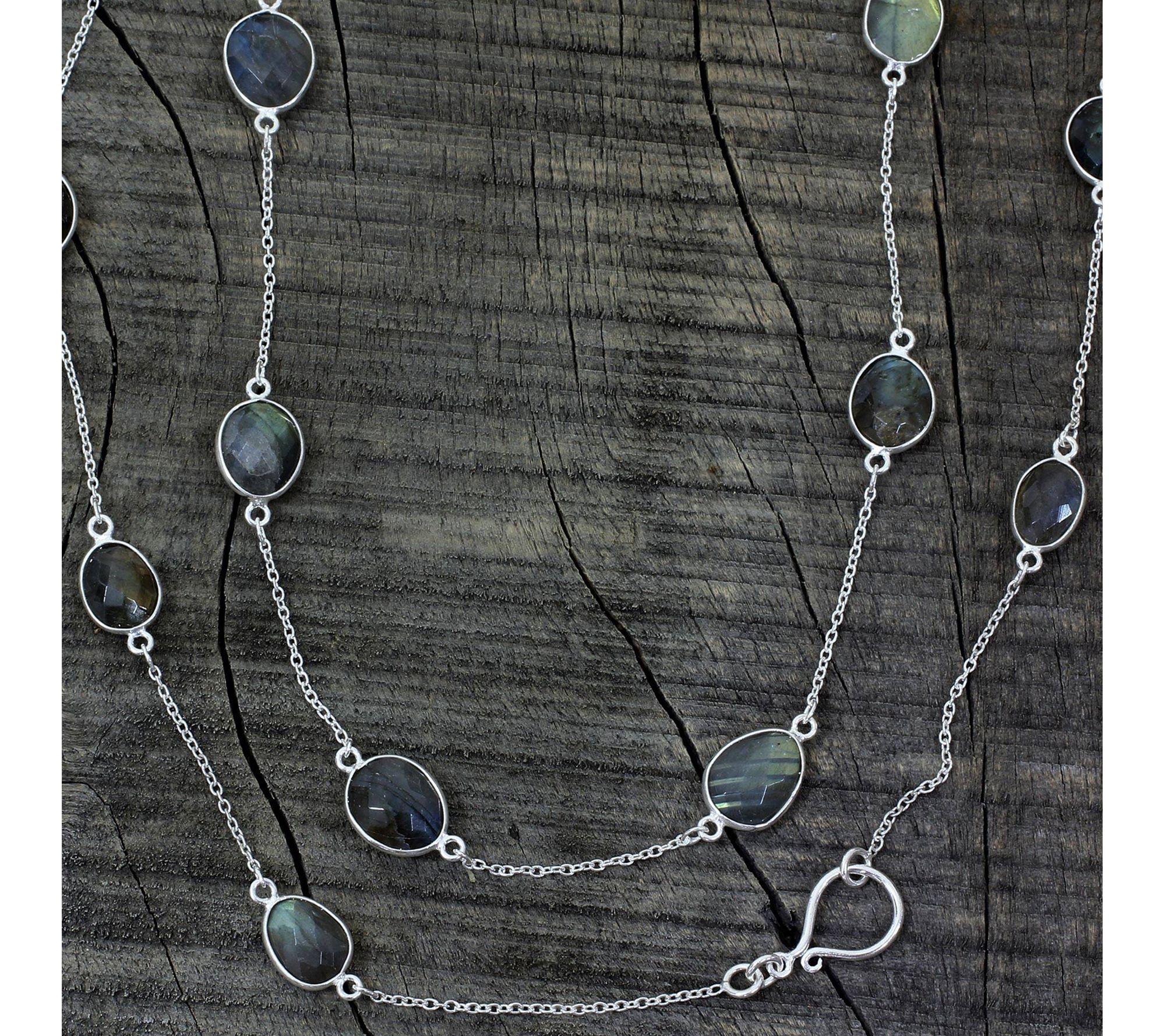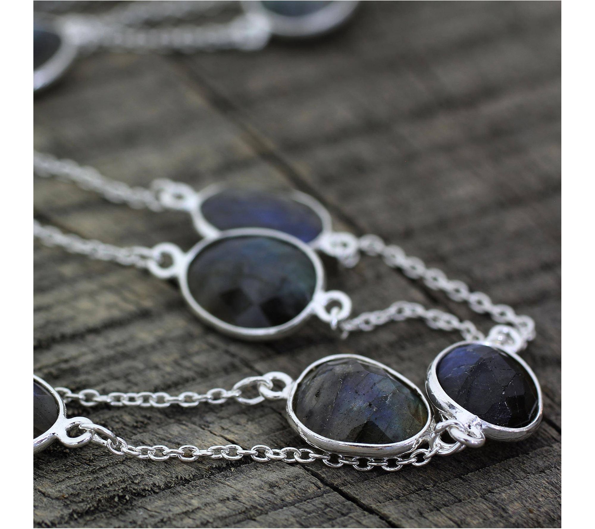 Bezel-set, oval labradorite gemstone stations separated by rolo link chain