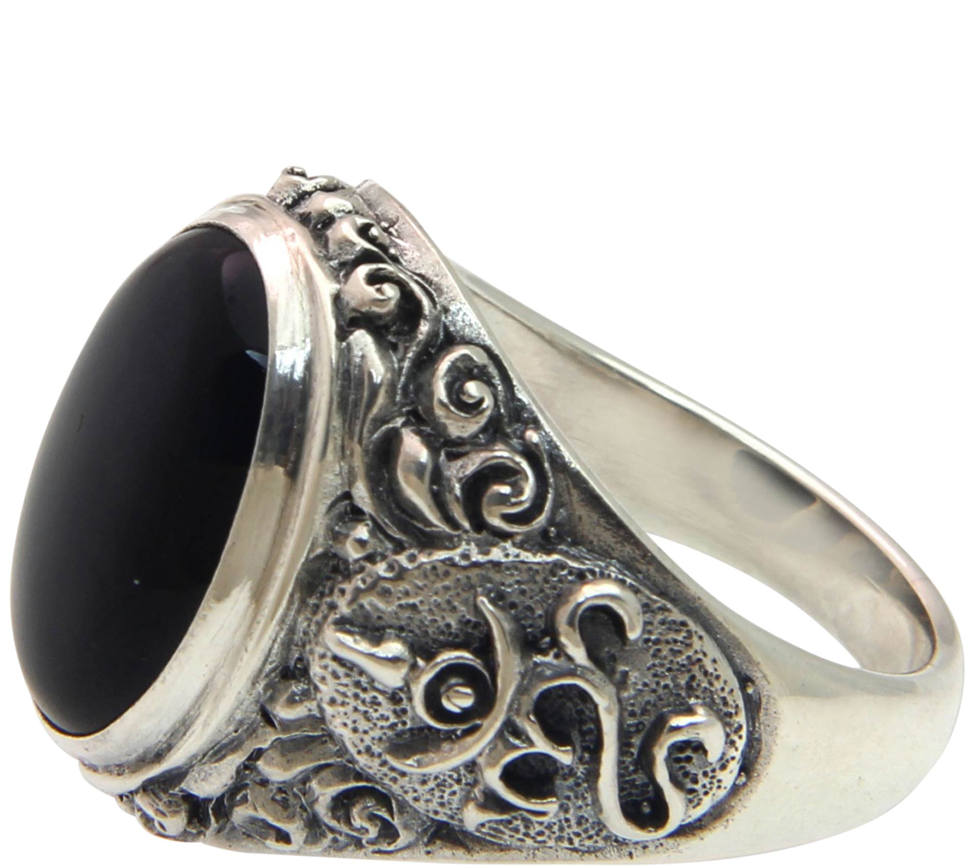 Bezel-set oval onyx with scroll design on band; oxidized finish