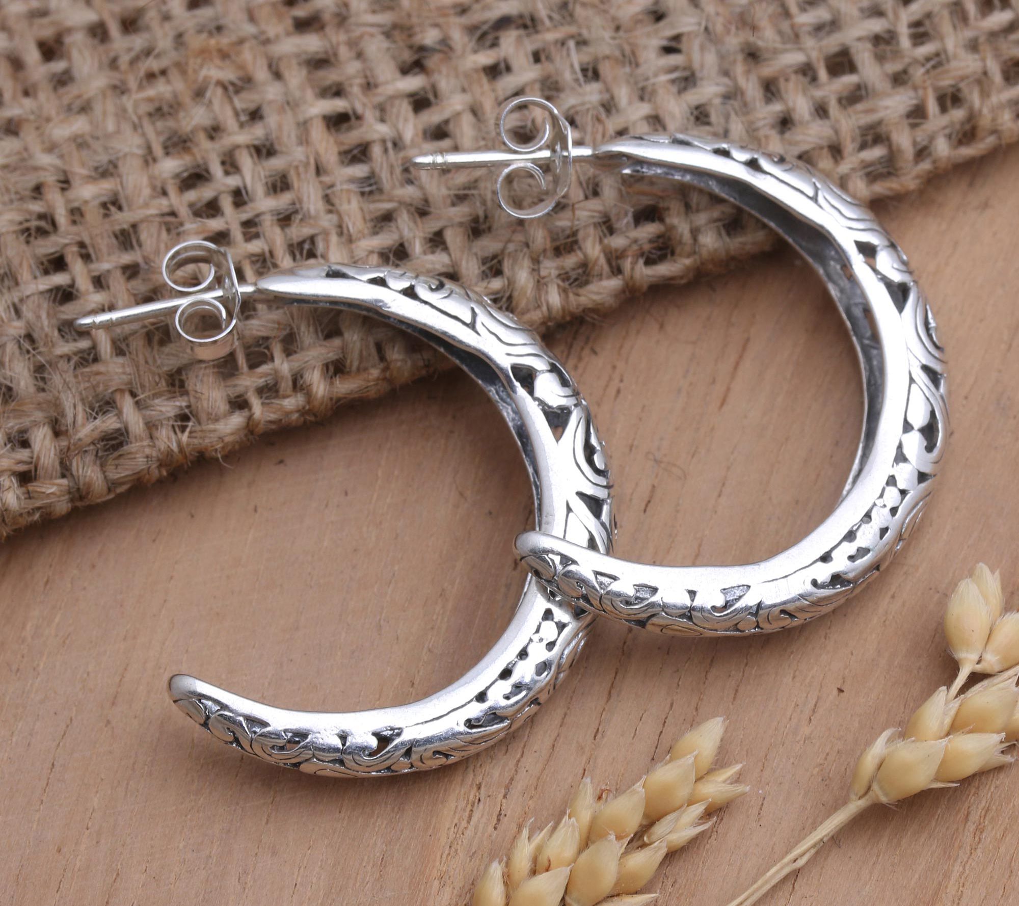 Understated enough for everyday wear, these elegant half-hoop earrings showcase curling designs in a combination finish. From Novica.