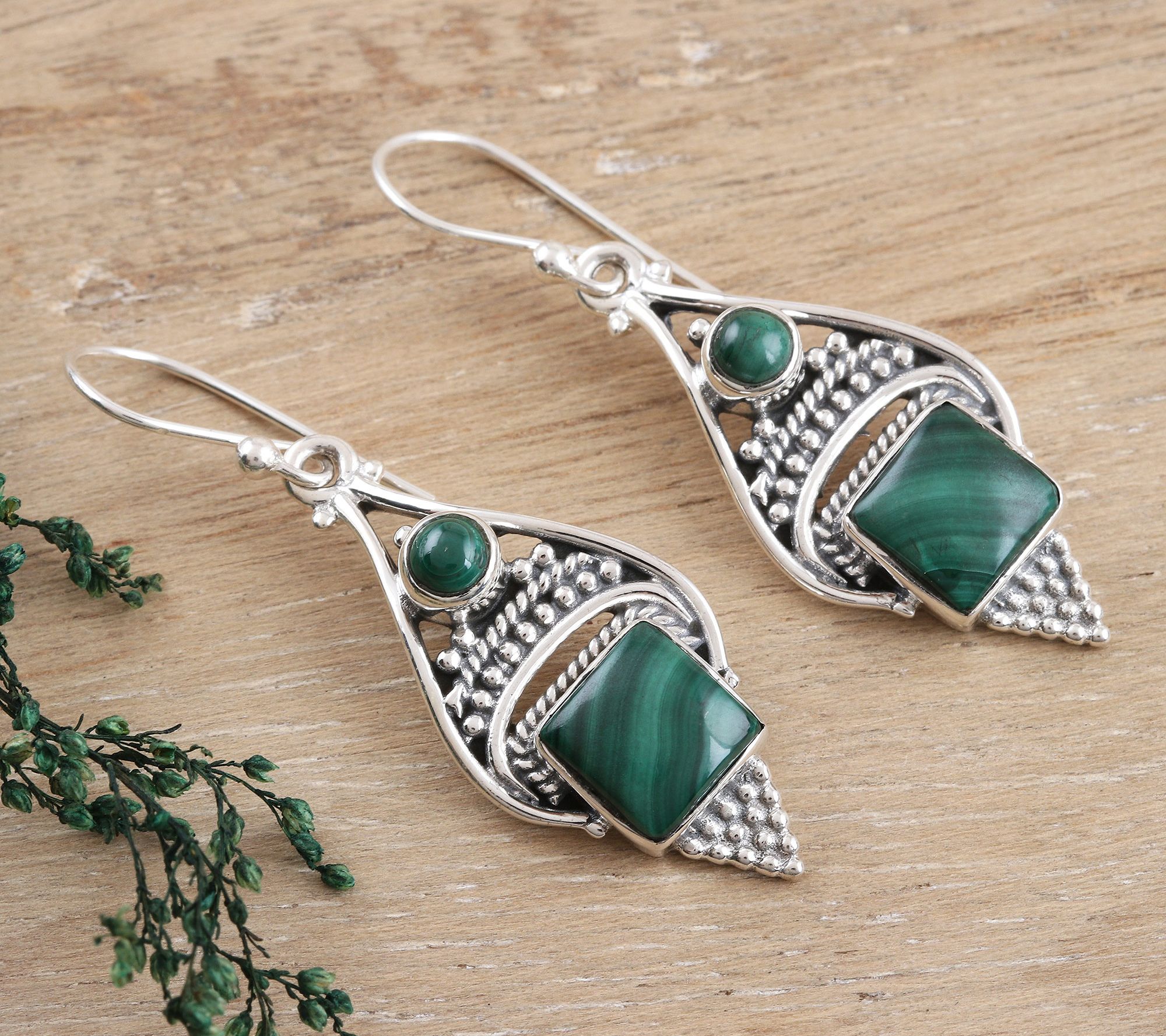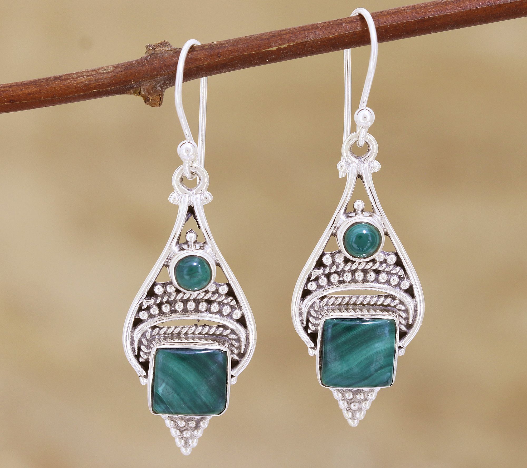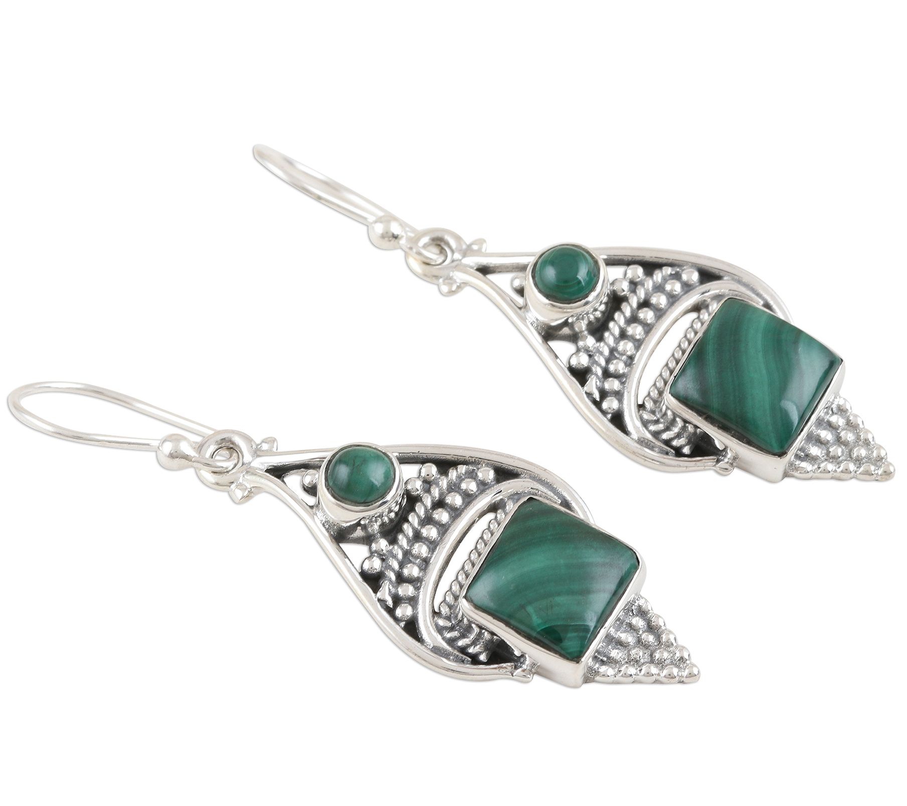 • Small, round malachite cabochons accent an intricate silver dangle with square, bezel-set malachite cabochons at center