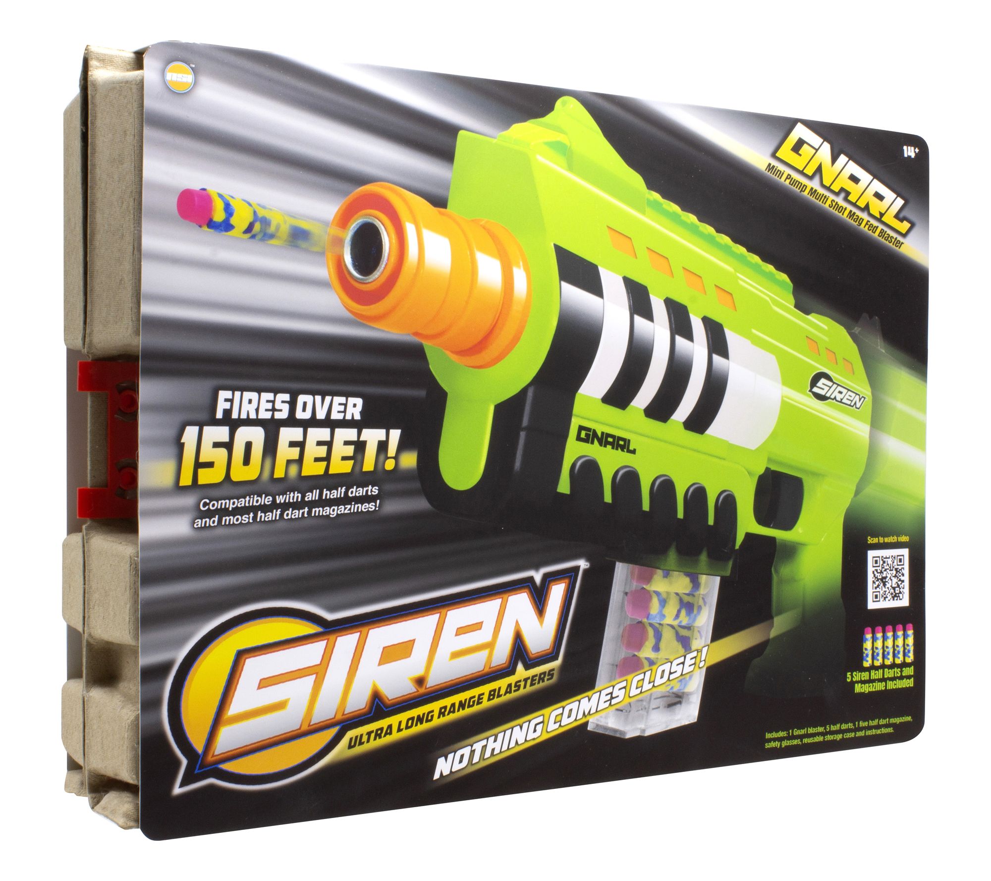 • Includes Siren Gnarl blaster, 5 half darts, half-dart magazine, safety glasses, and reusable storage case