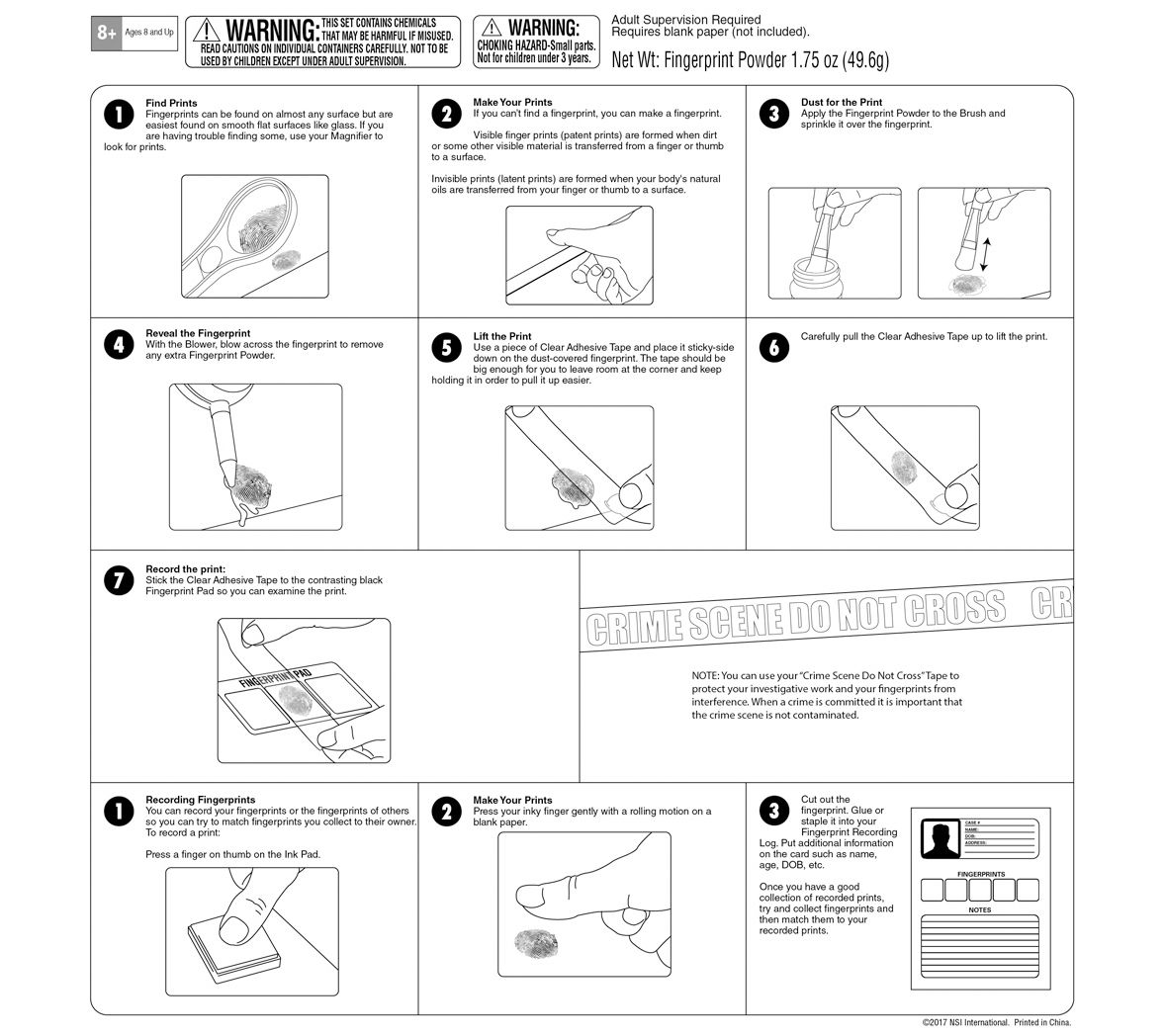 • Includes bottle fingerprint powder, stamp pad, magnifier, clear adhesive tape, blower, fingerprint pad, brush, crime scene "Do Not Cross" tape, fingerprint recording log, and 23" x 17" color poster