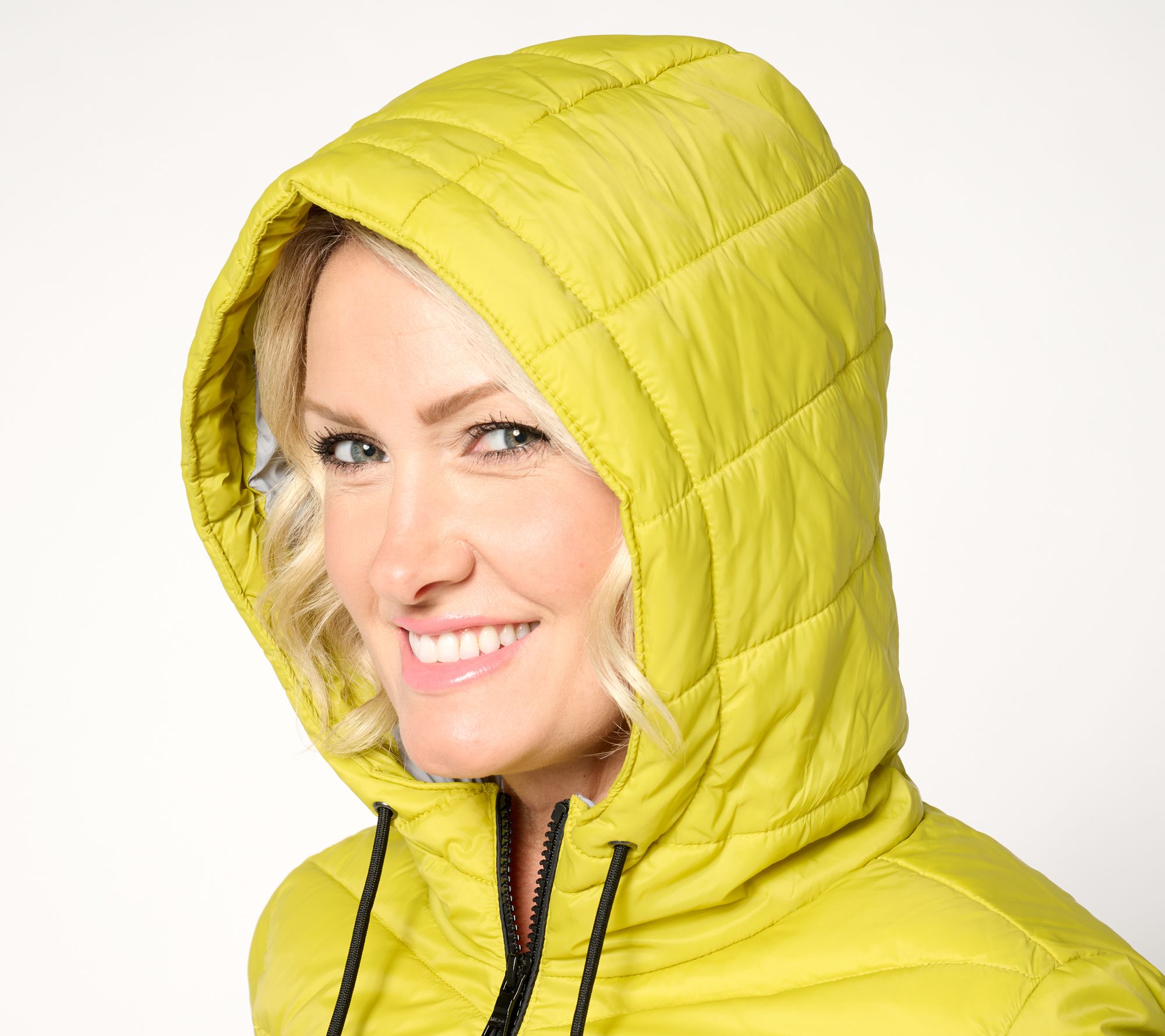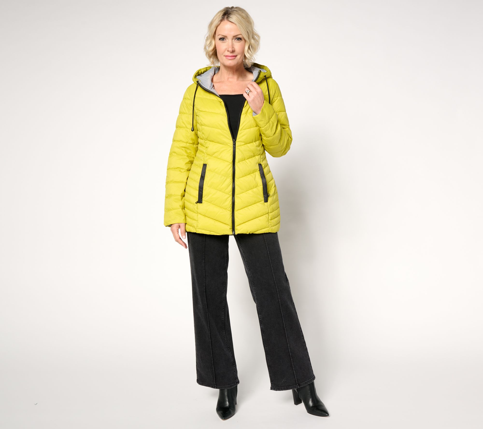 Features: chevron quilted design, contrast color lining, fixed adjustable hood with drawcord, narrow quilted side panels, pockets, drawcords at hood