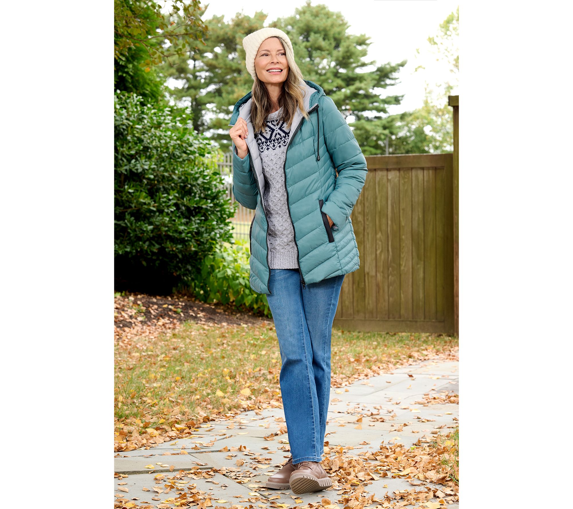First frost? Time to reach for more than a sweater. The Nuage chevron quilted puffer coat is our first choice when the weather turns wicked. It's warm yet deliciously lightweight, has an attached hood, and features narrow quilted panels on the sides for a visually flattering effect (and who doesn't love that?). From Nuage.